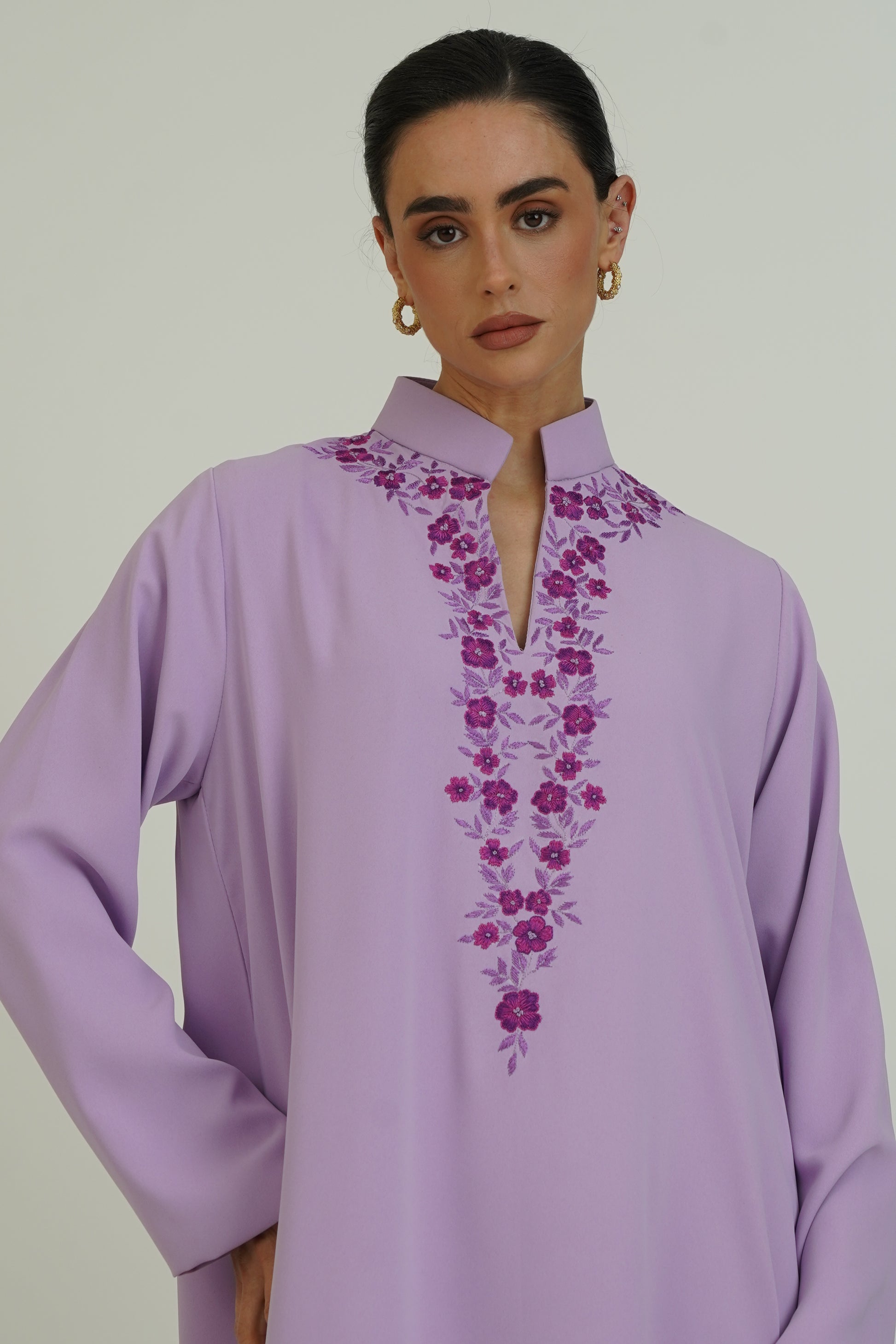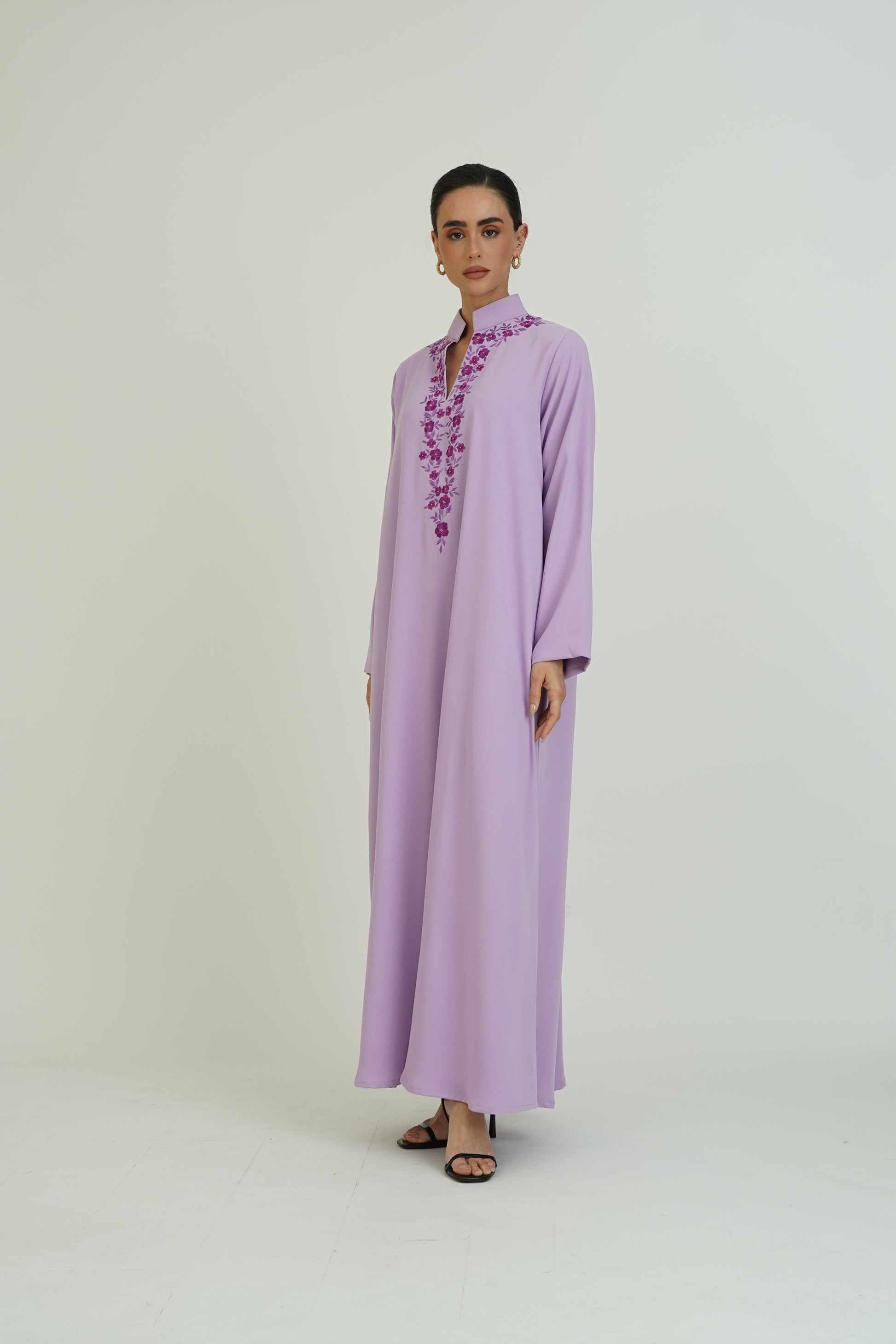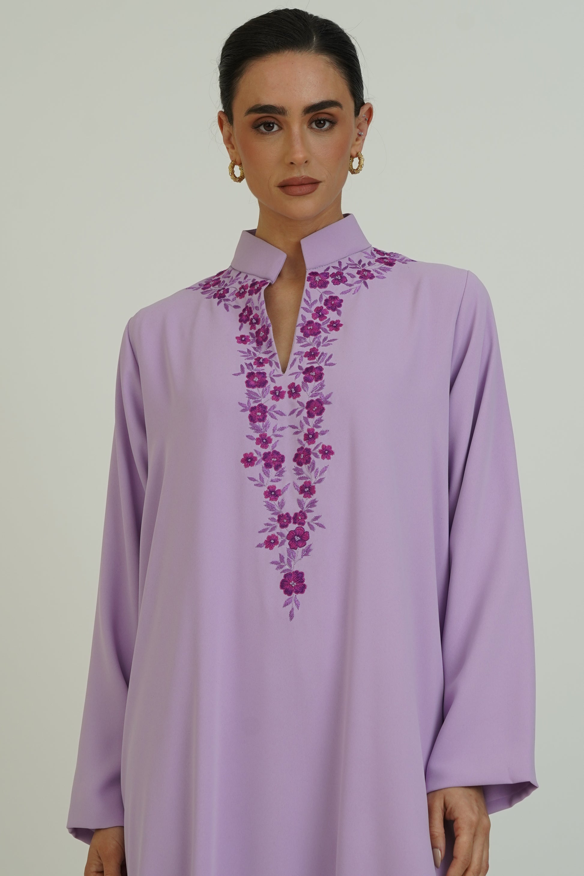Kaftan with an elegant design, adorned with floral embroidery around the neckline and along the front.