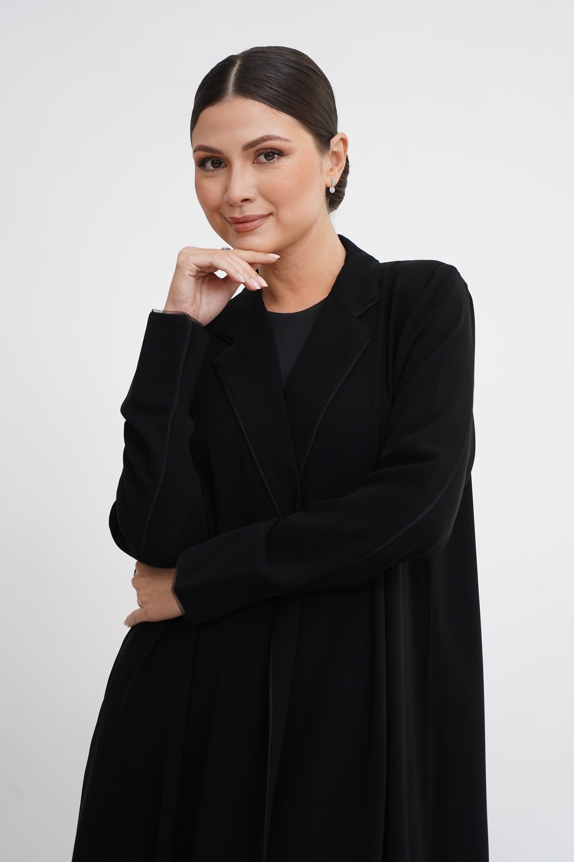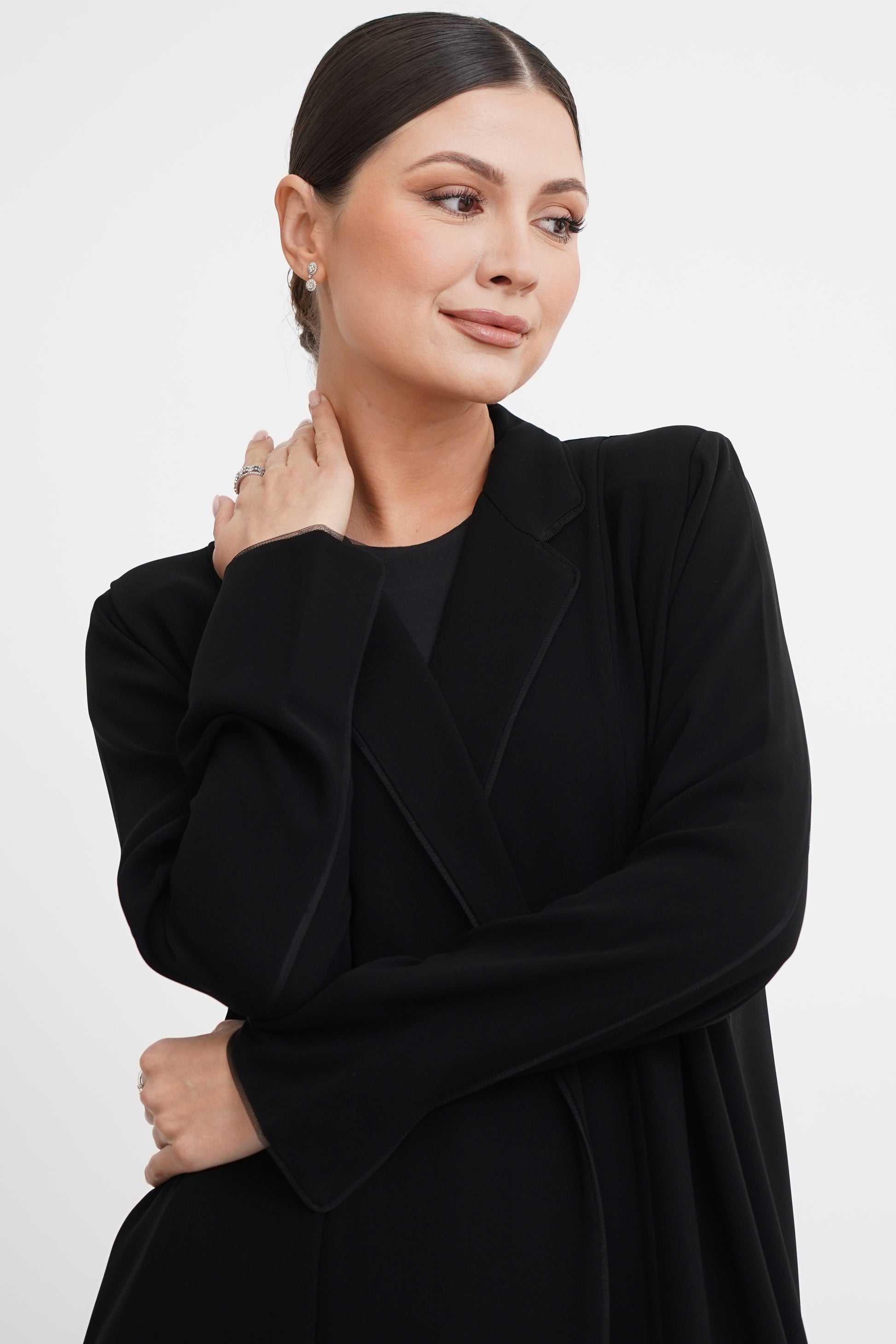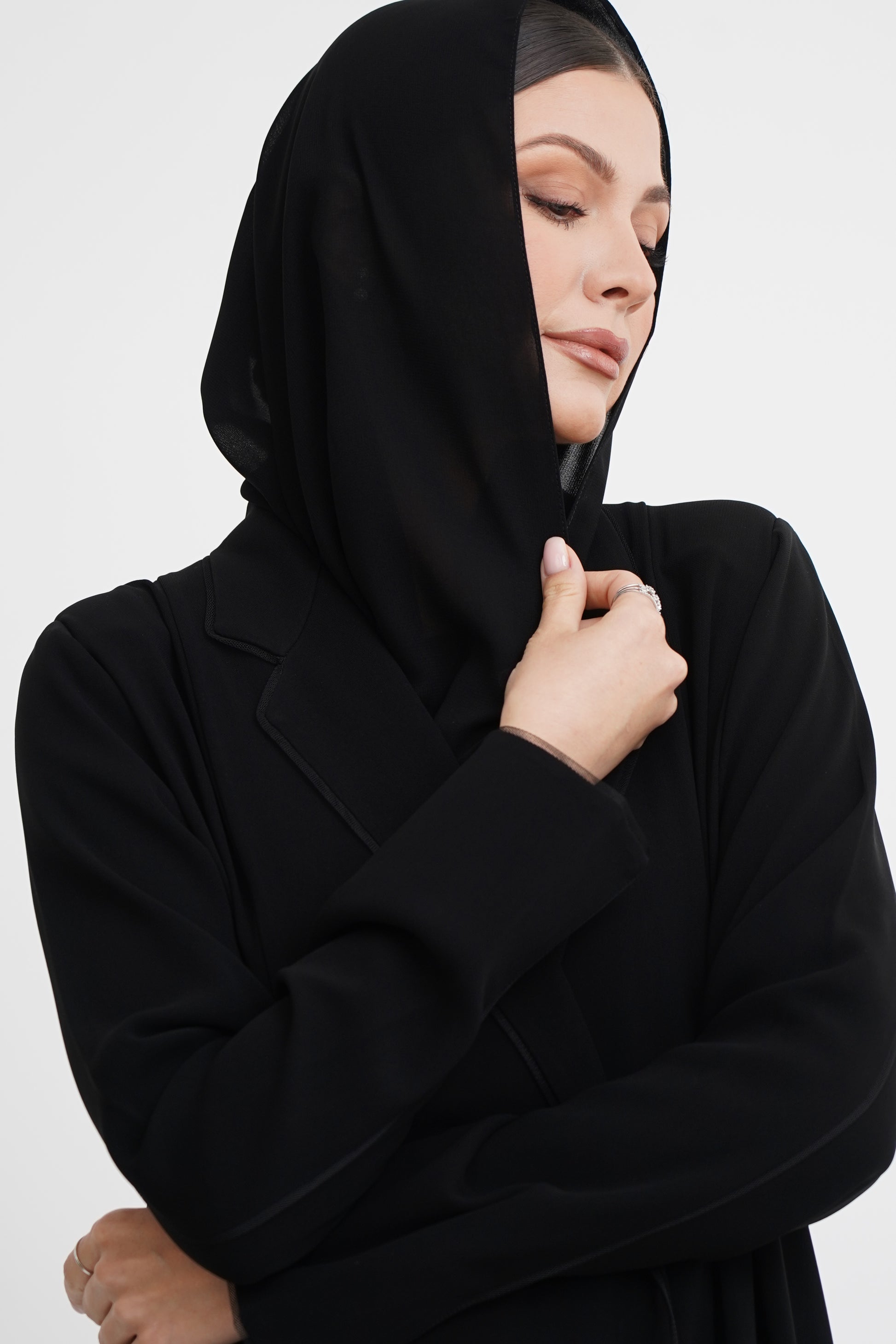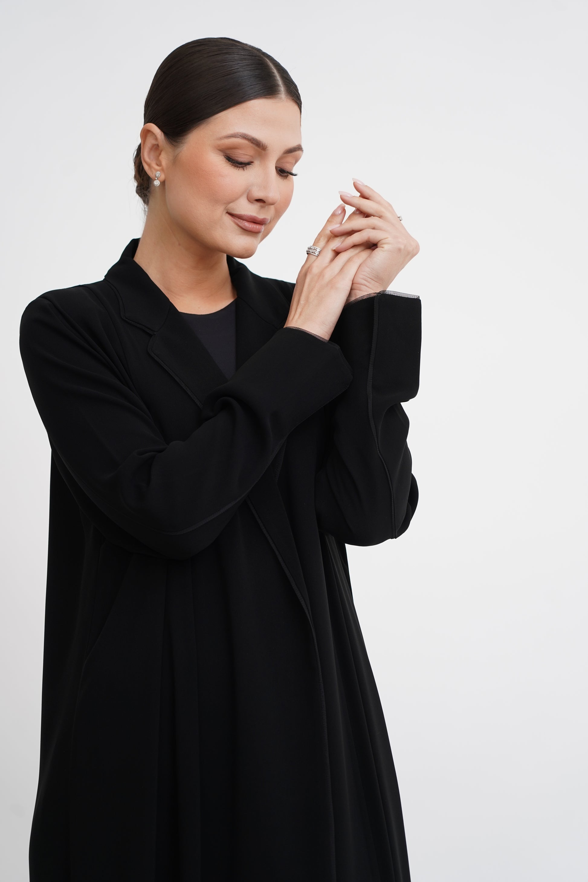 Abaya with a jacket-style cut, crafted from soft crepe fabric and adorned with delicate tulle along the full front edges and sleeves, combining simplicity with elegance.
