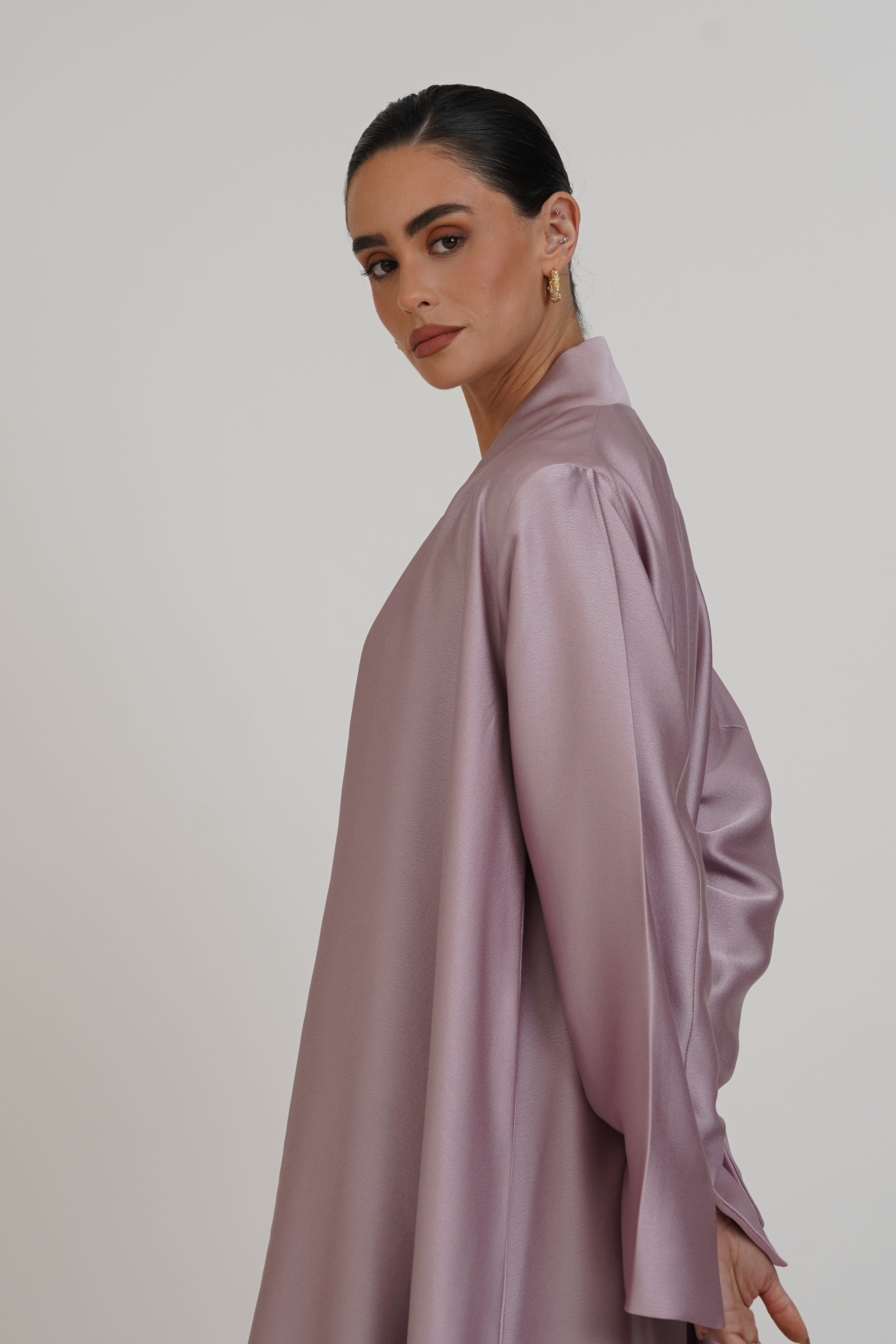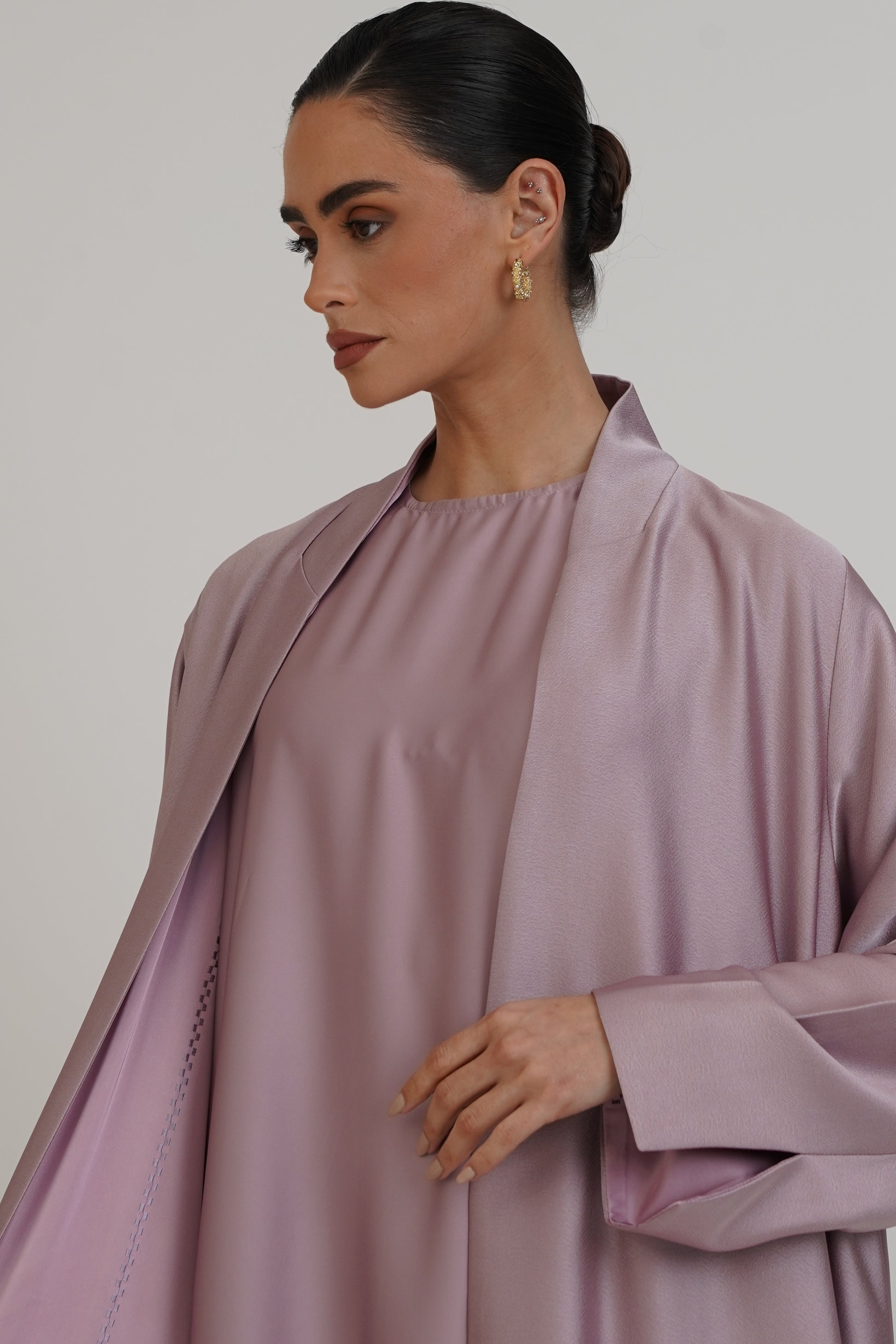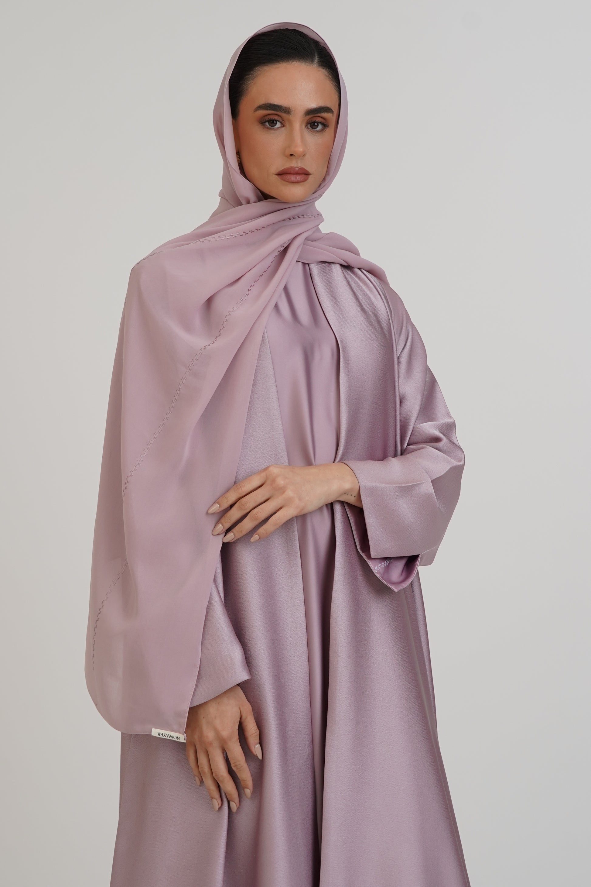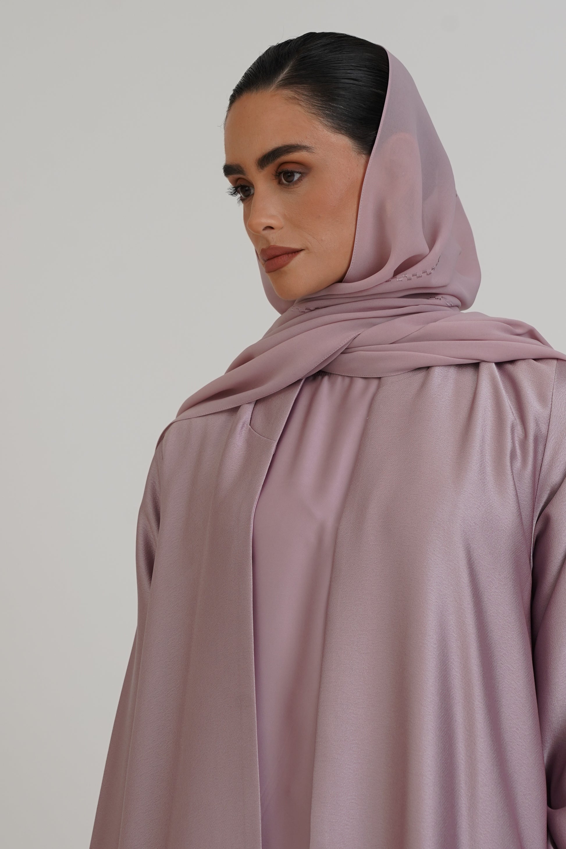 Double-face abaya with an elegant design, featuring delicate inner embroidery and a fully embroidered sheila for a luxurious finish.