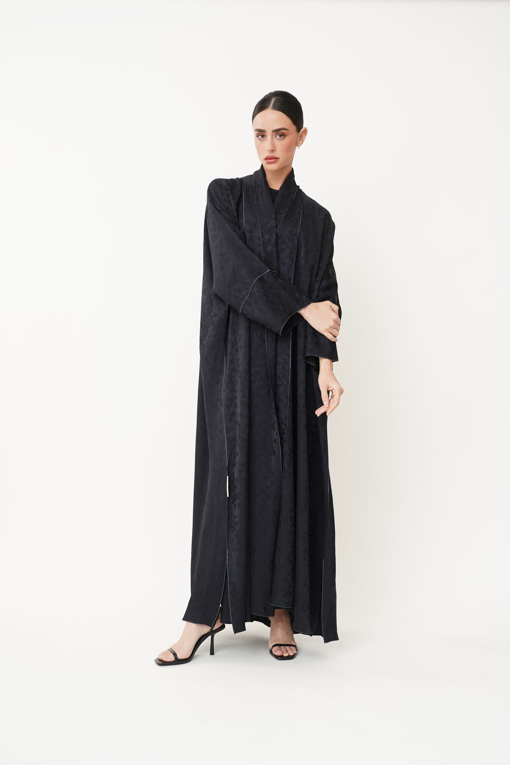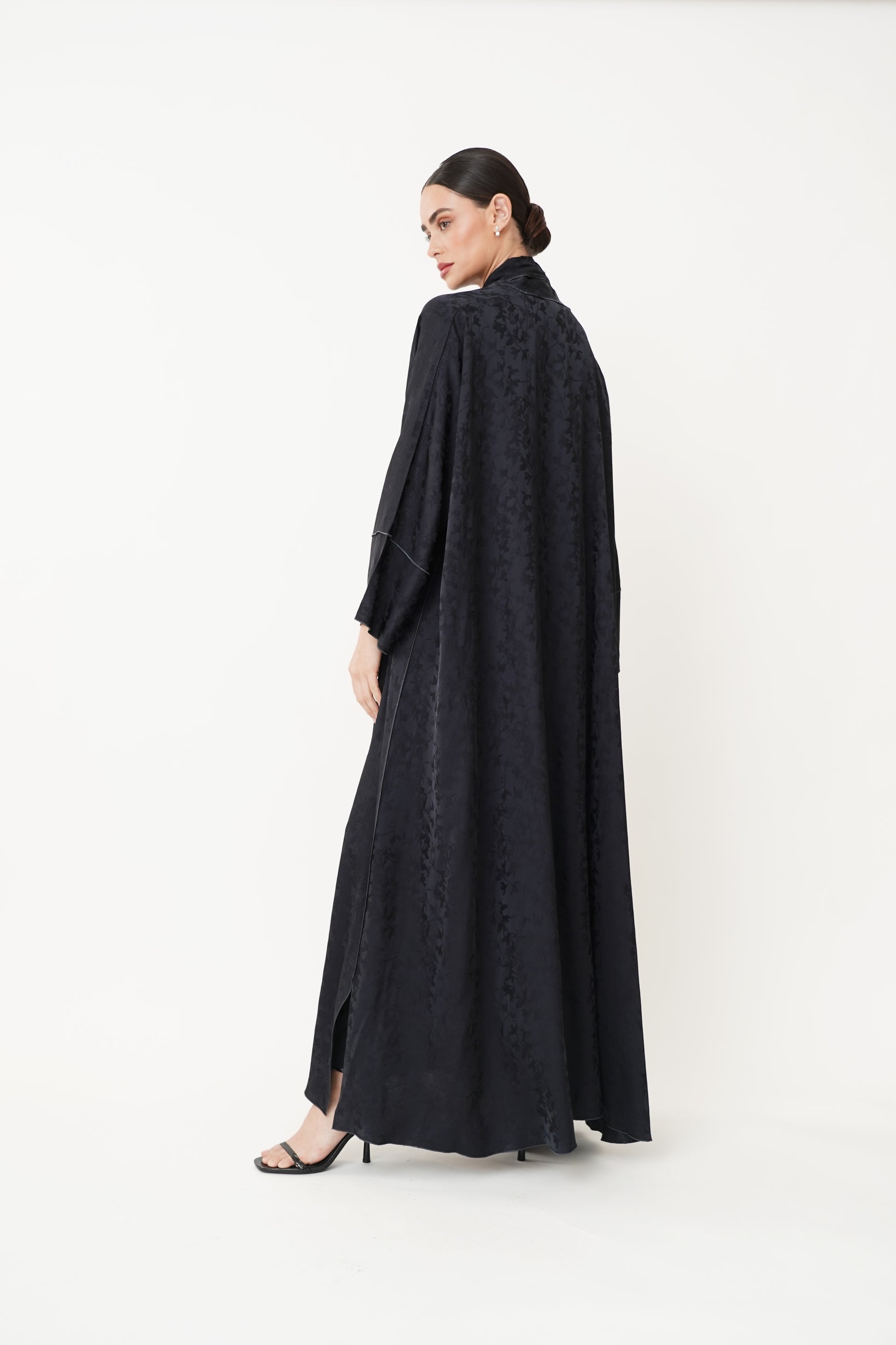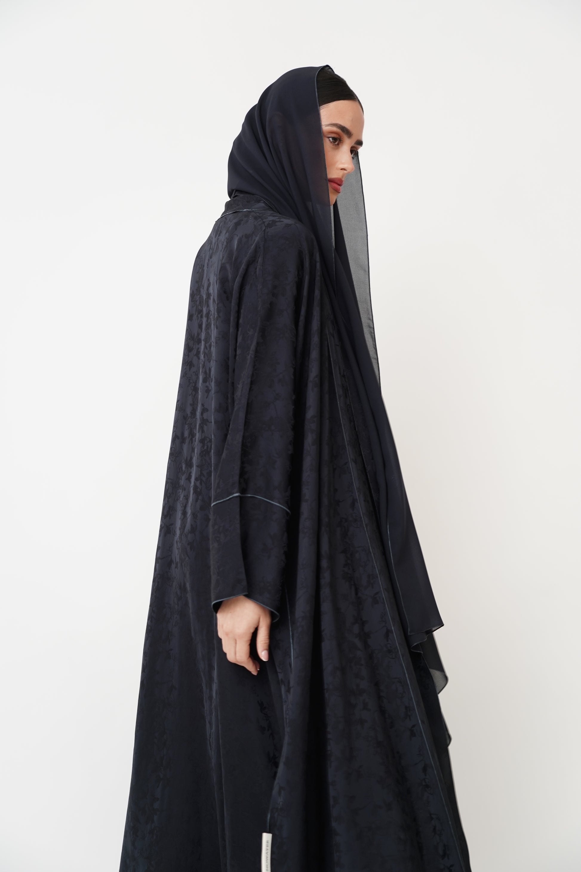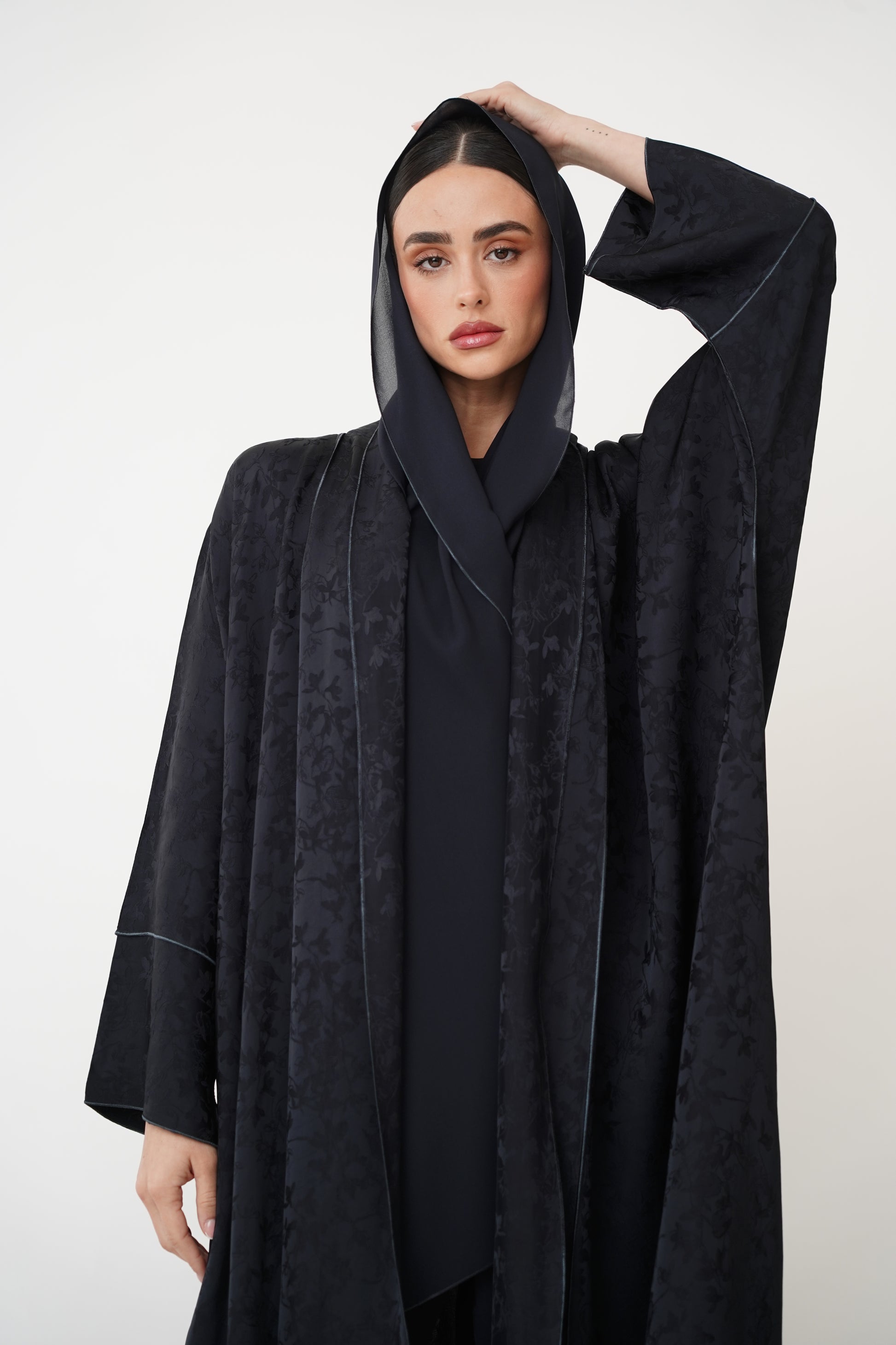 Wide abaya with delicate floral patterns, fine silk embroidery on the edges, and side slits, paired with a sheila adorned with thin embroidery along the borders.