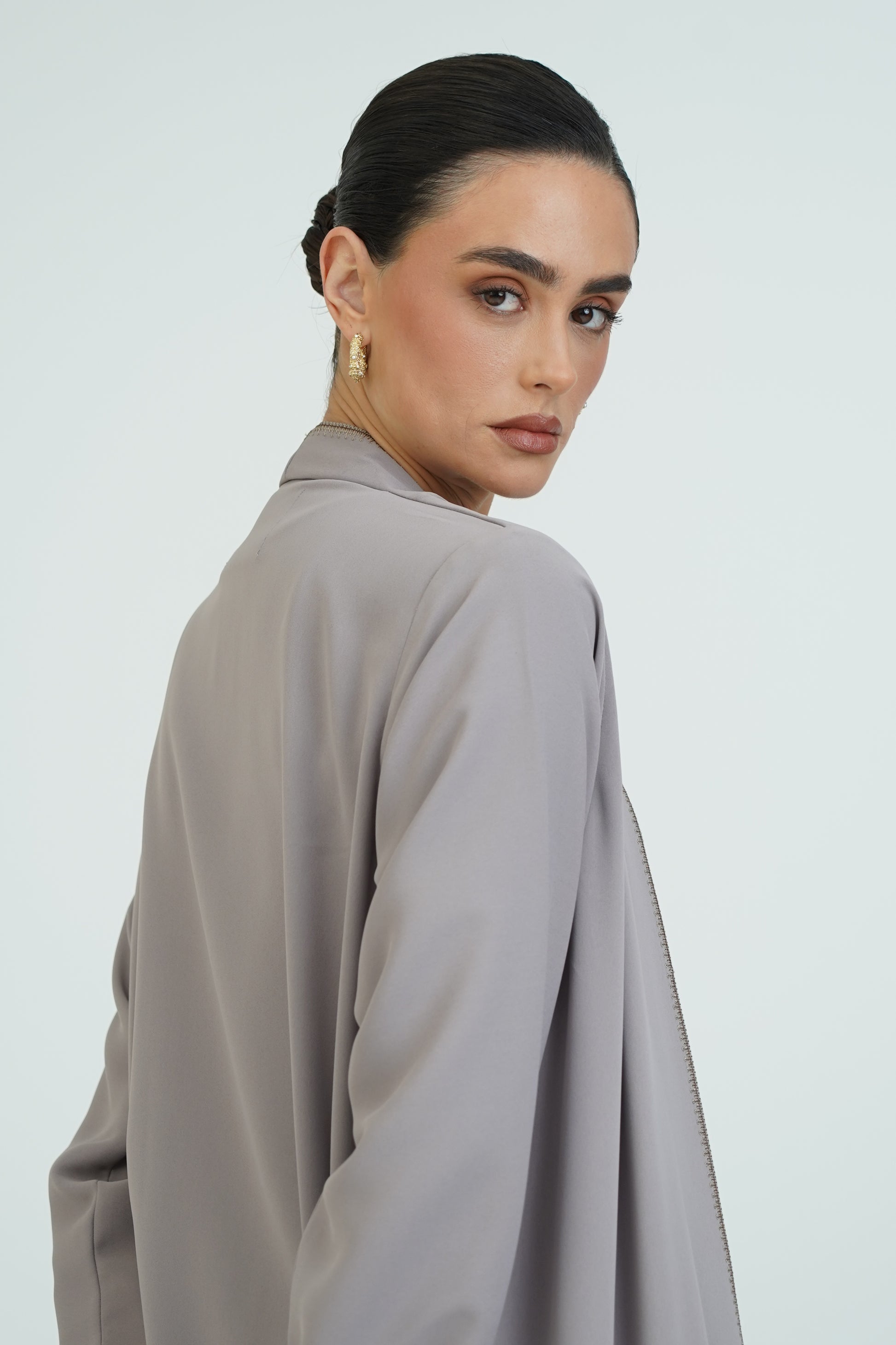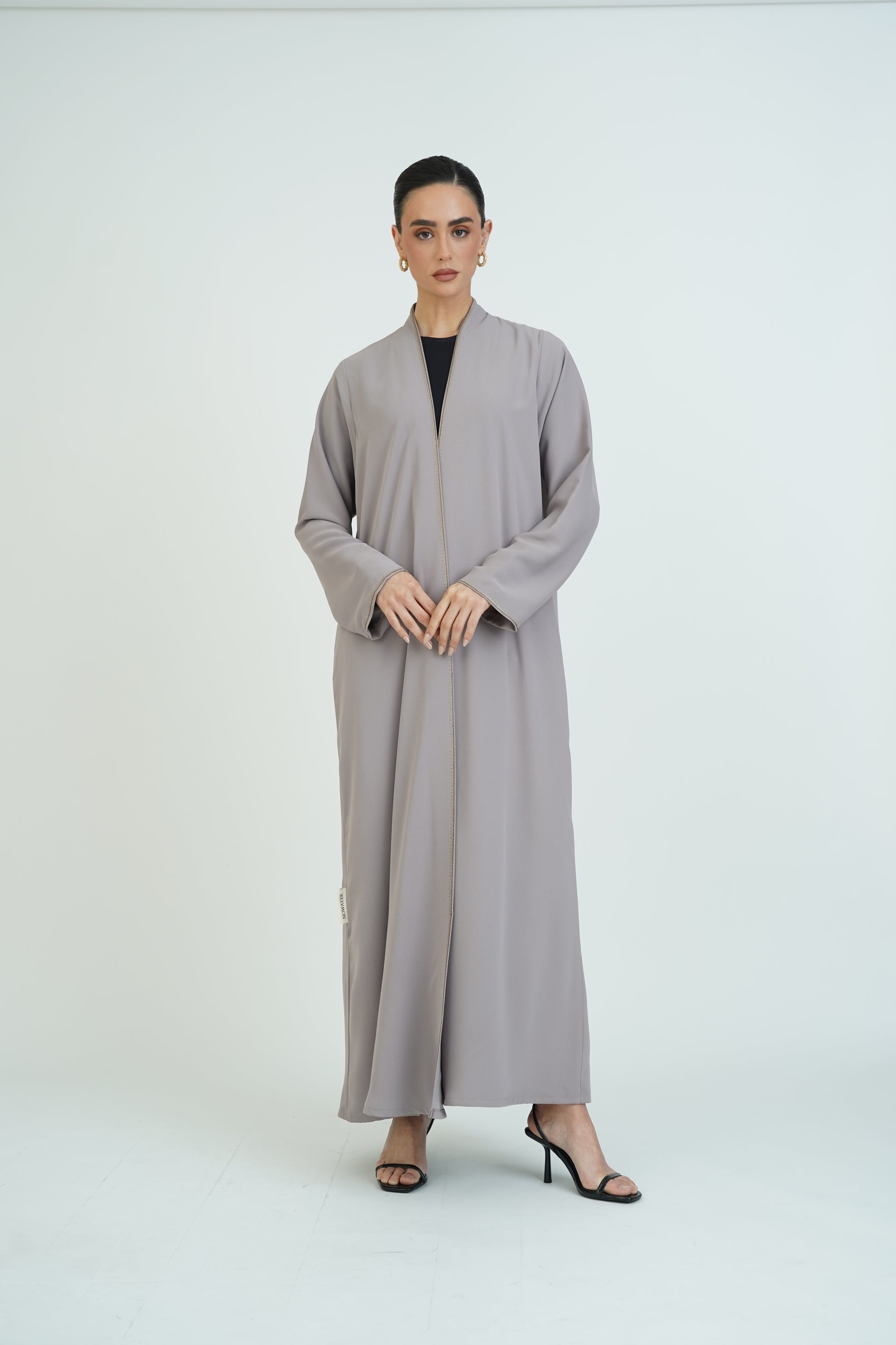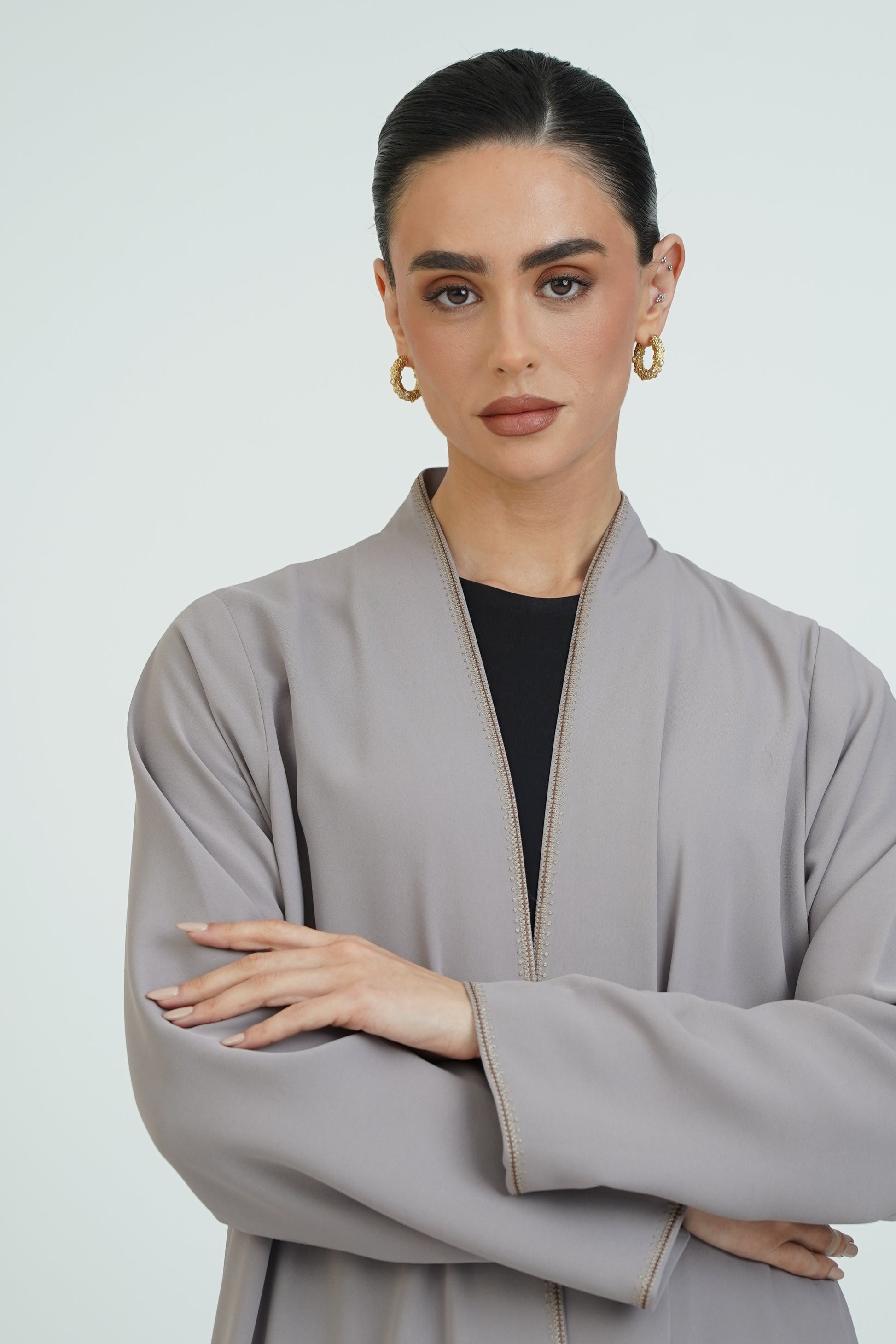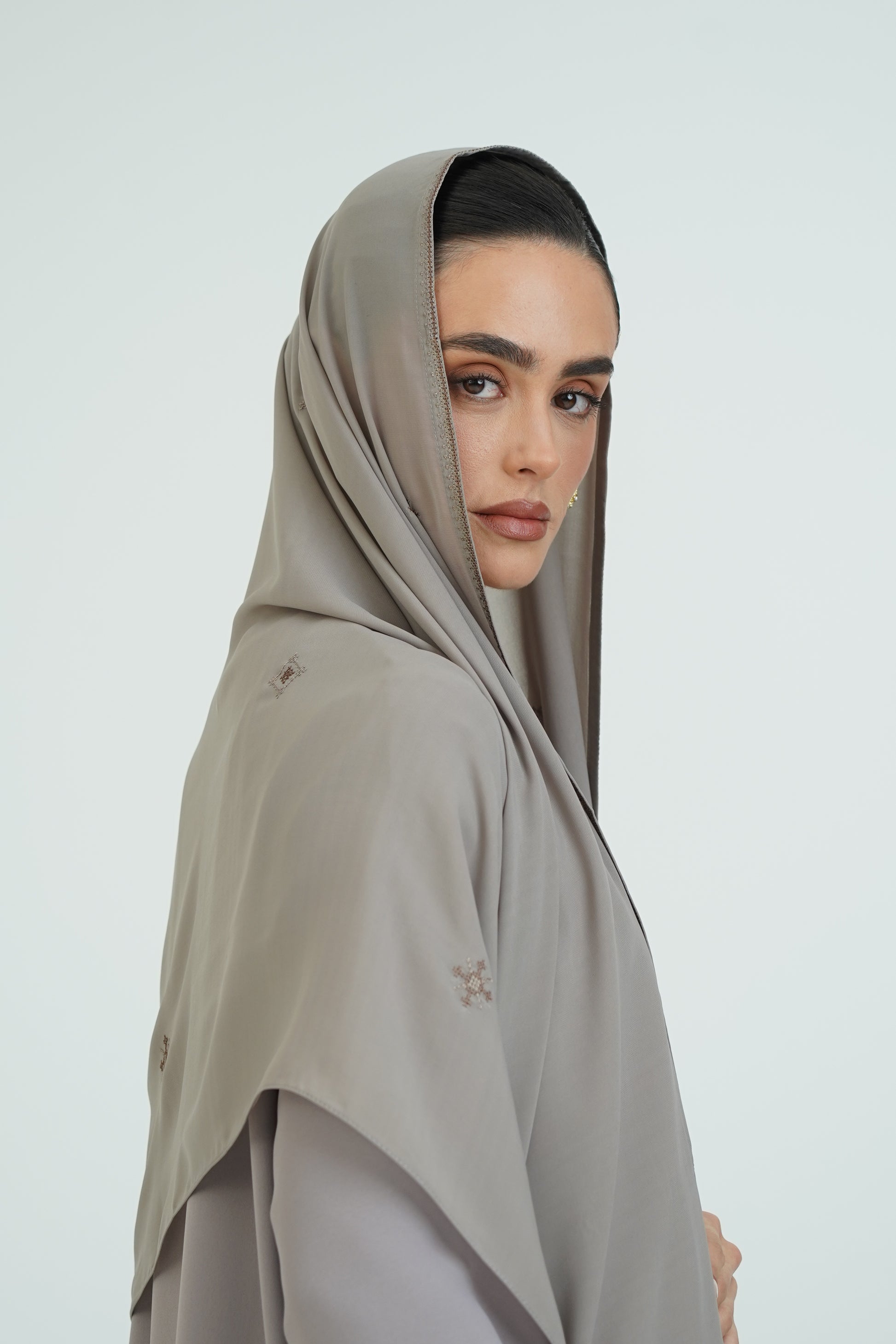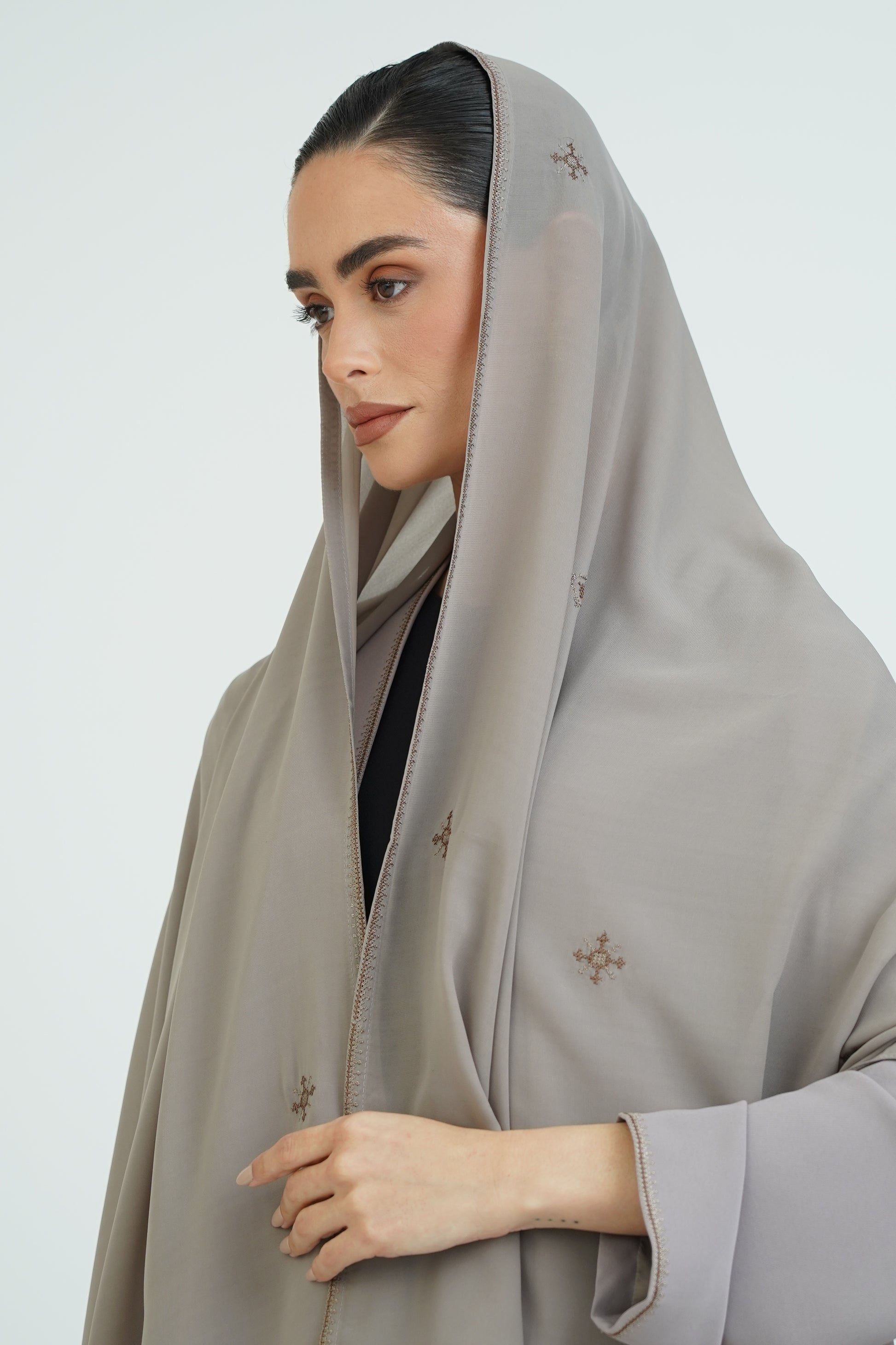 Crepe abaya in taupe with vertical embroidery on the front and sleeves, and geometric embroidery on the sheila in matching tones.