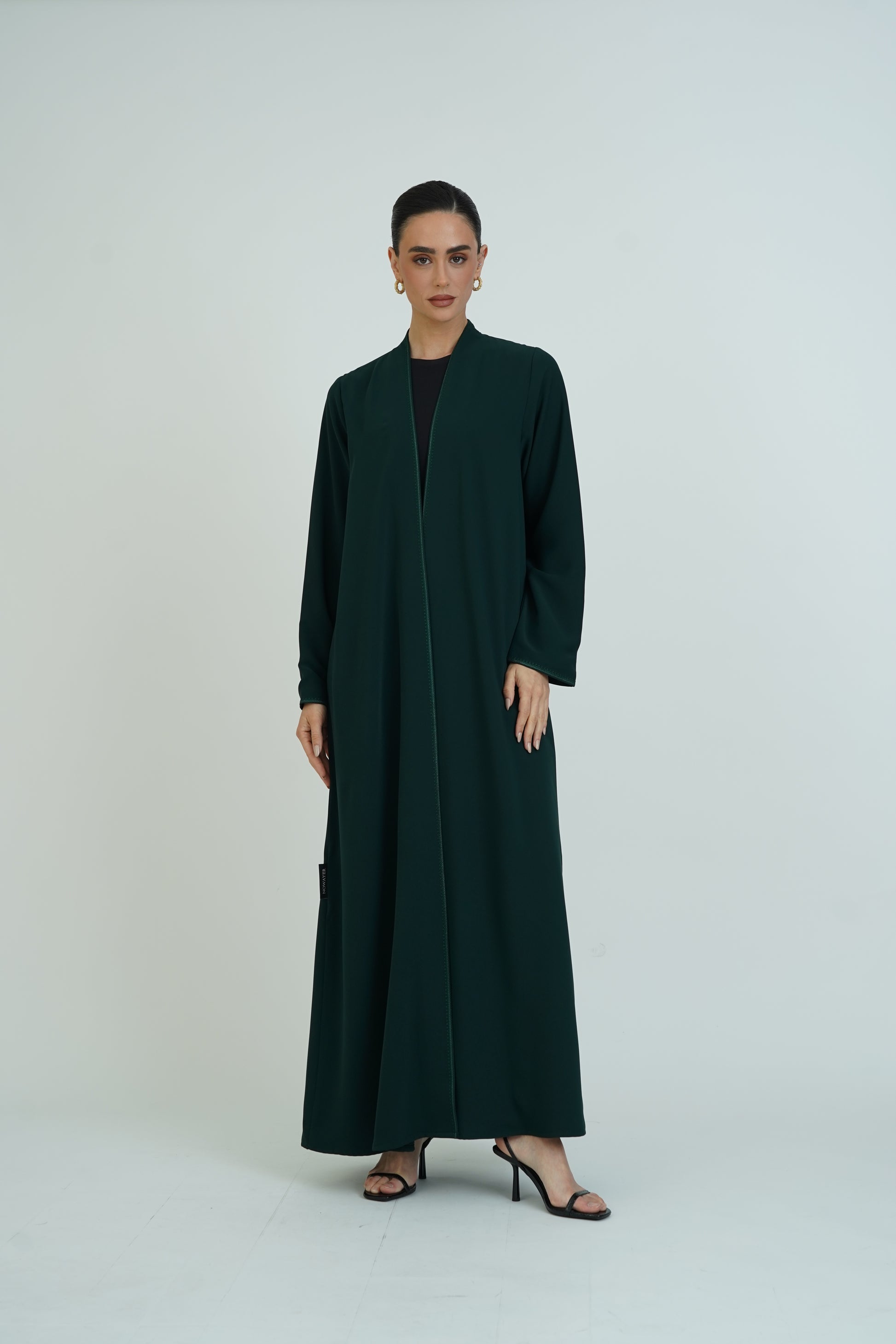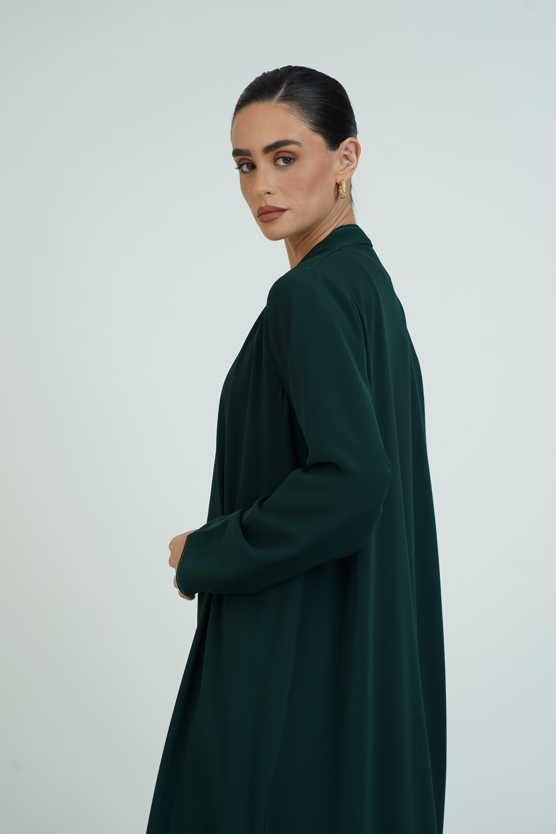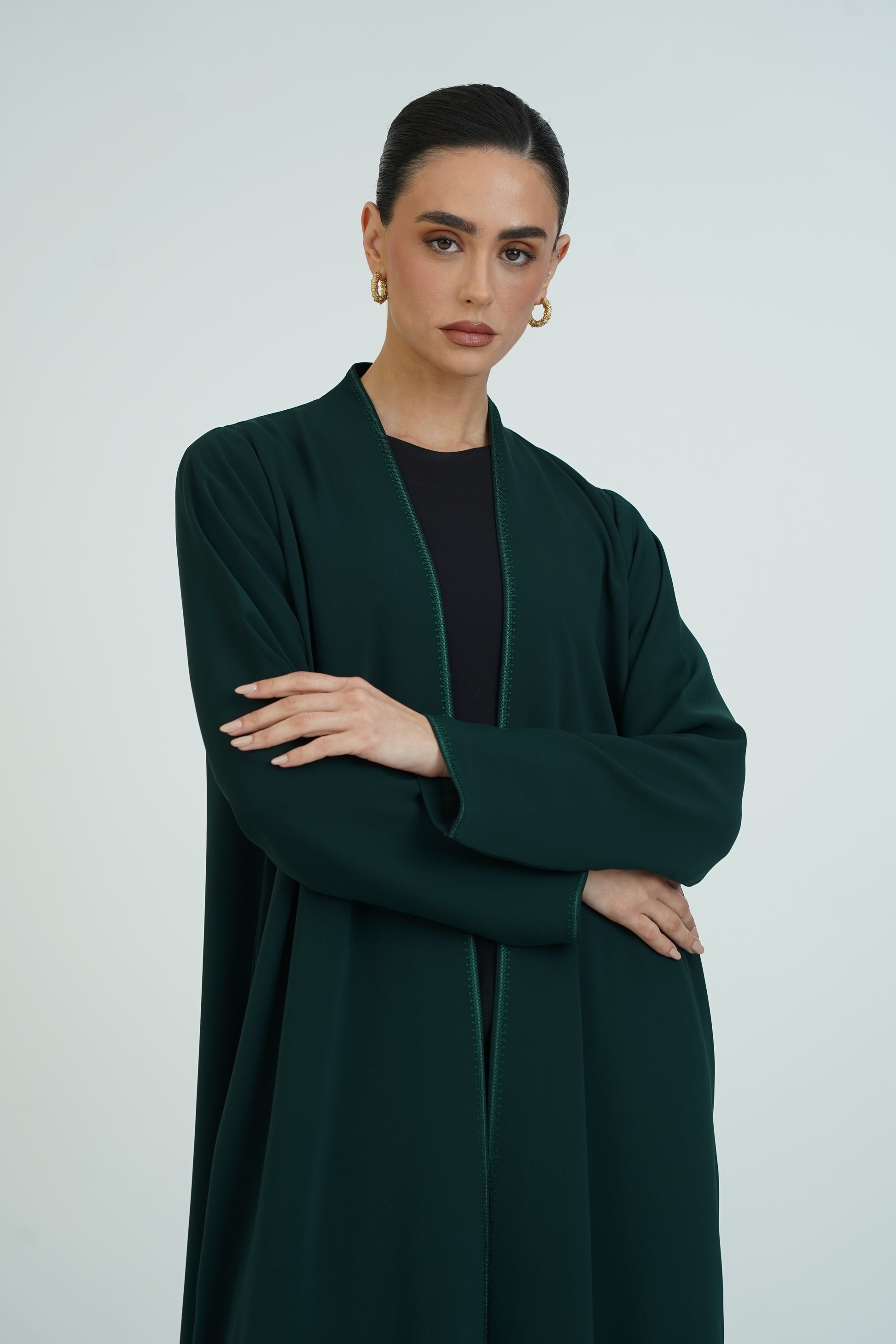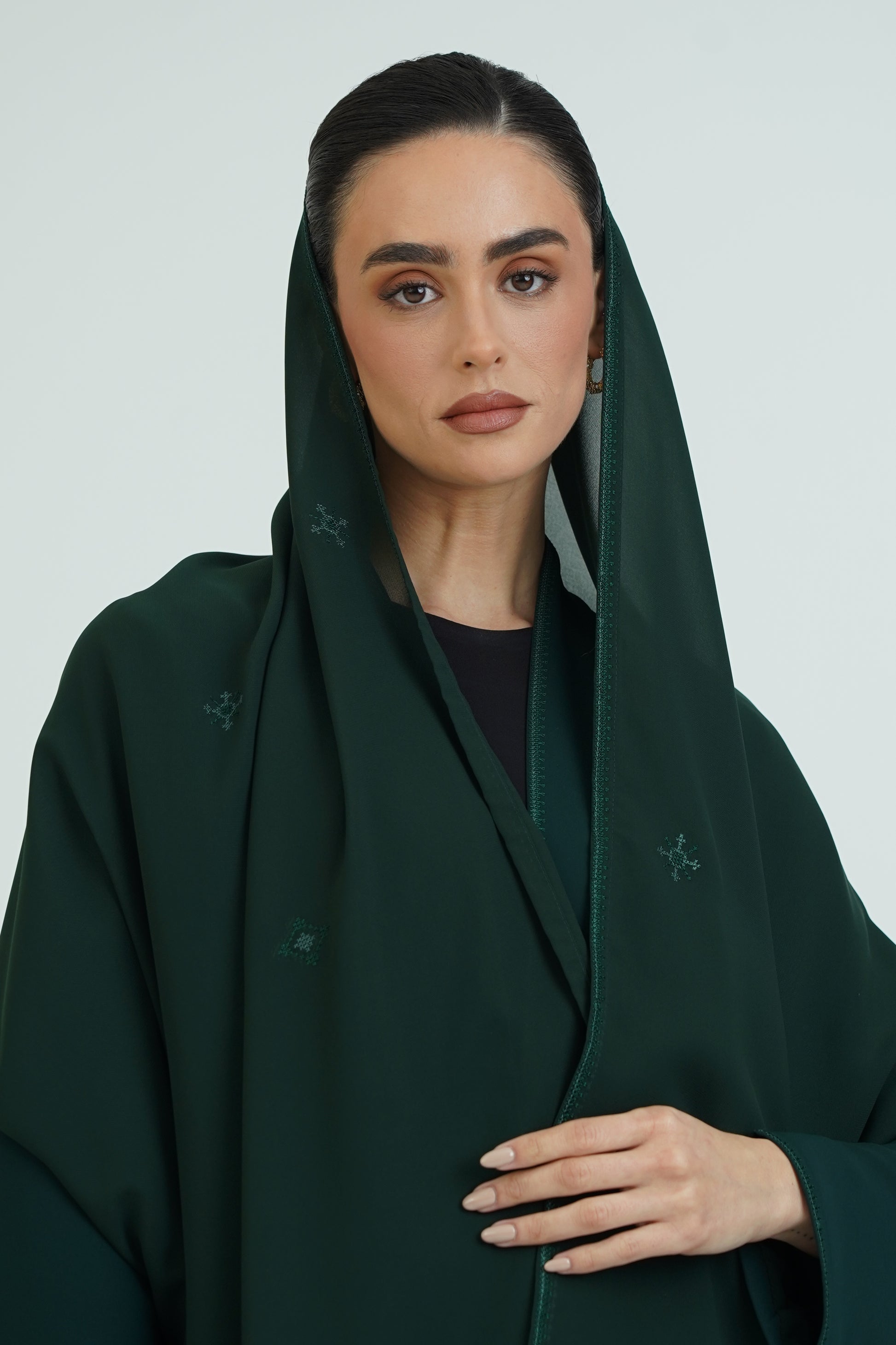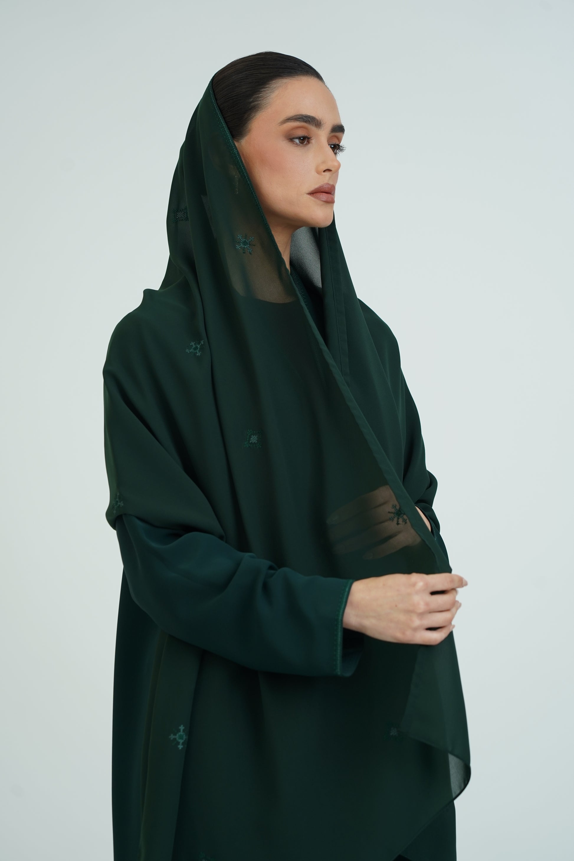 Crepe abaya in dark green with vertical embroidery on the front and sleeves, and geometric embroidery on the sheila in shades of green.