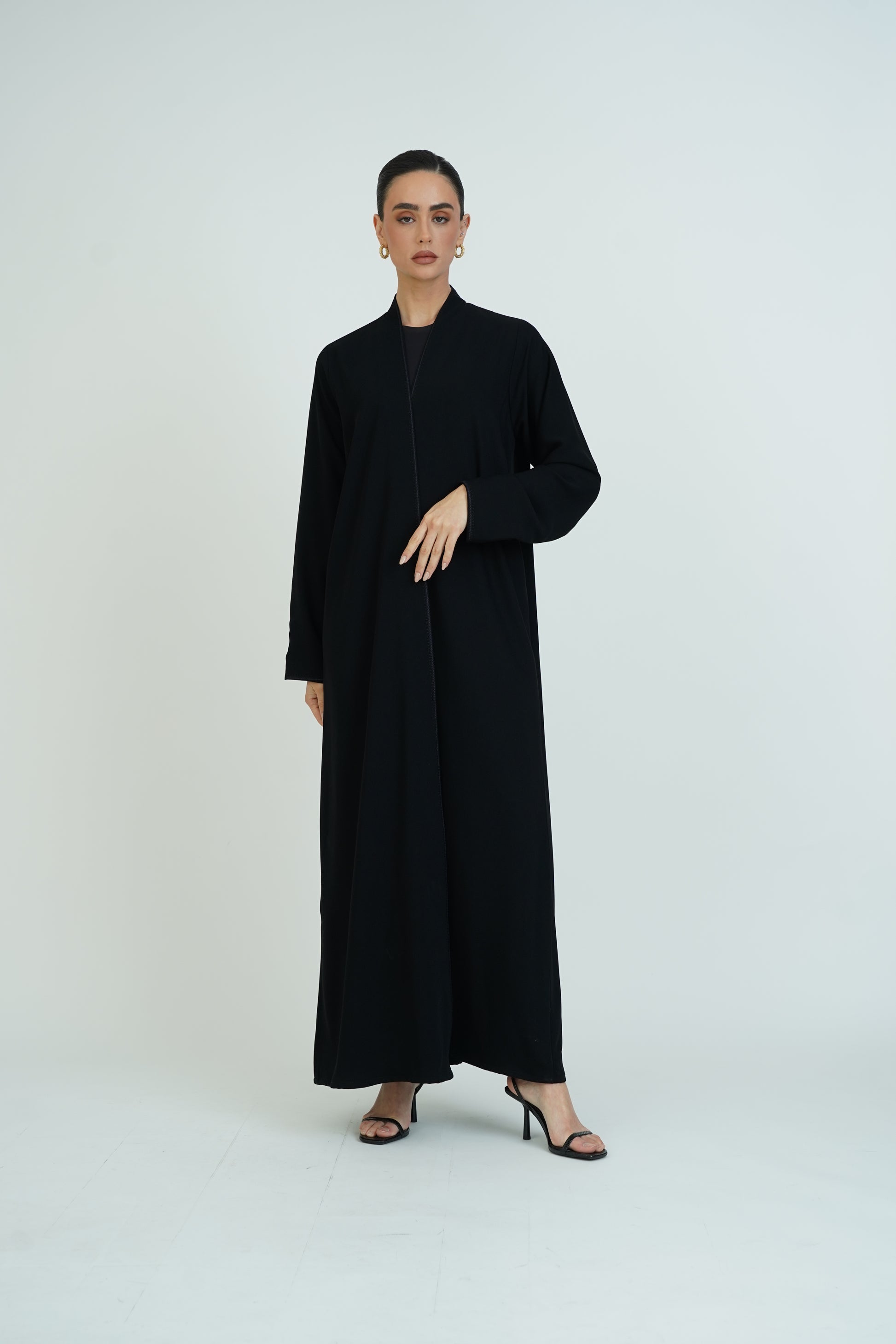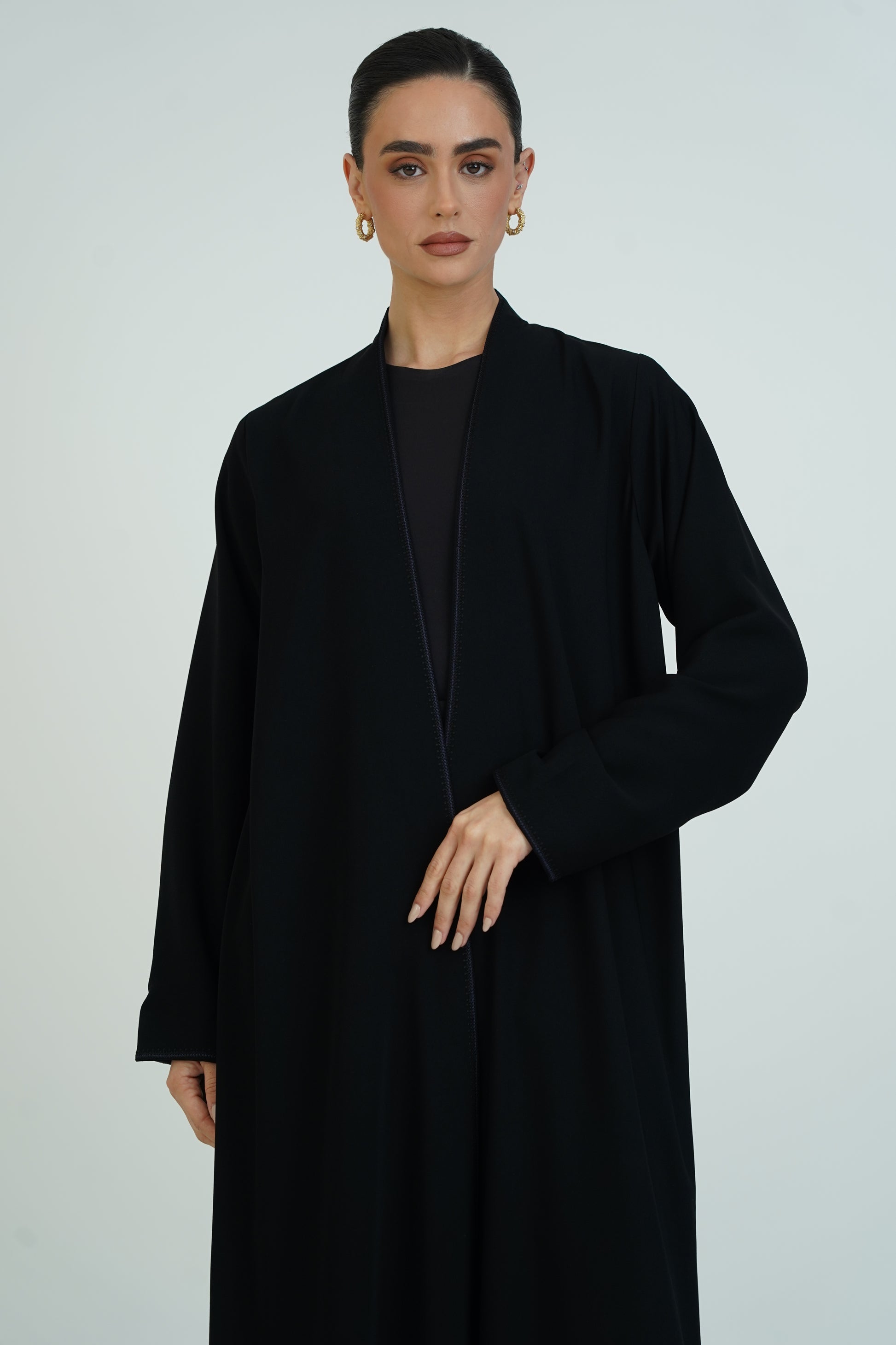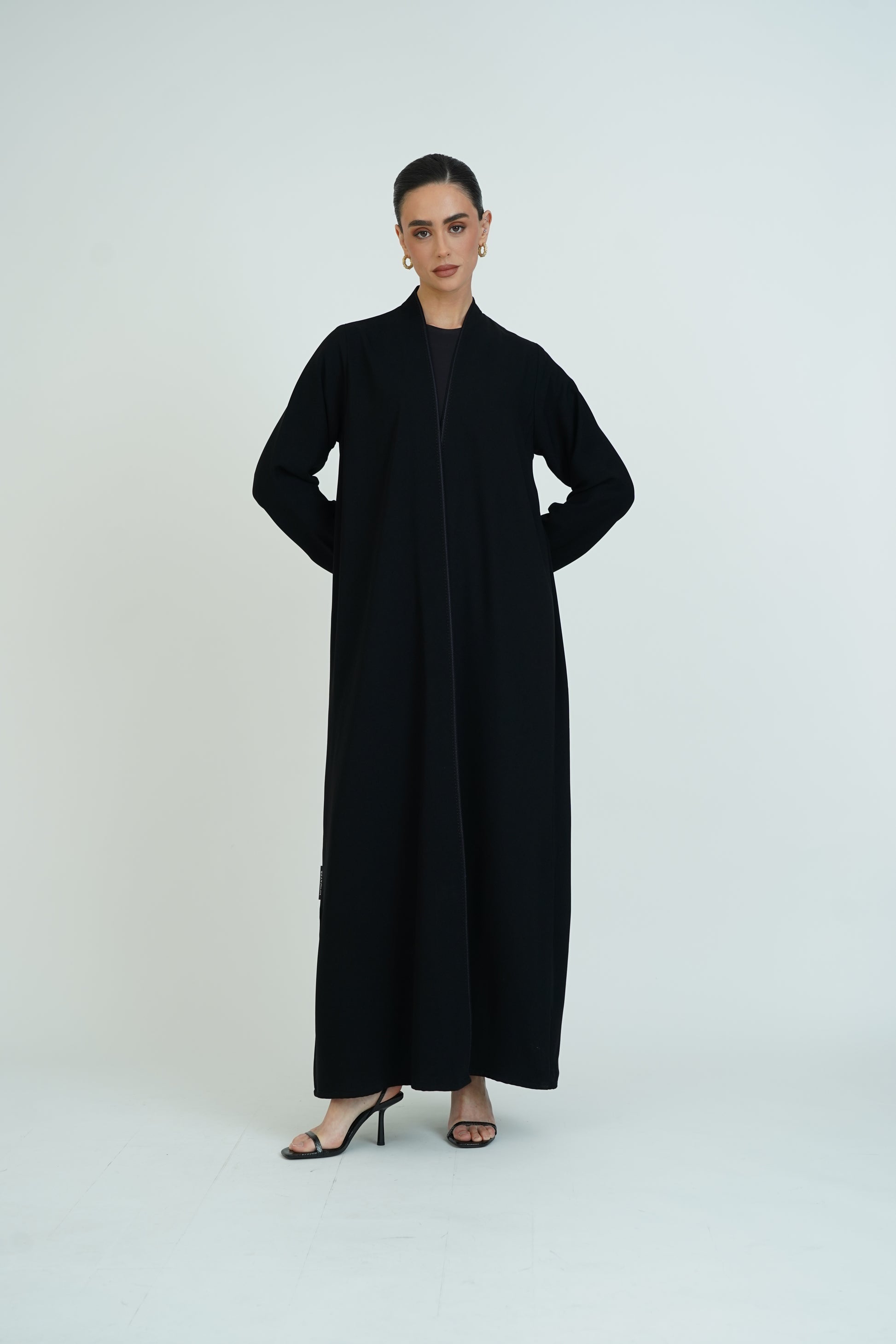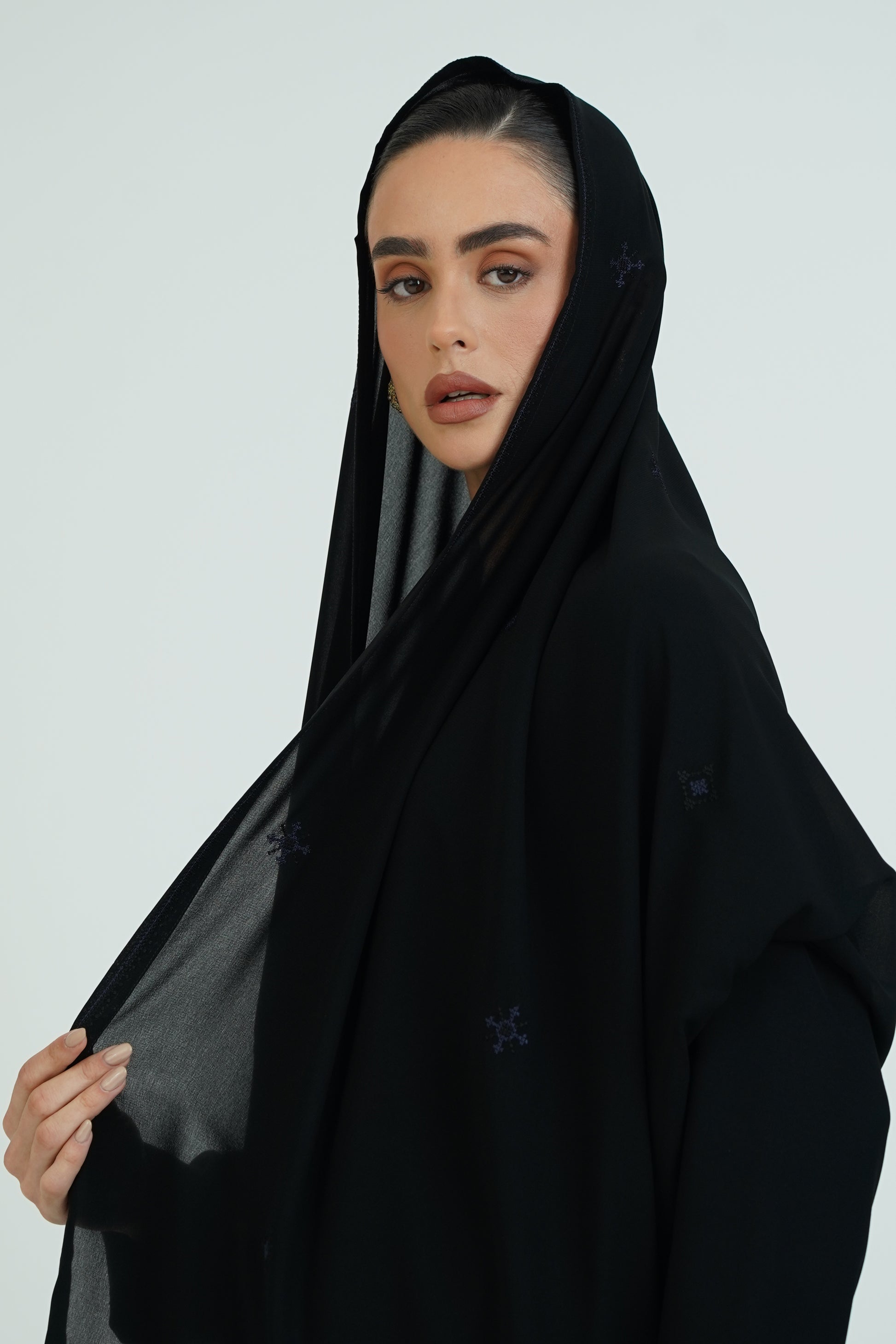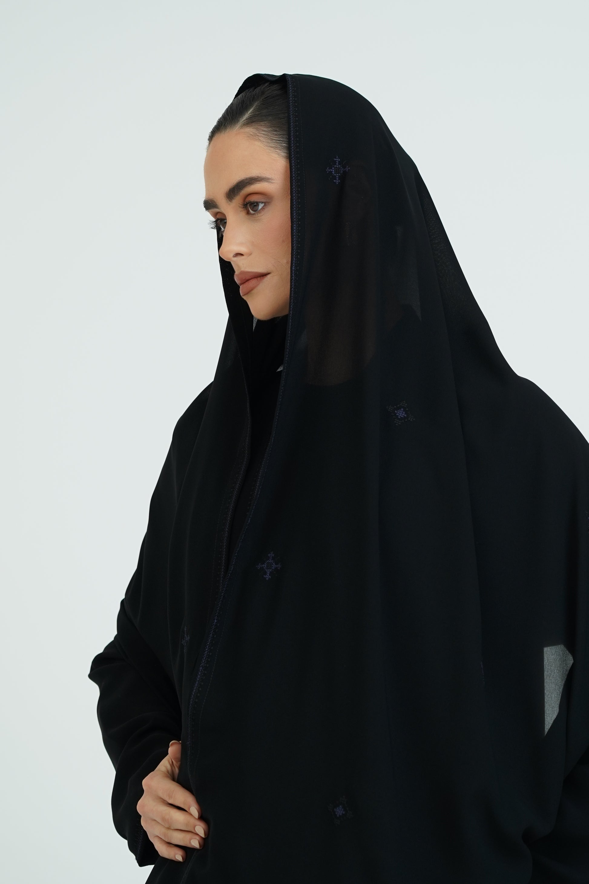 Crepe abaya in black with vertical embroidery on the front and sleeves, and purple geometric embroidery on the sheila.