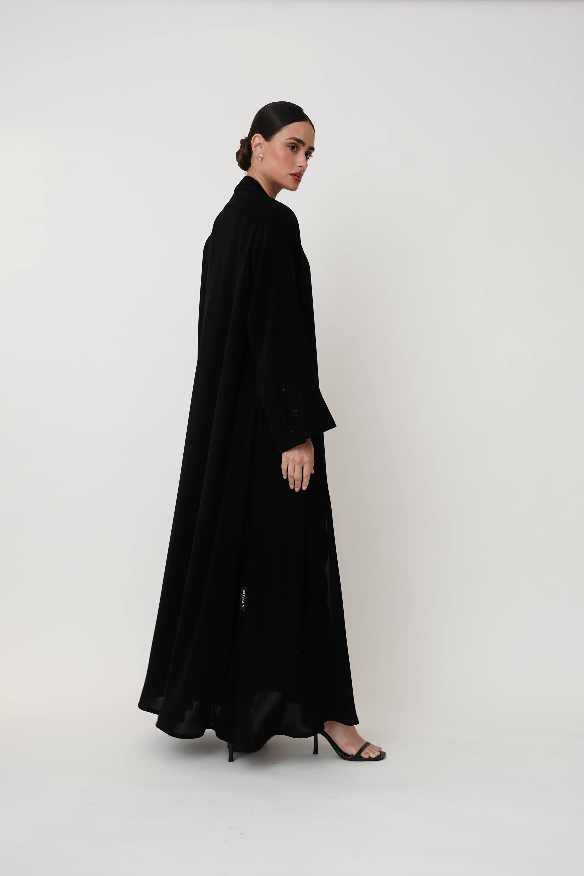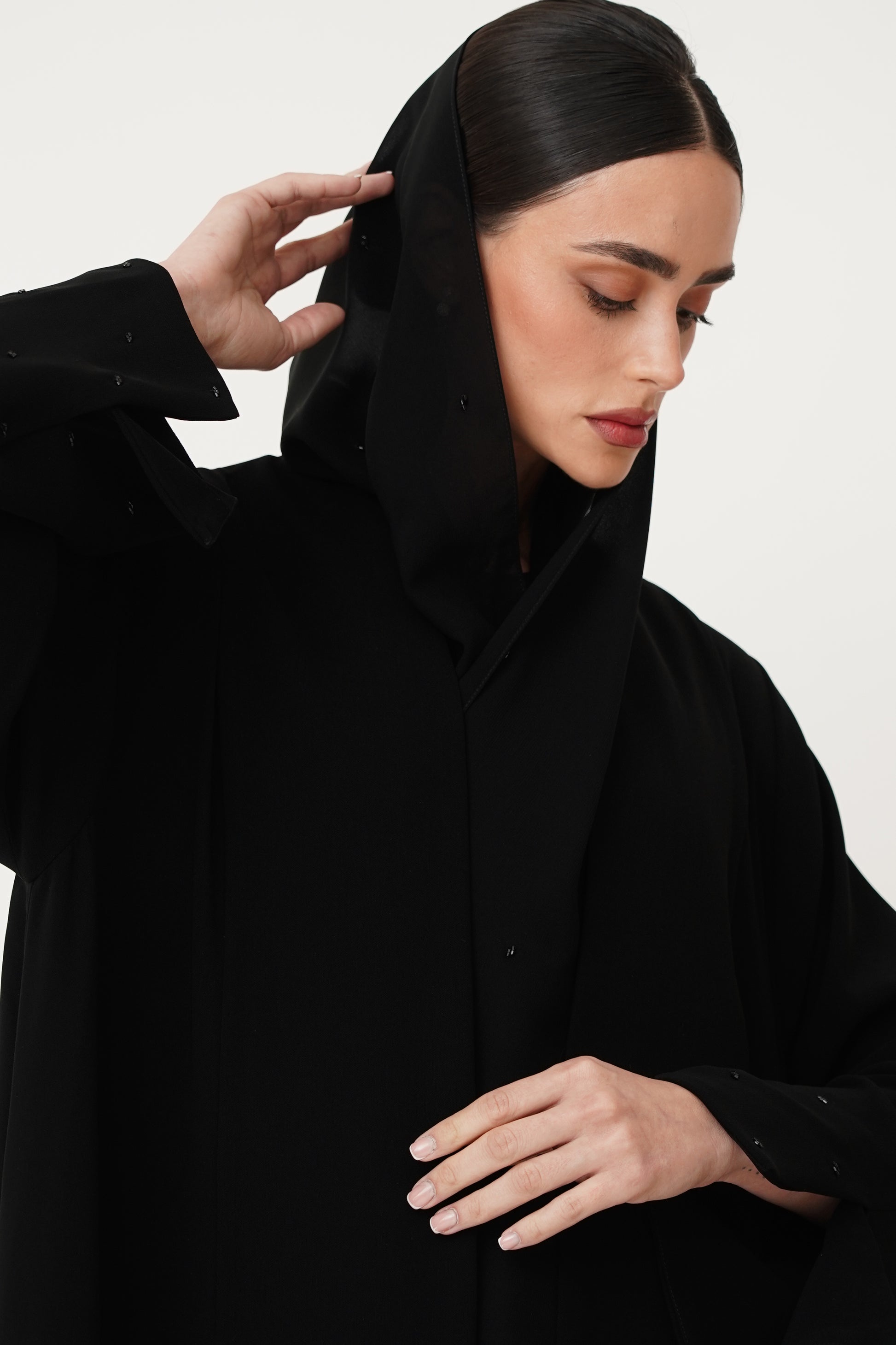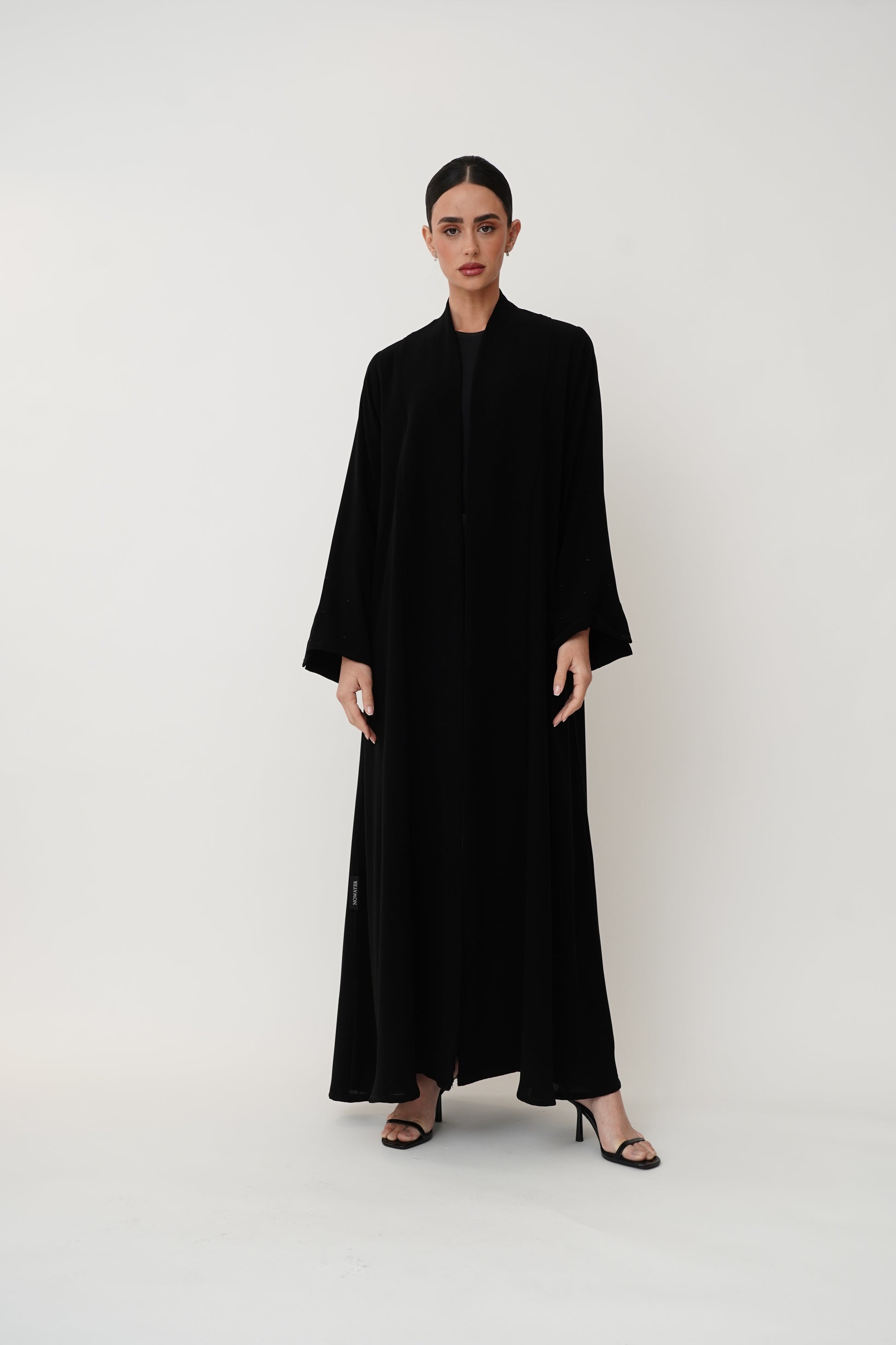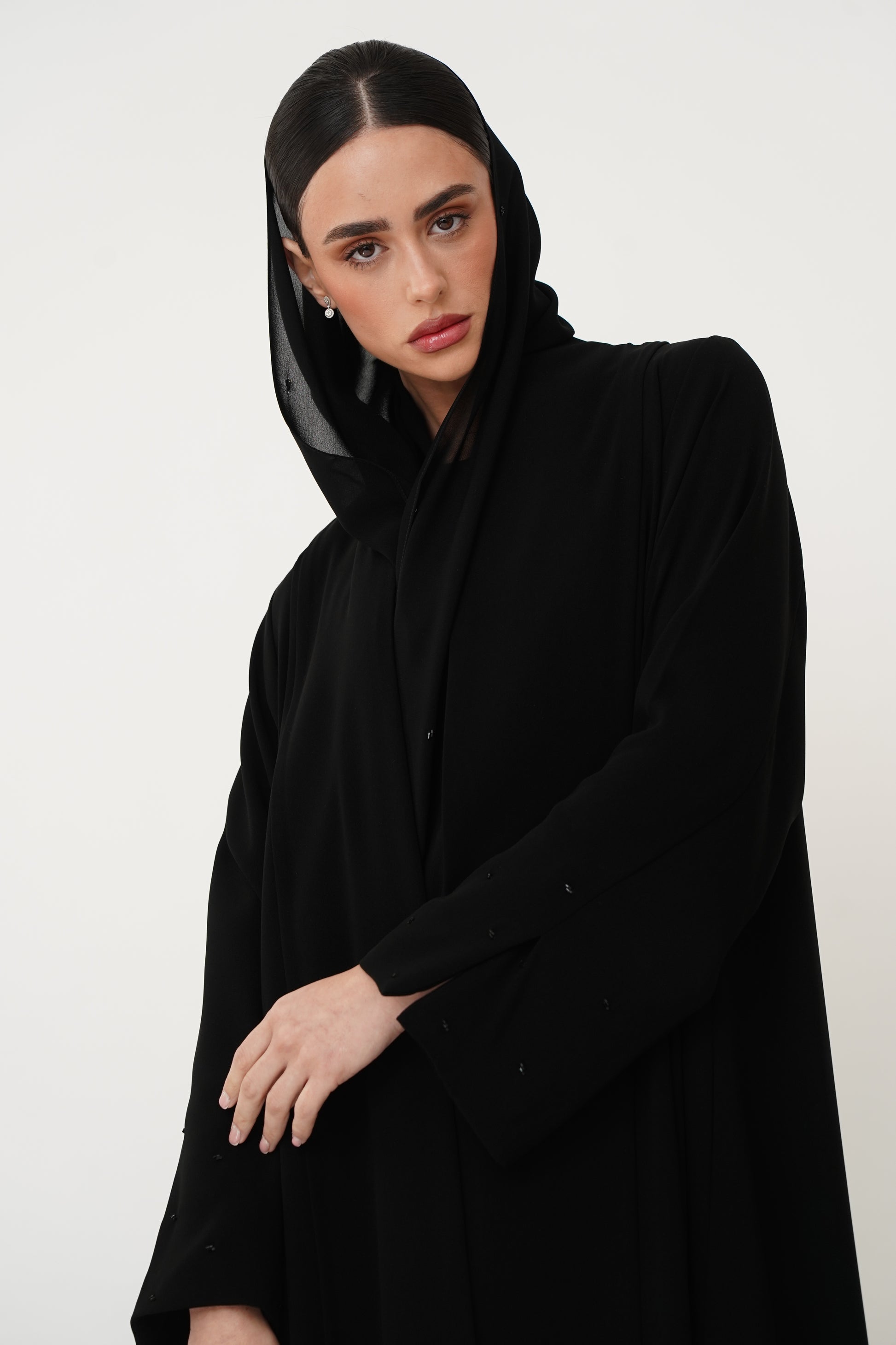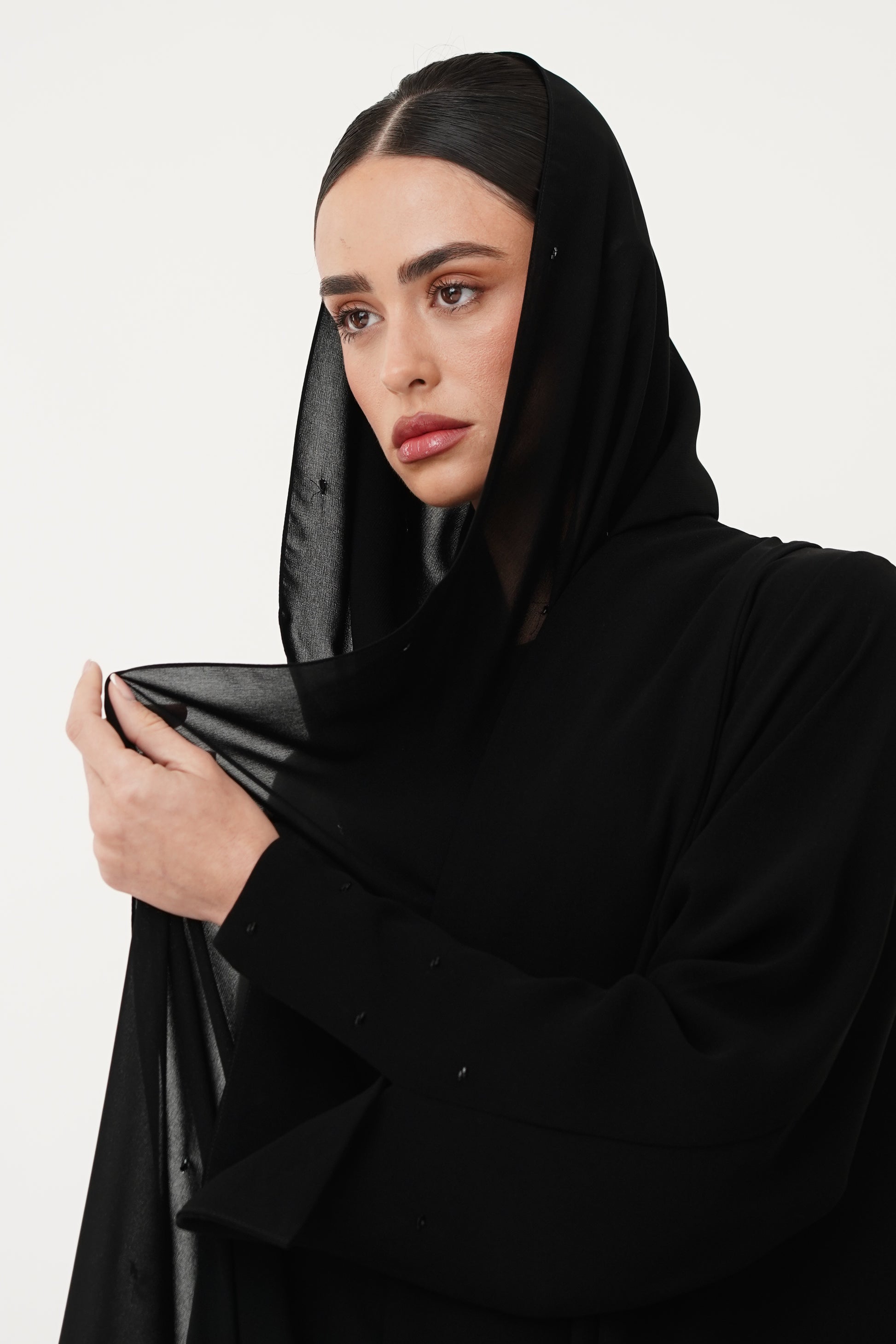 Elegant abaya adorned with delicate beadwork on the sleeves, paired with a lightweight sheila embellished with scattered beads.
