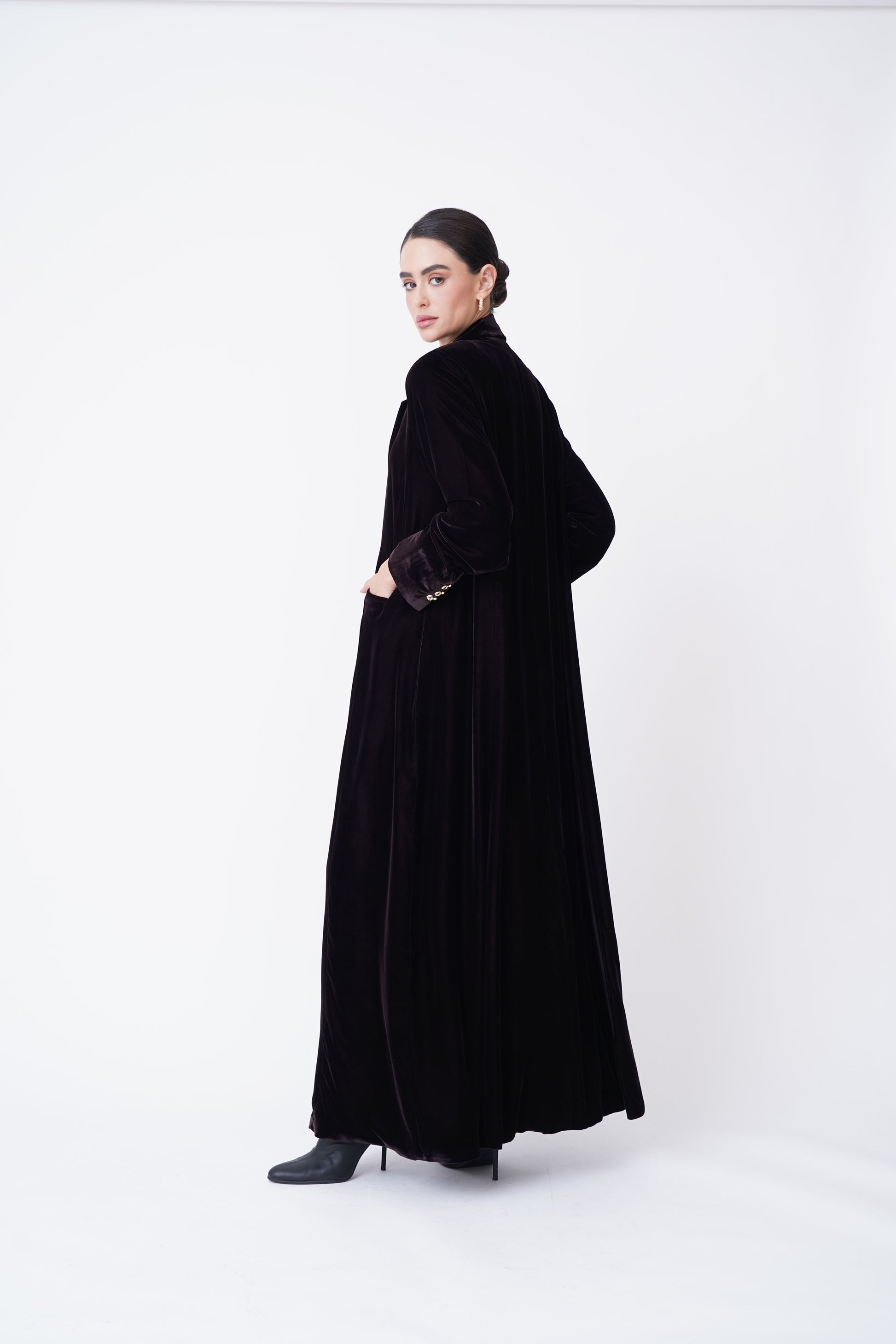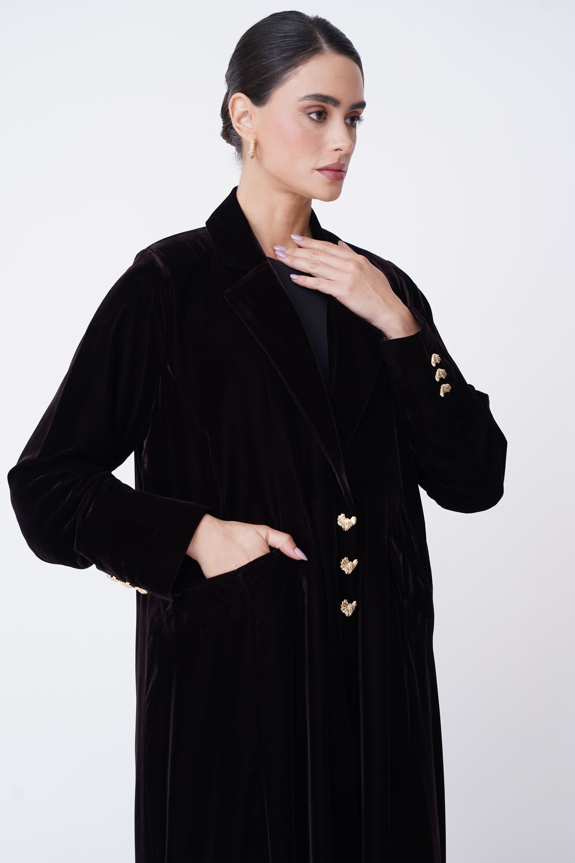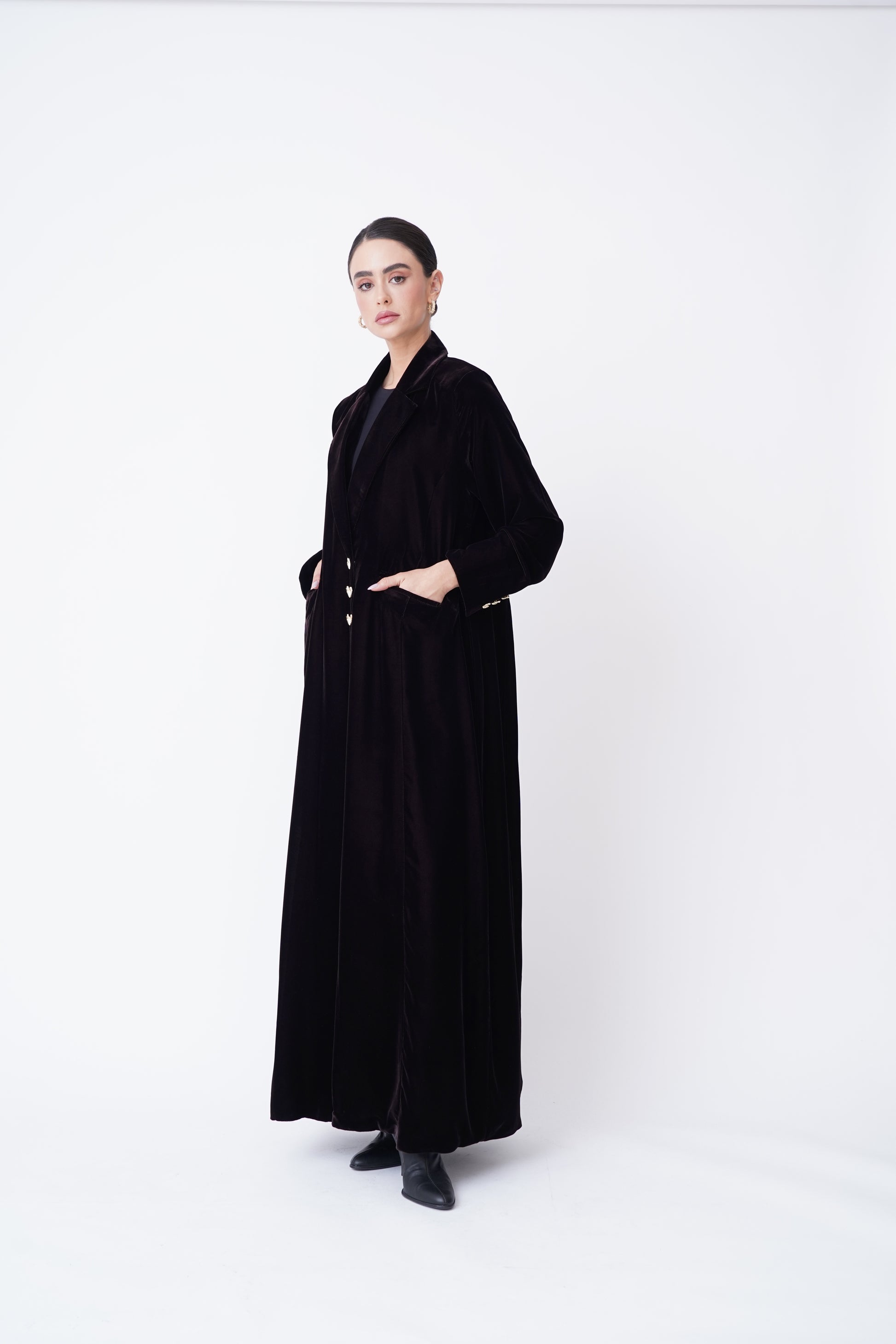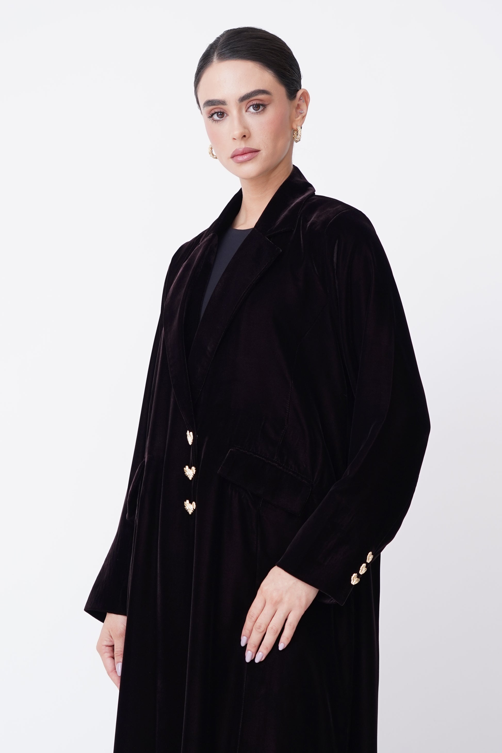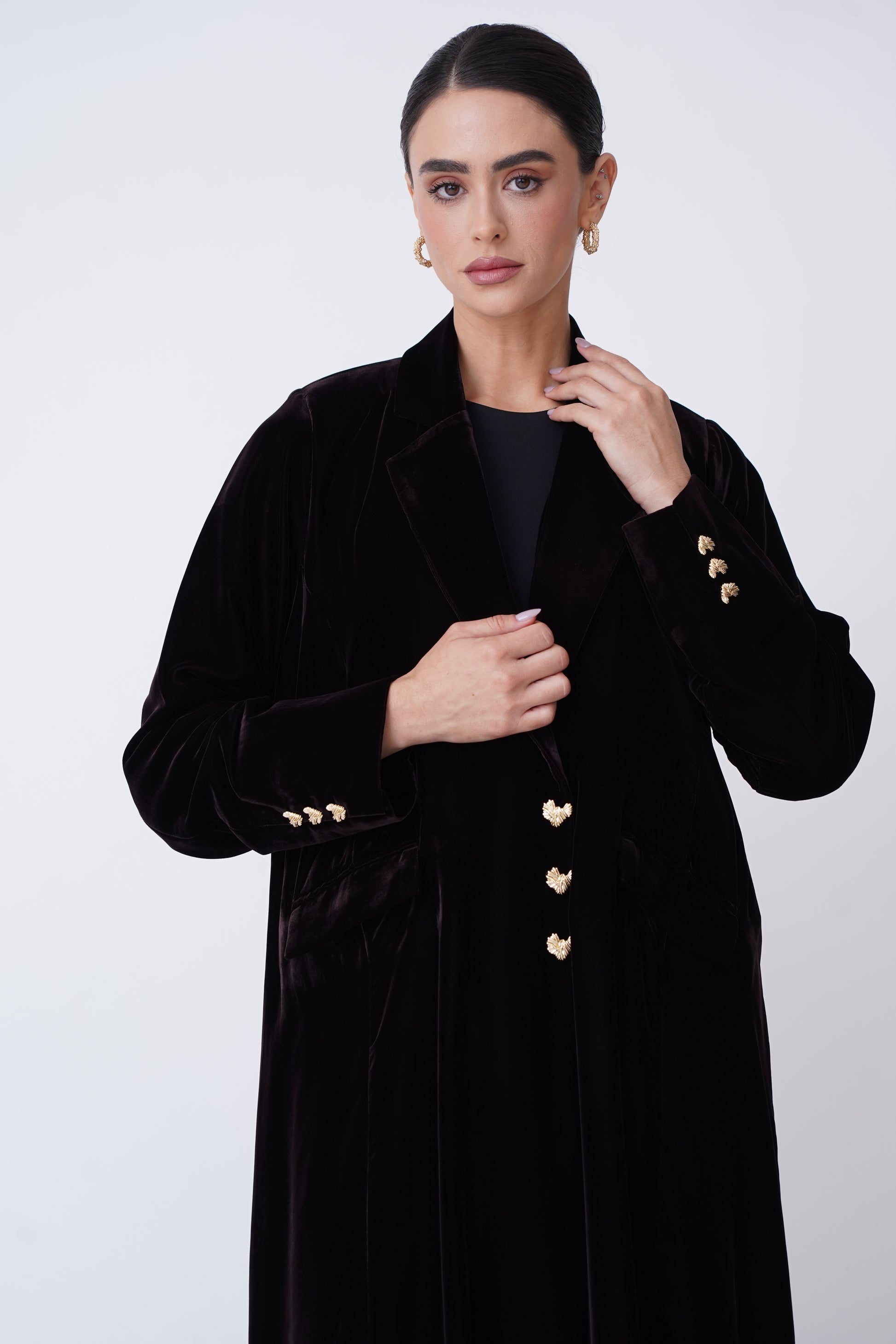 A velvet abaya with an elegant blazer design that reflects luxury and sophistication, adorned with exquisite golden buttons.