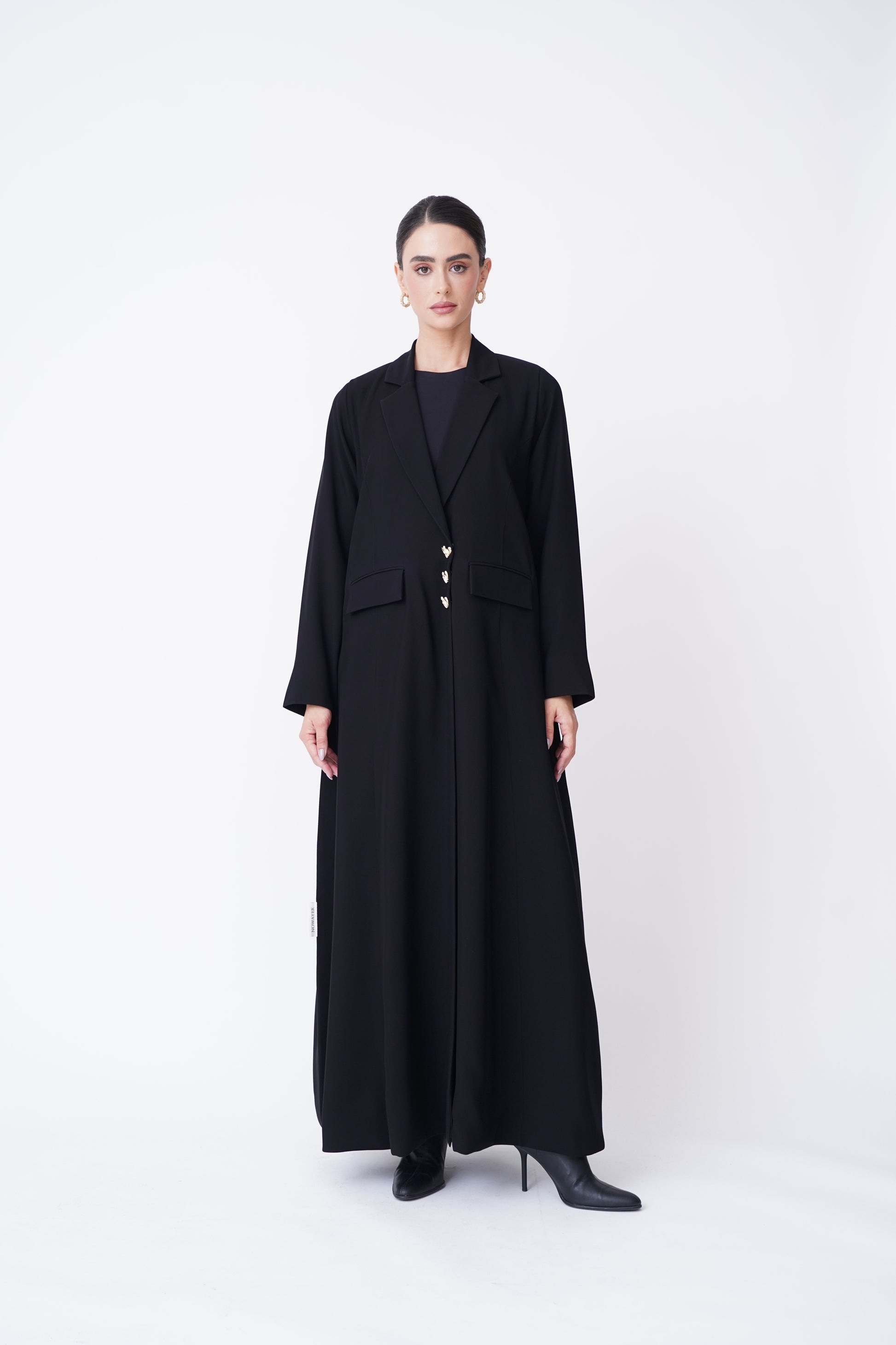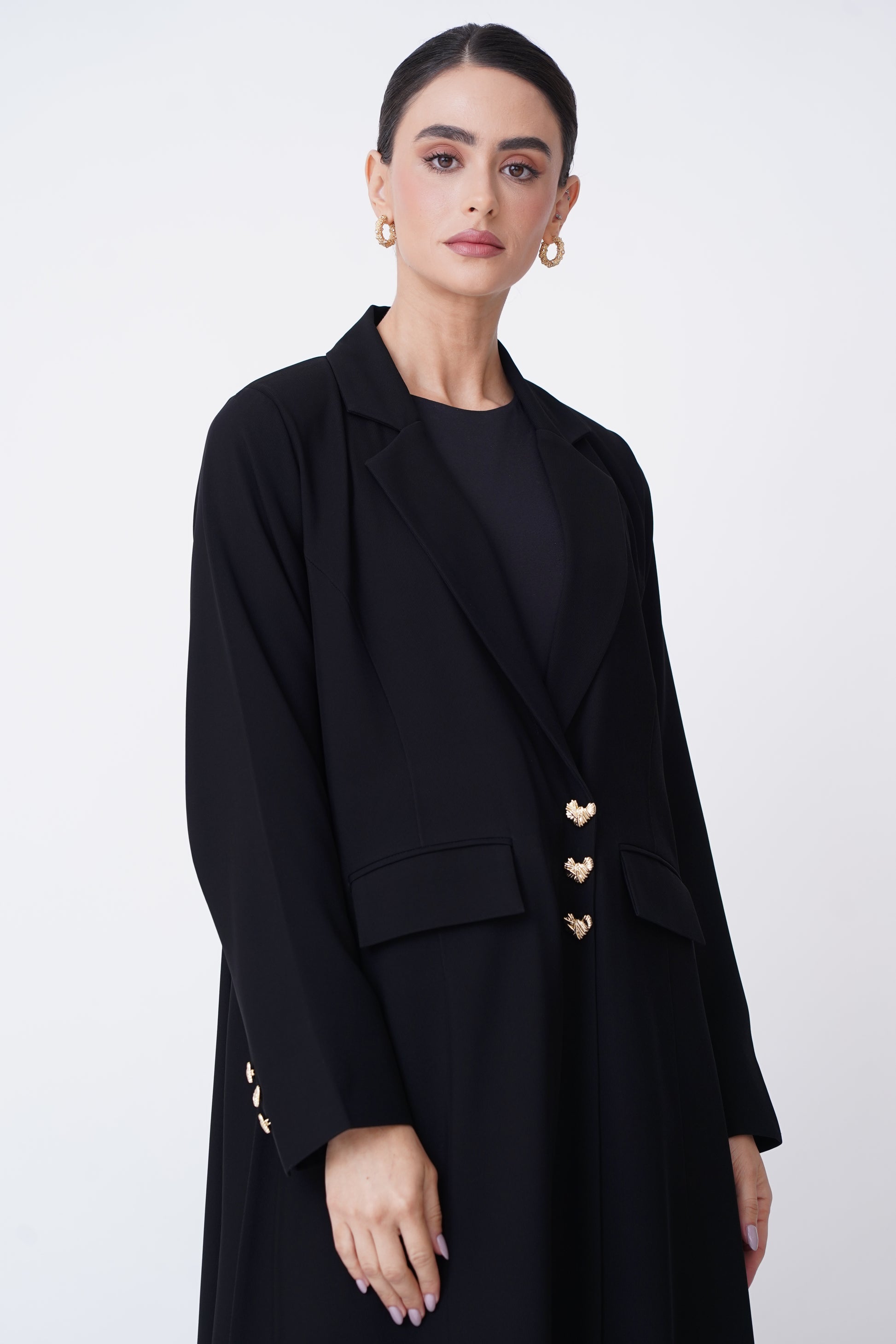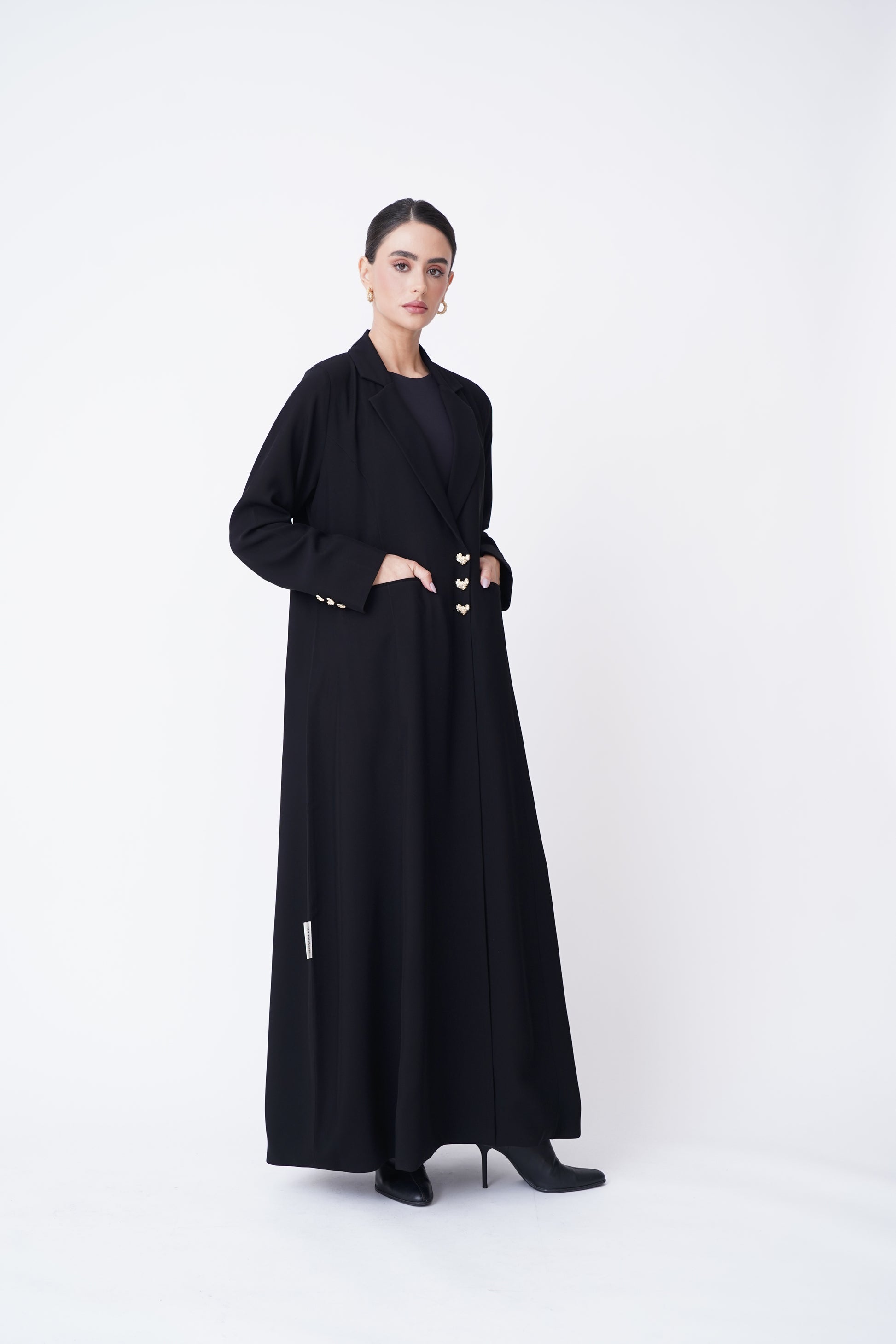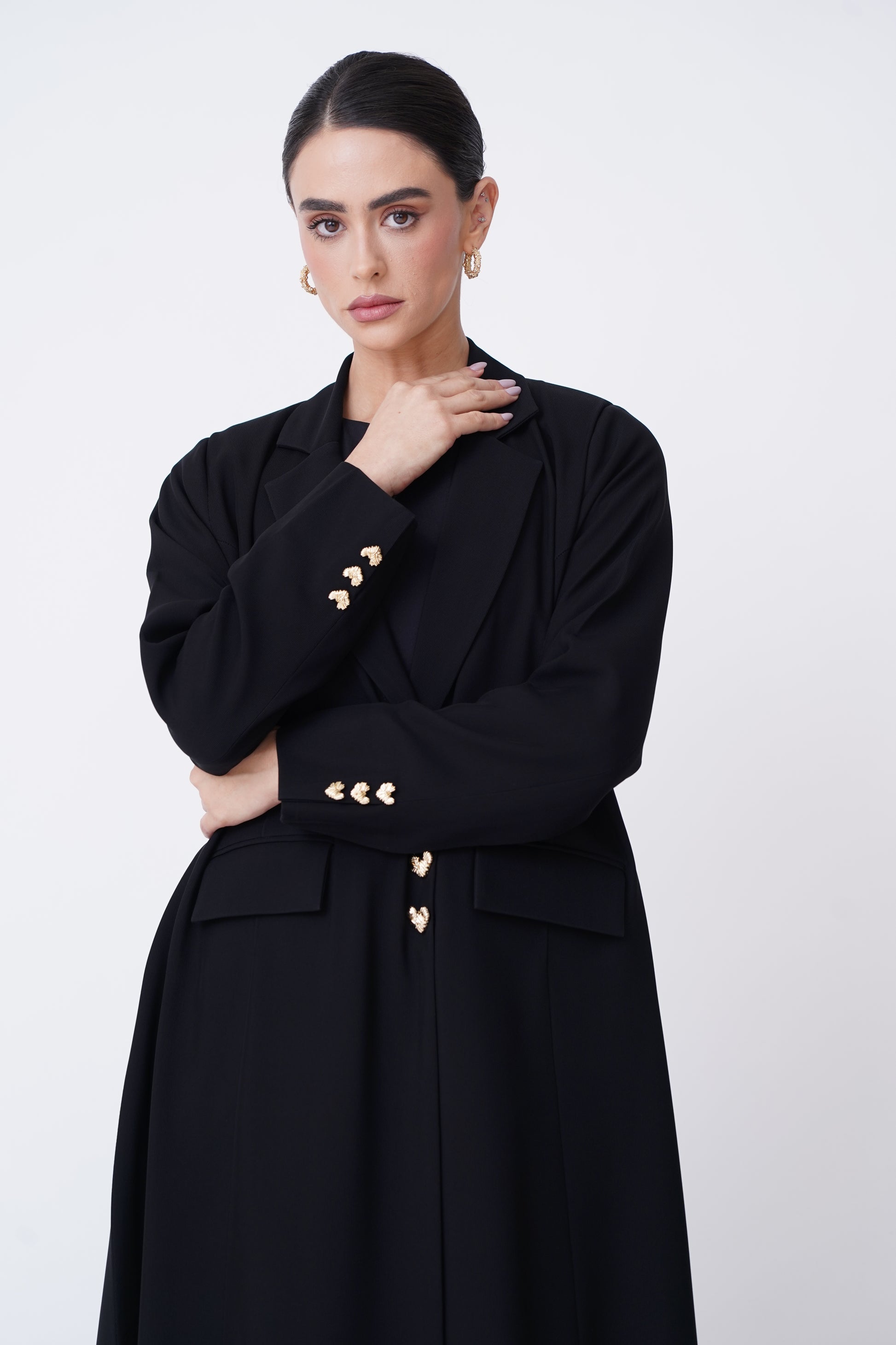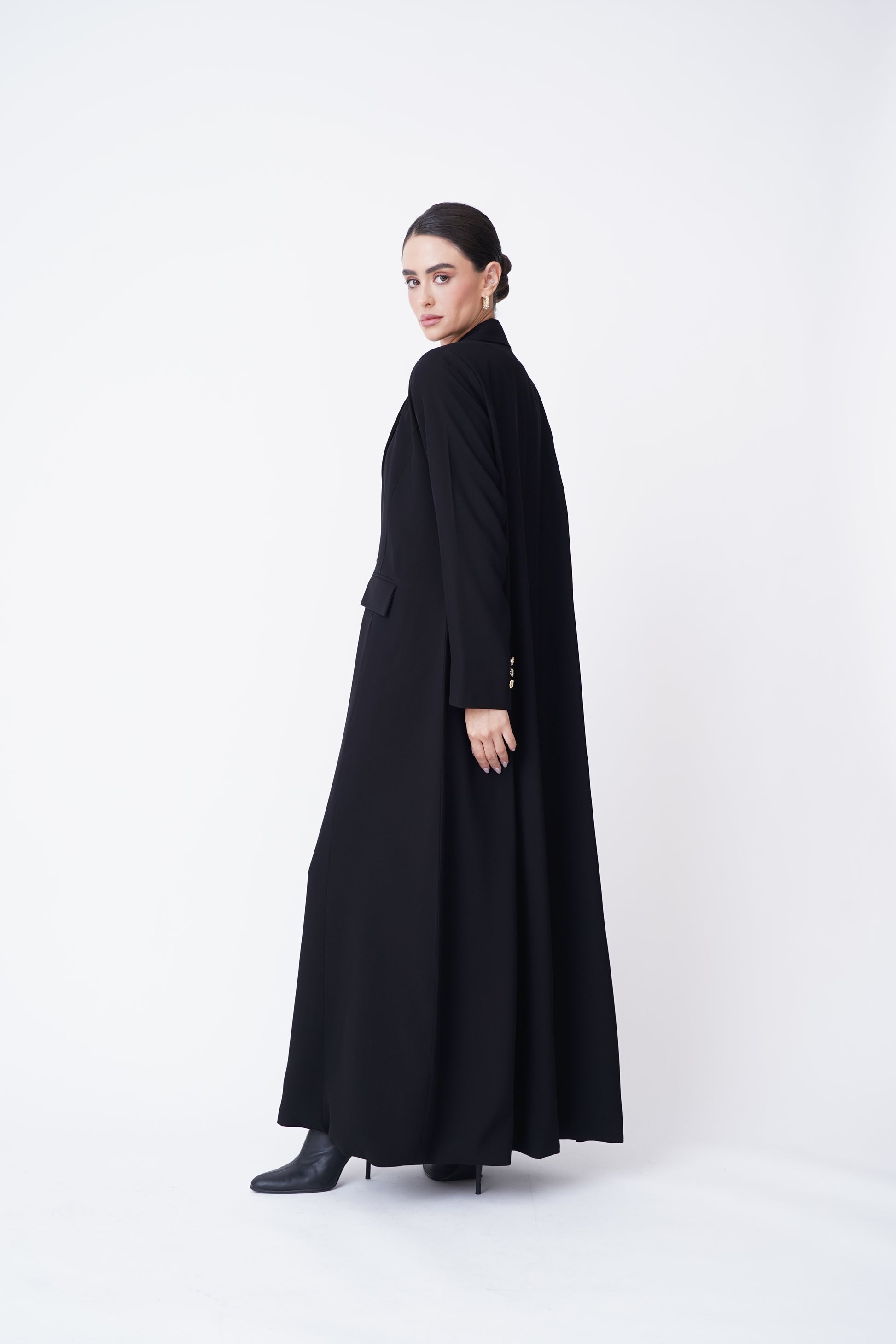 Acrepe abaya with an elegant blazer design that reflects luxury and sophistication, adorned with exquisite golden buttons.