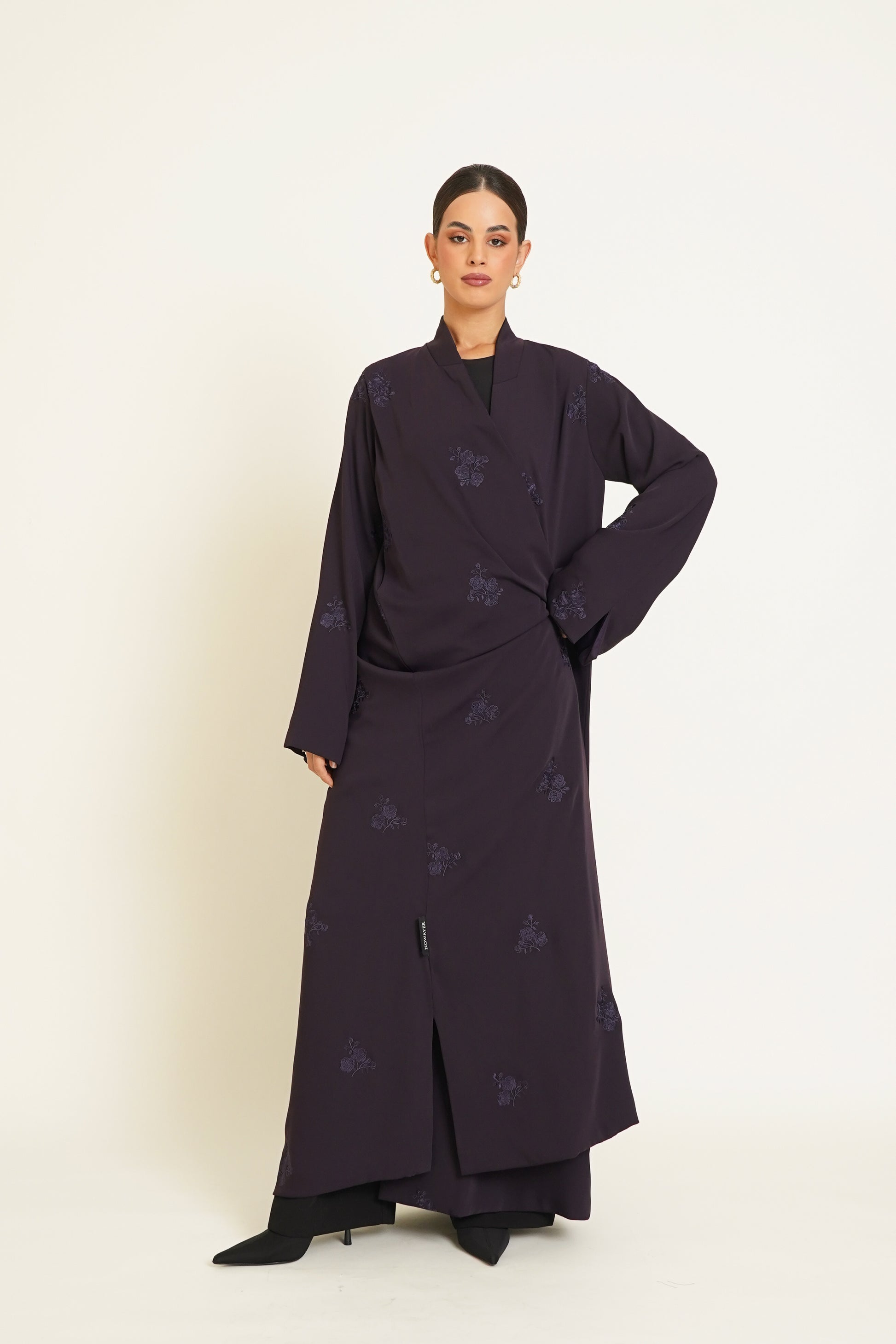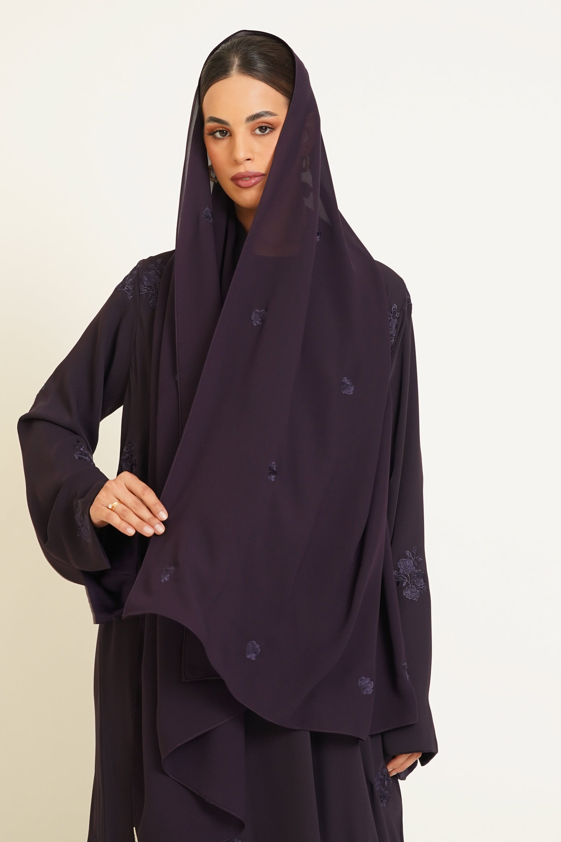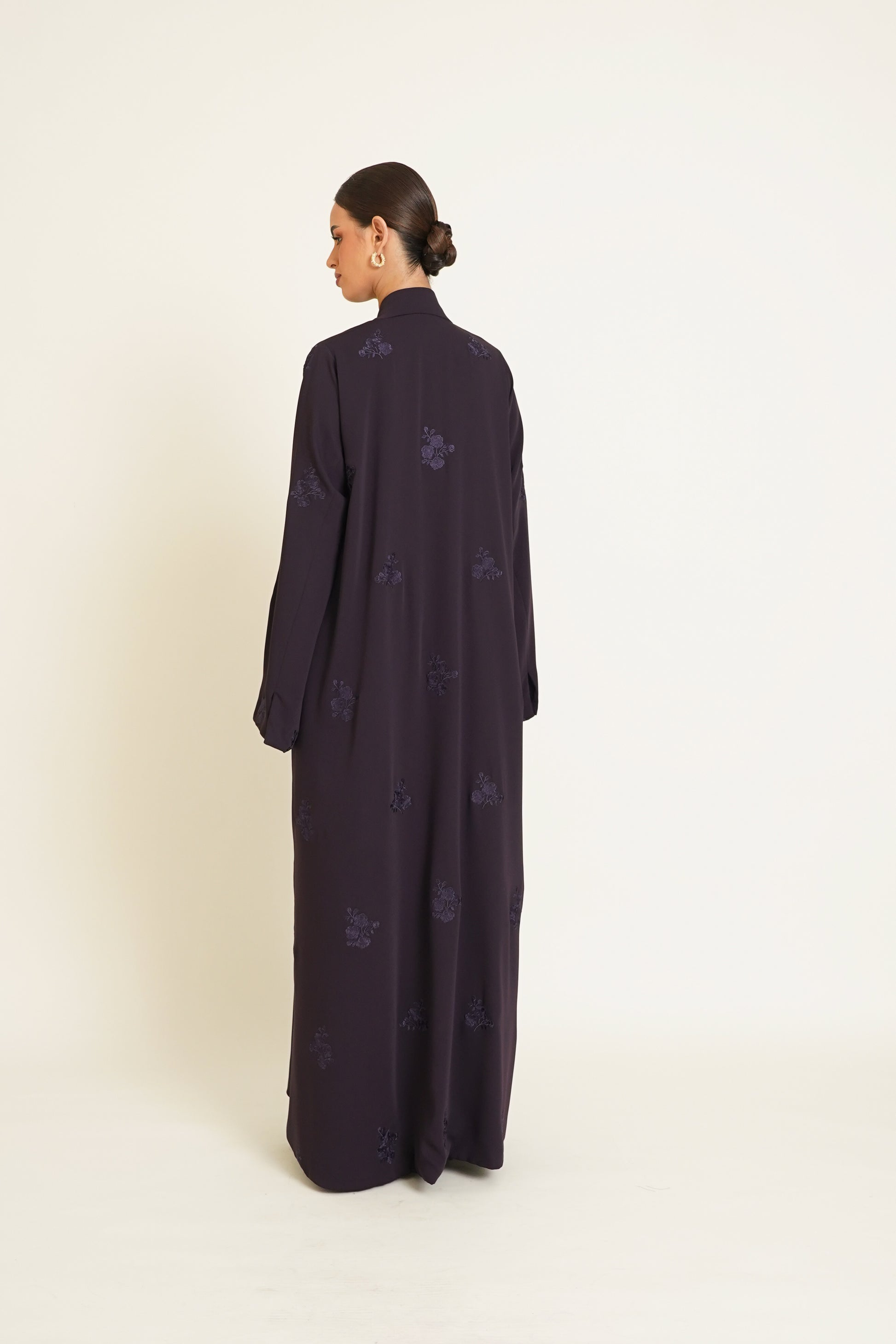 A Crepe Abaya adorned with floral embroidery and luxurious details for an elegant and sophisticated look.