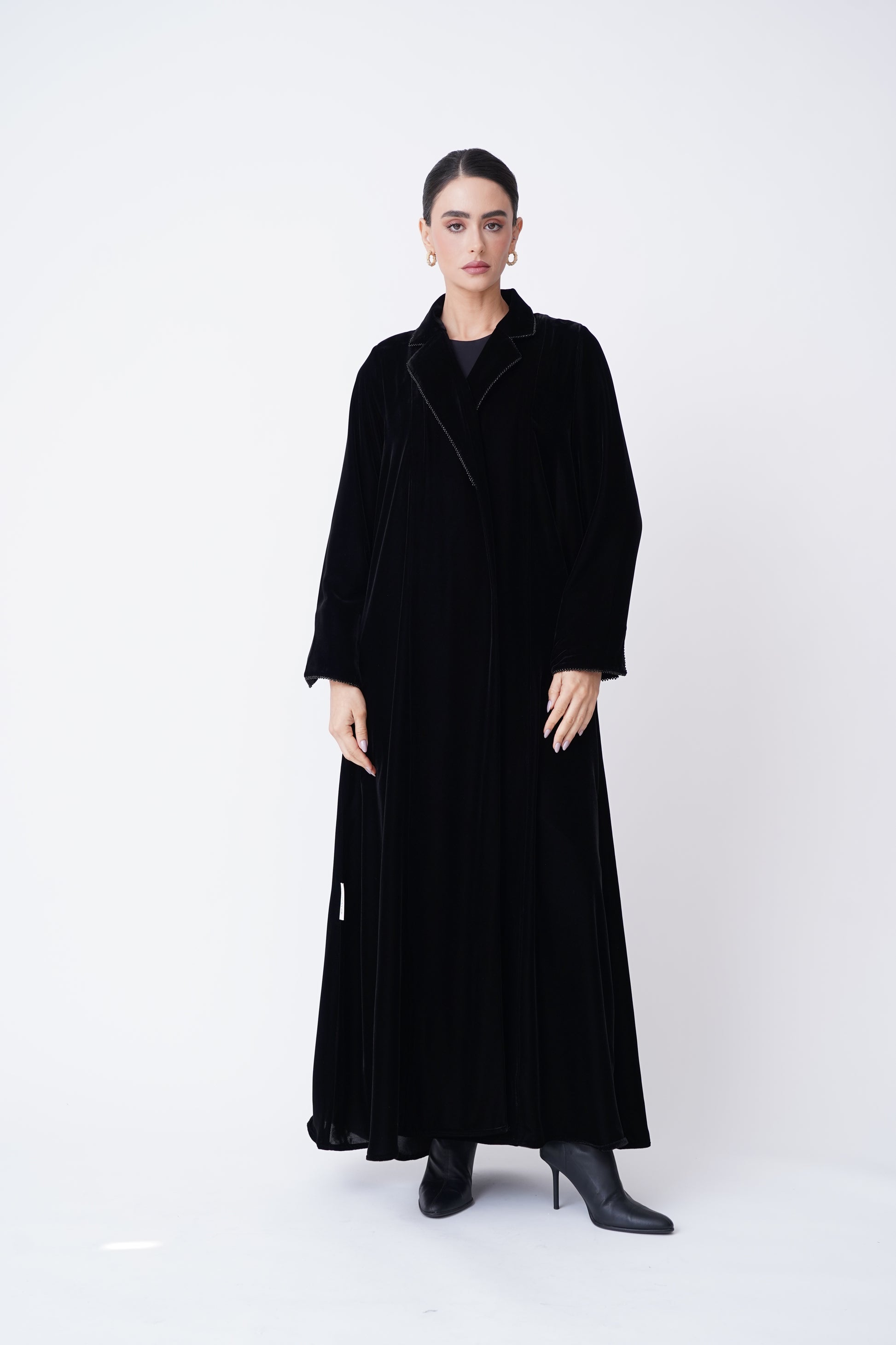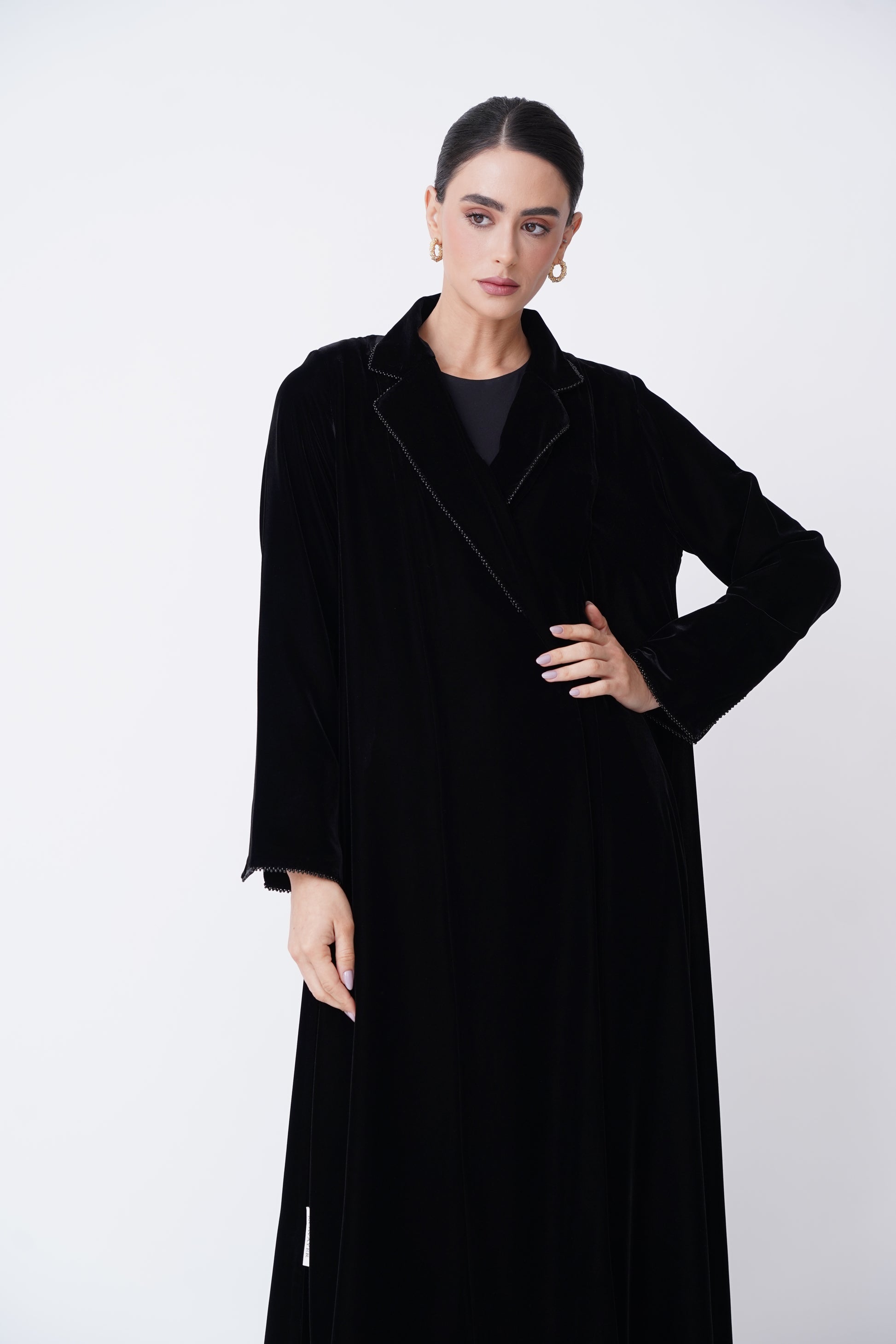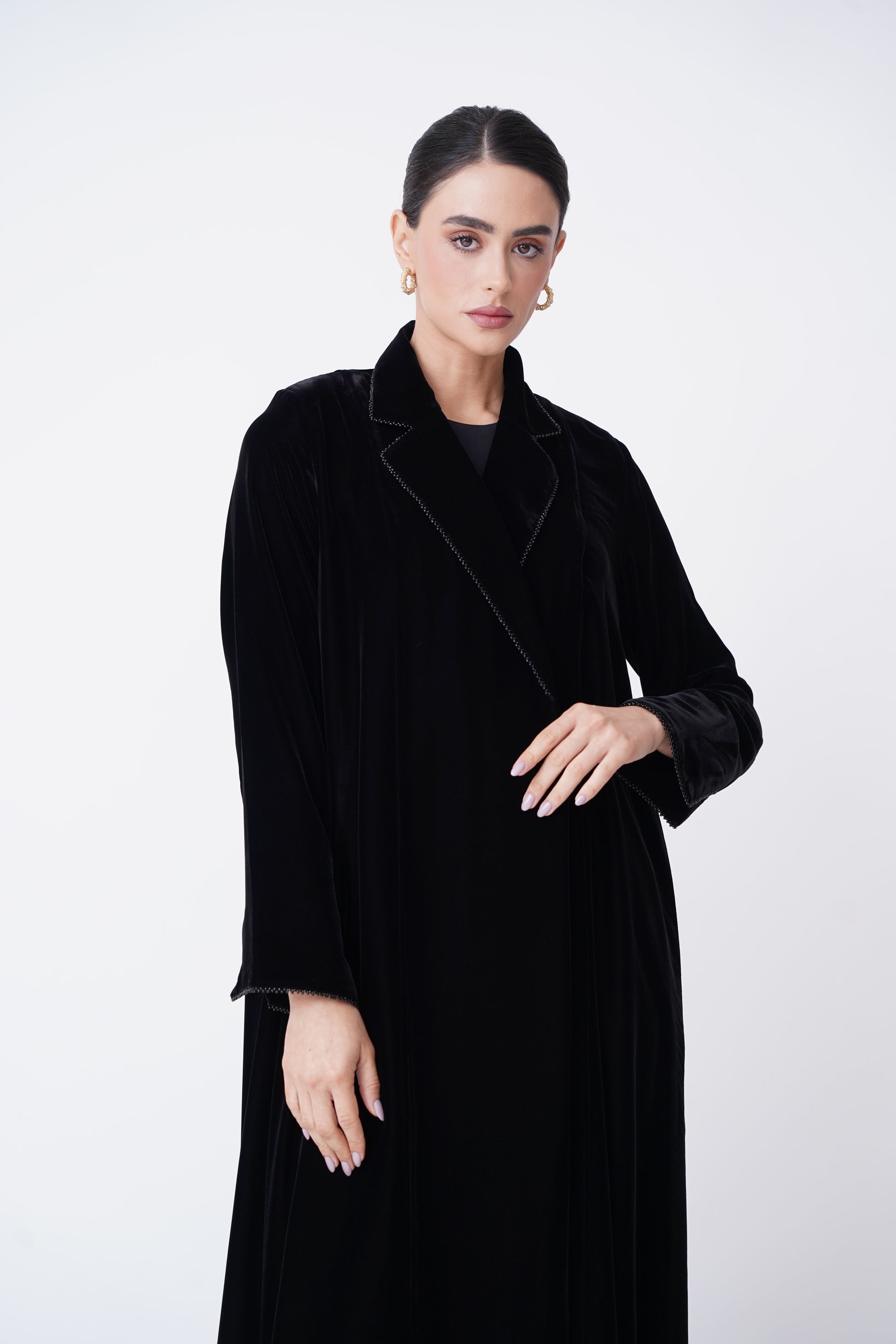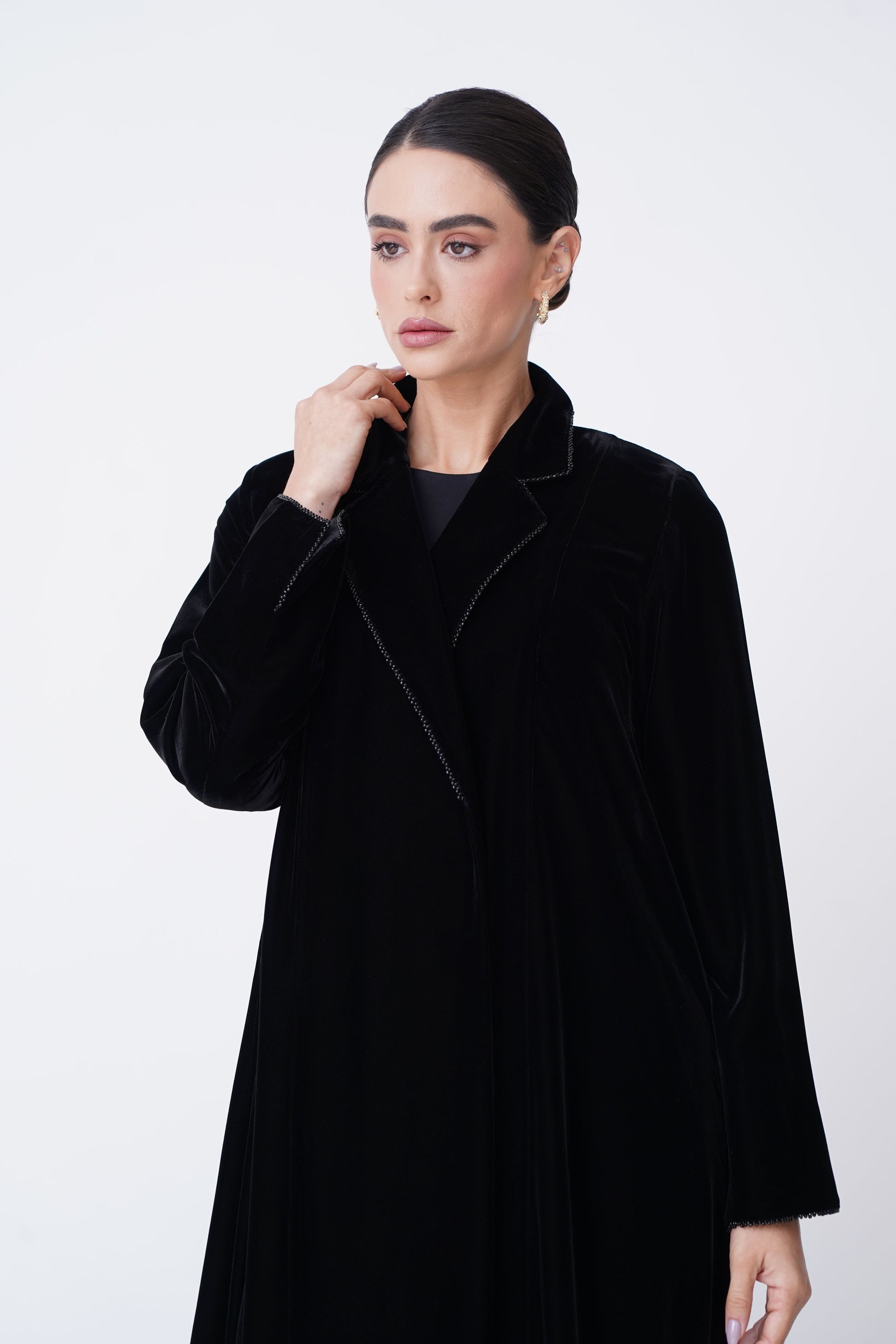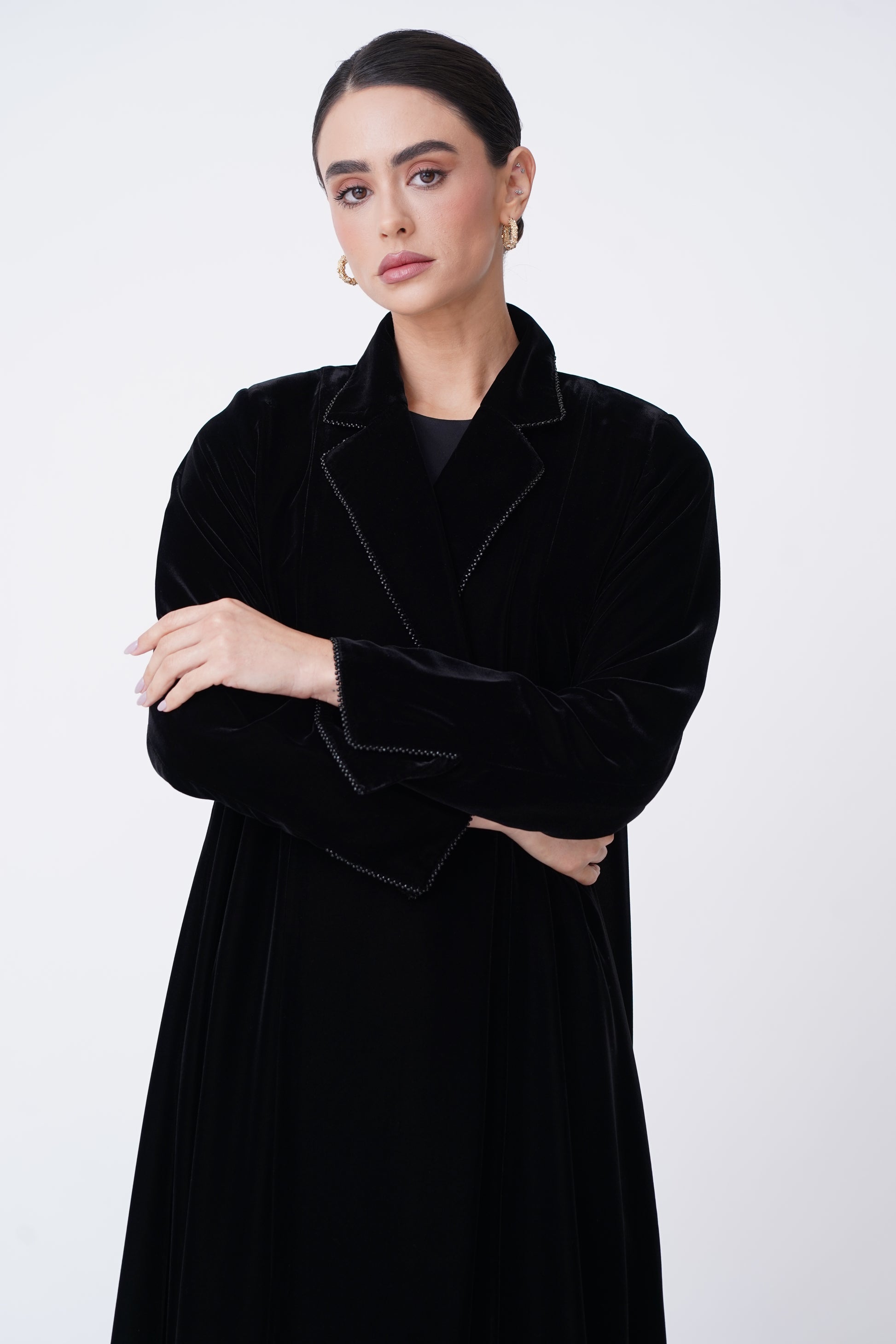A velvet abaya with a blazer design, distinguished by black bead details on the collar and sleeves.