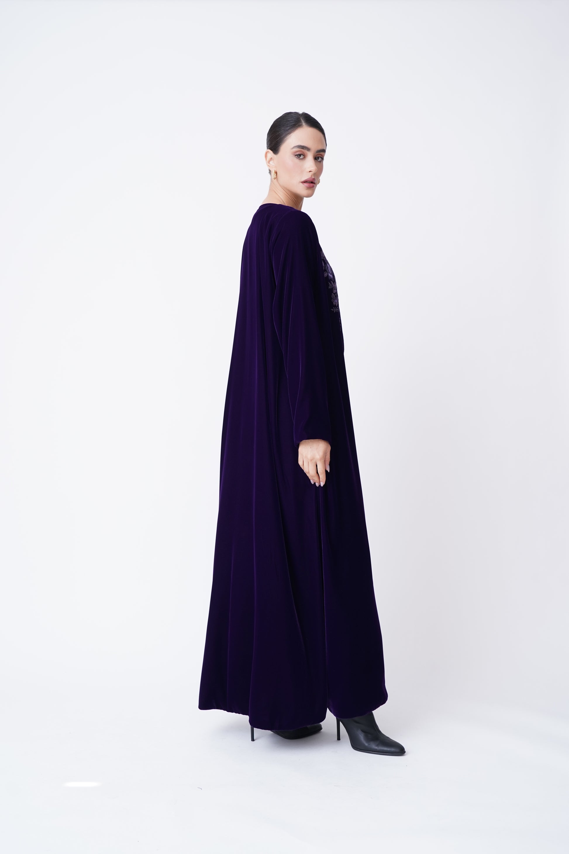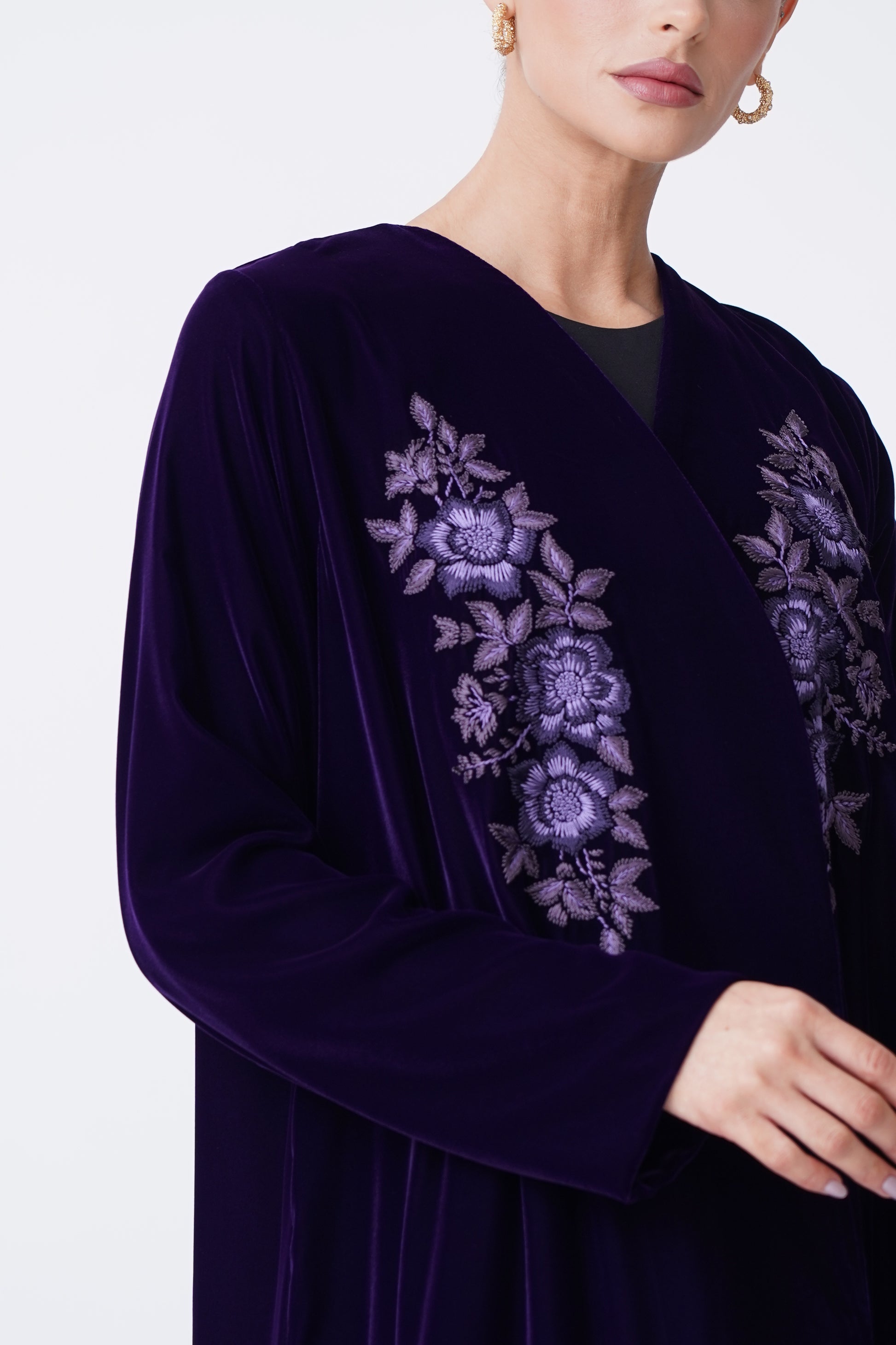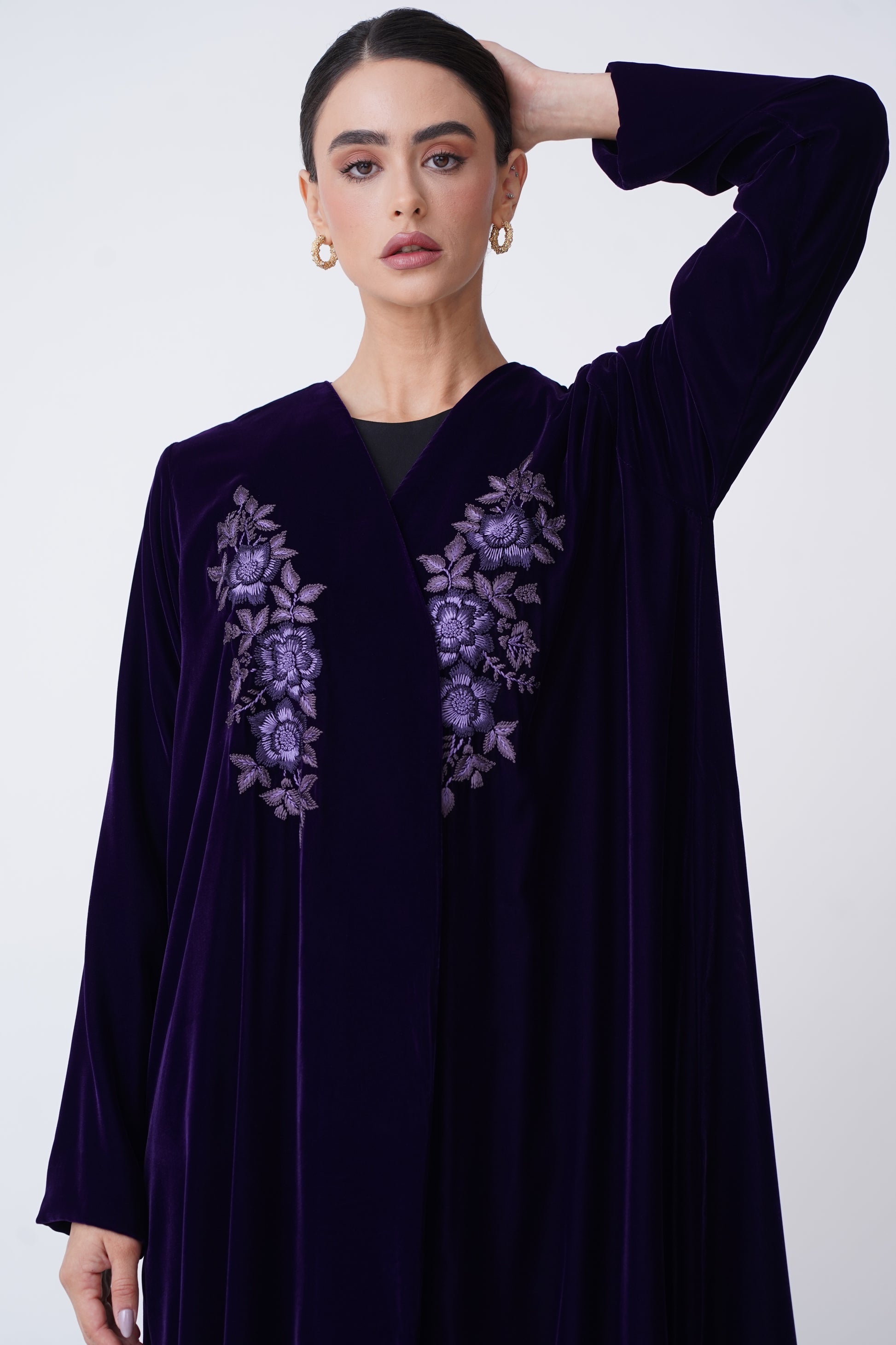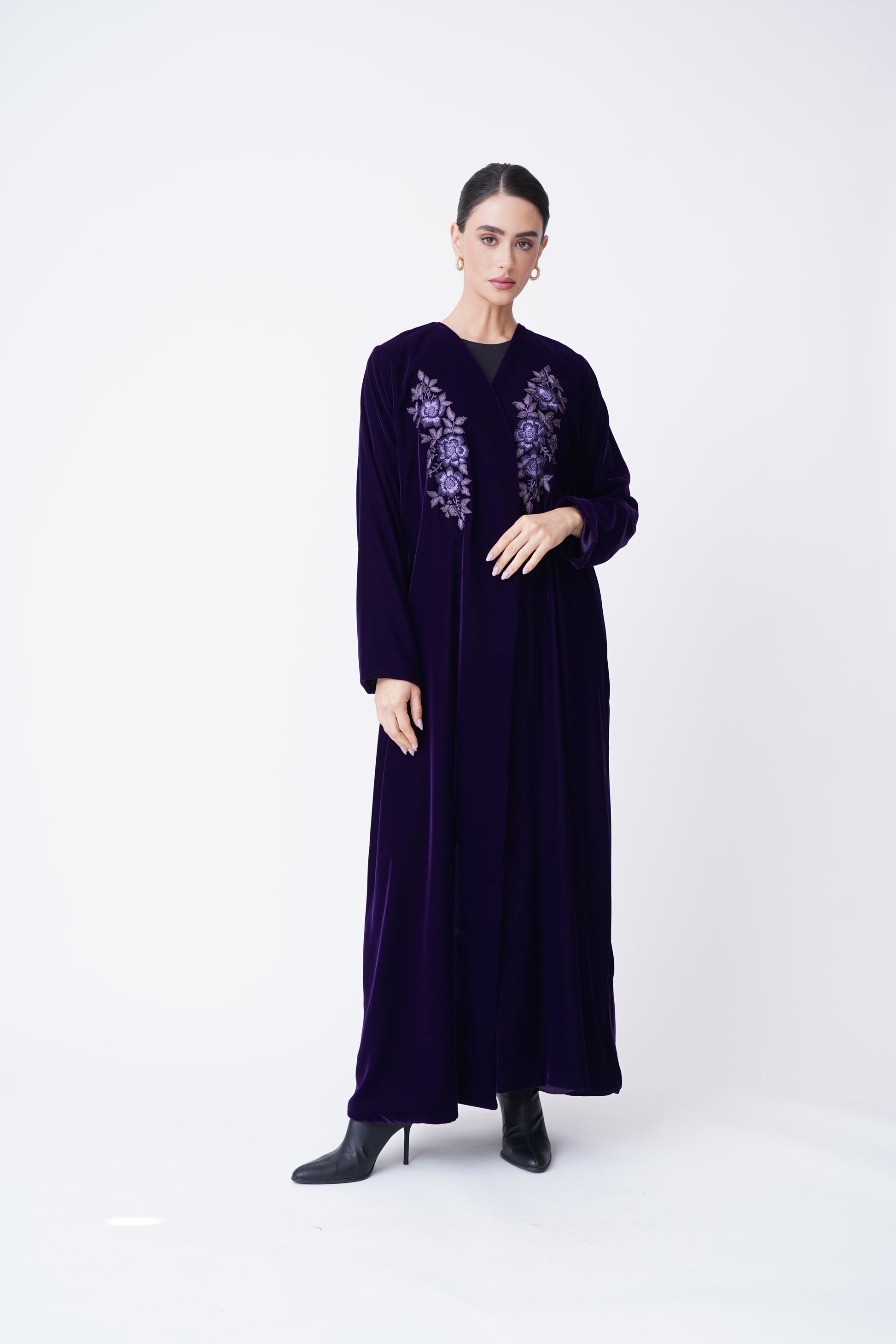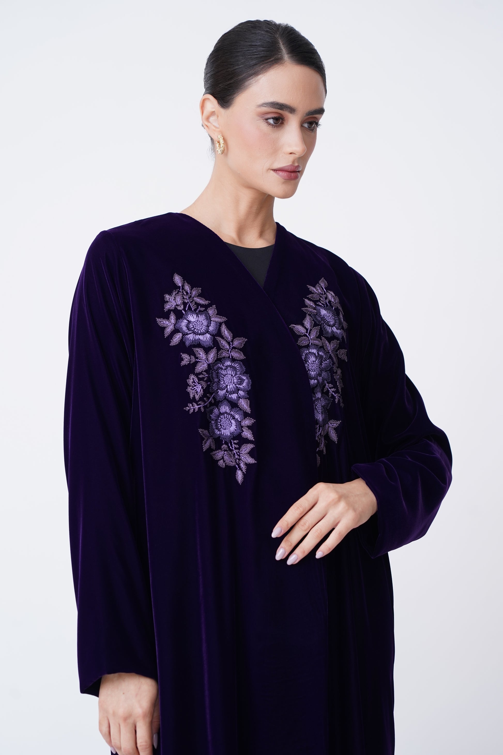 An elegant abaya adorned with symmetrical floral embroidery on both sides of the front.