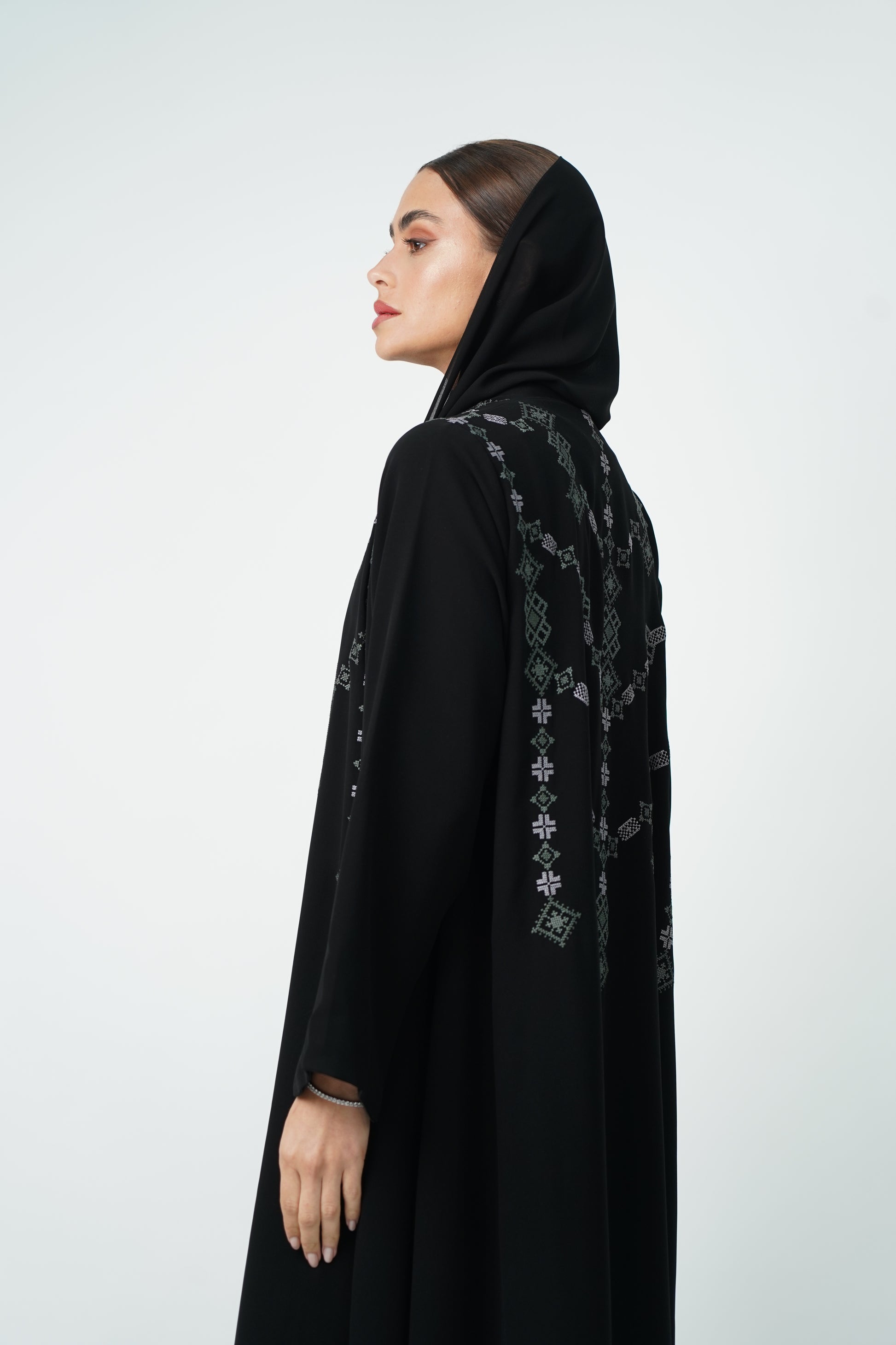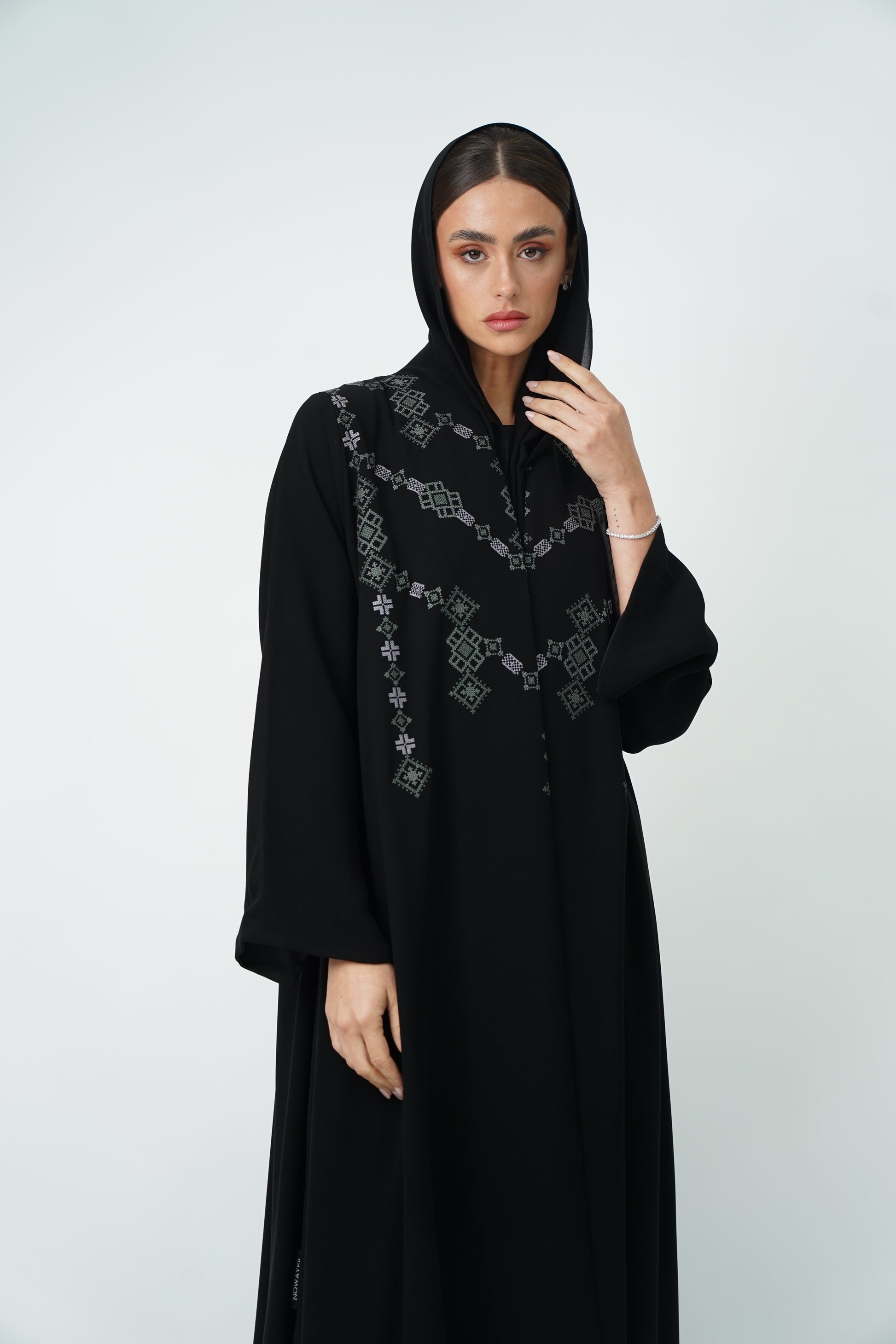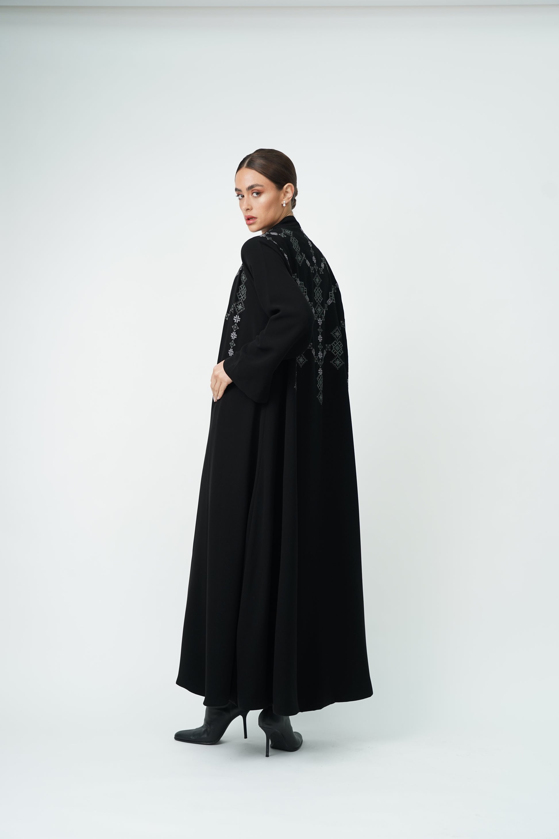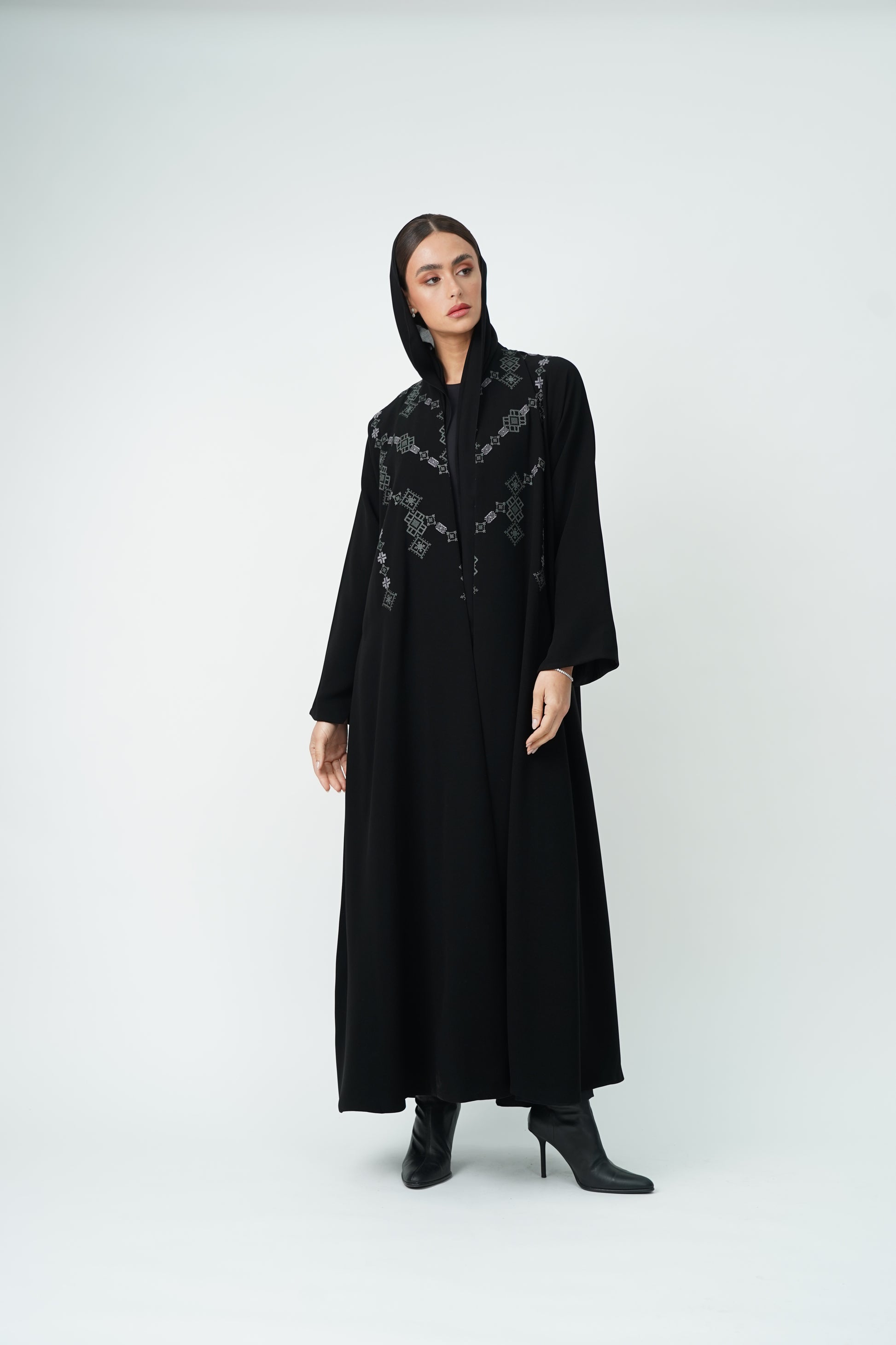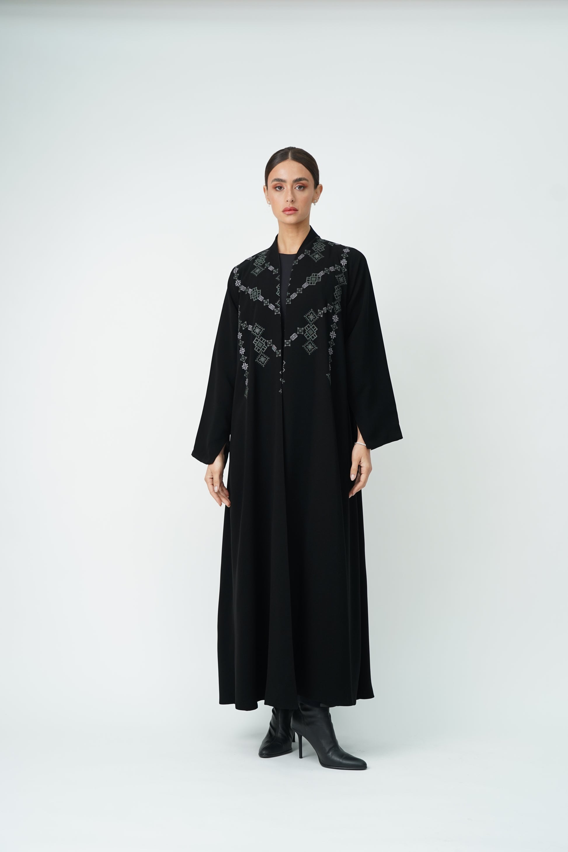 Abaya embroidered with geometric patterns on the front and back, offering you complete luxury.