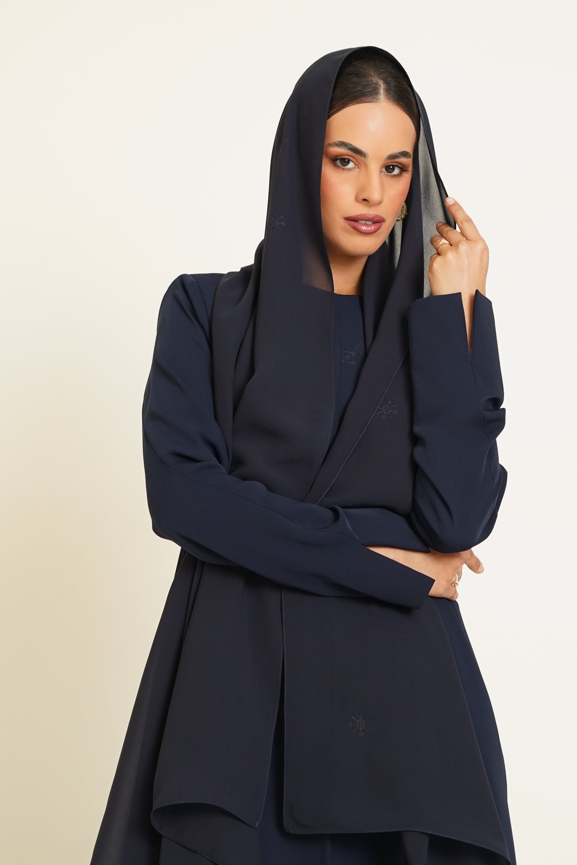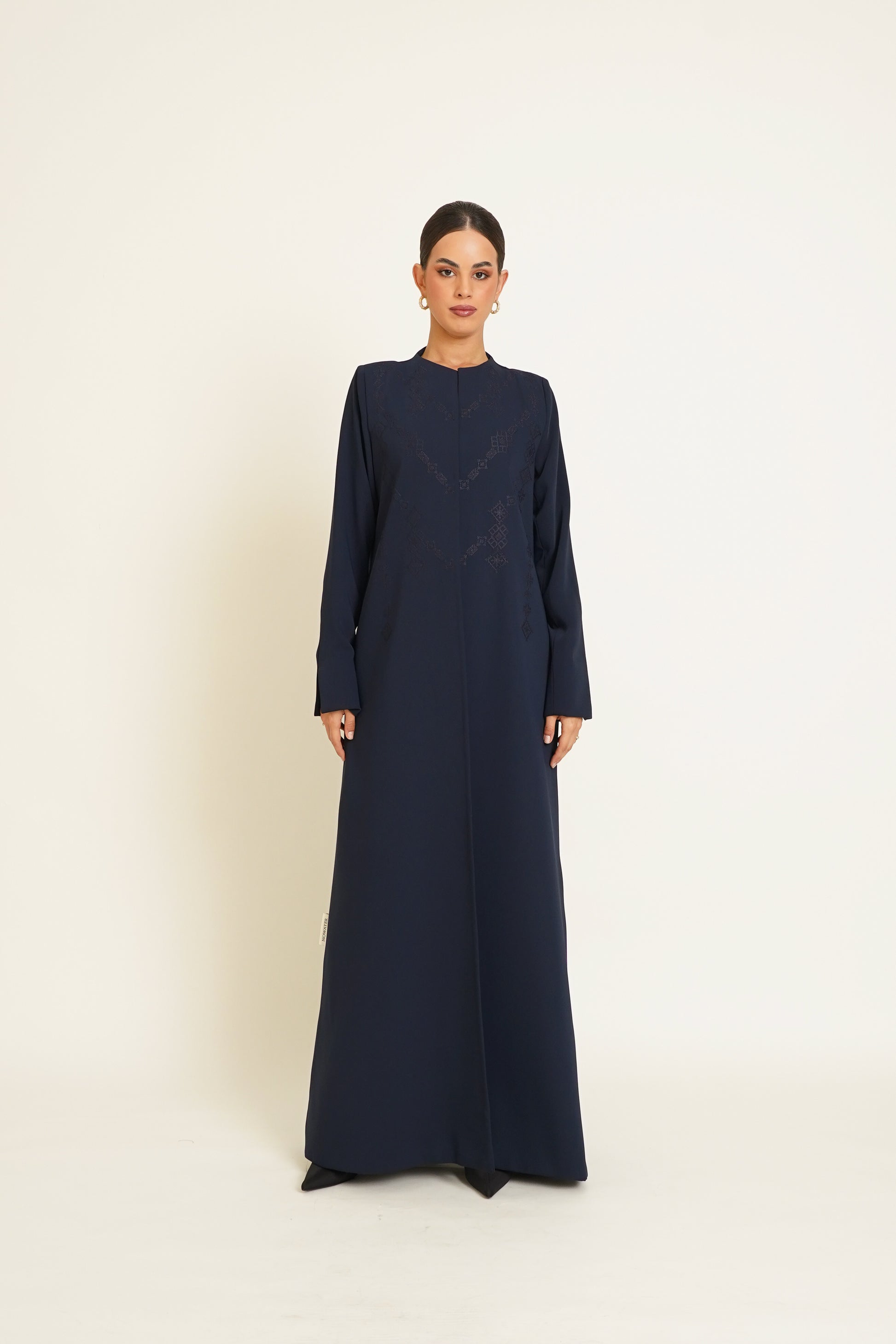 Abaya embroidered with geometric patterns on the front and back, paired with a fully embroidered sheila in matching designs, offering you complete luxury.