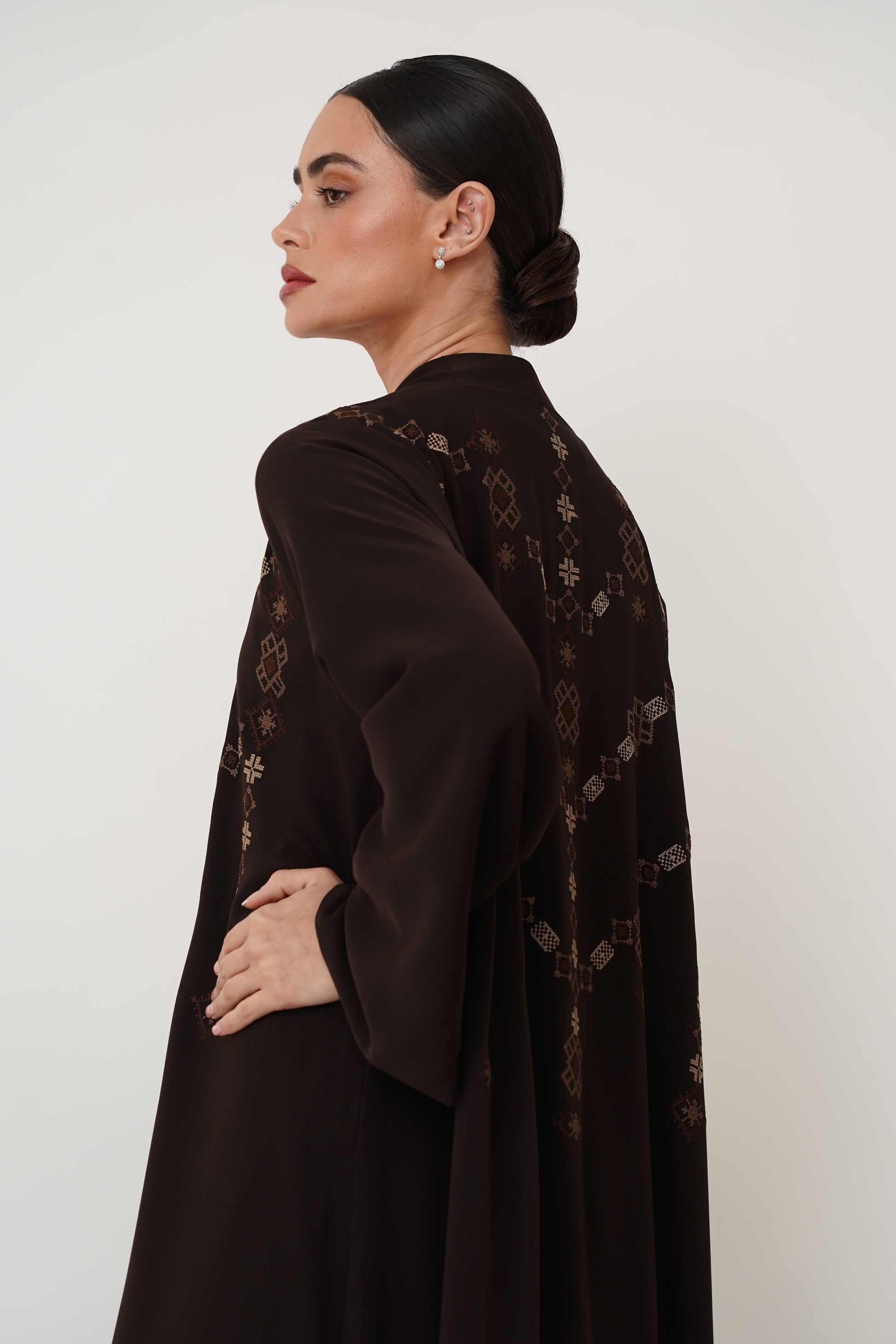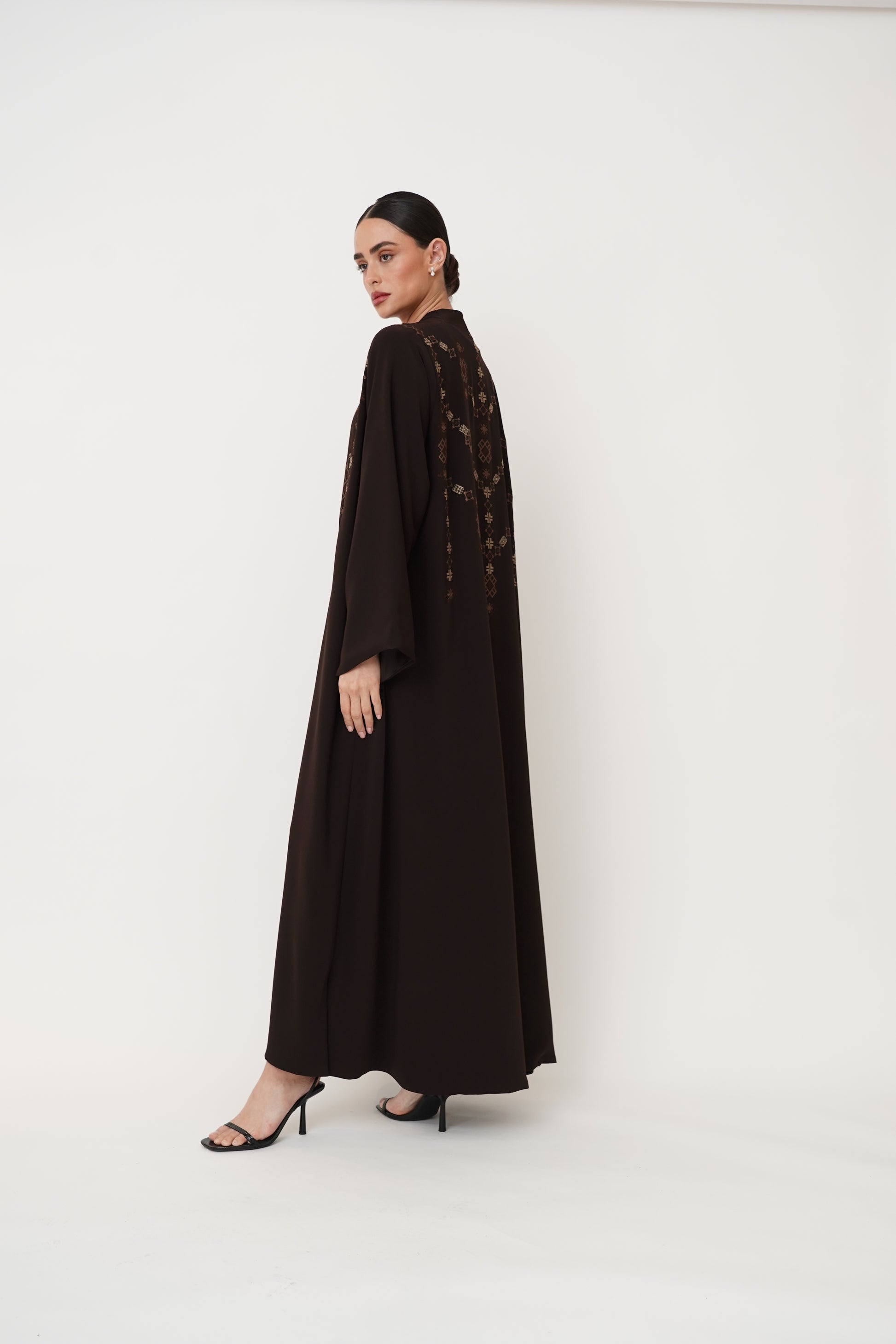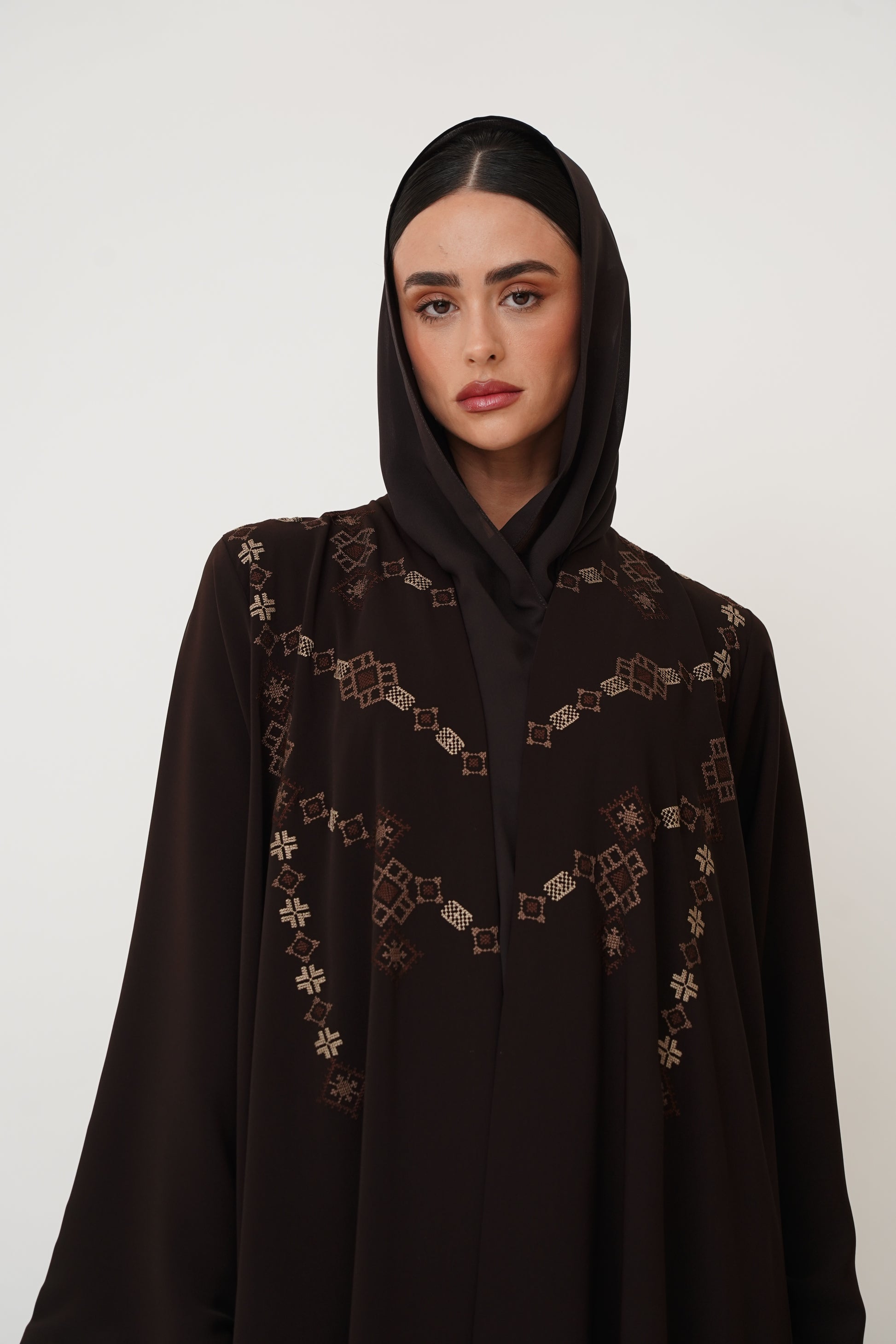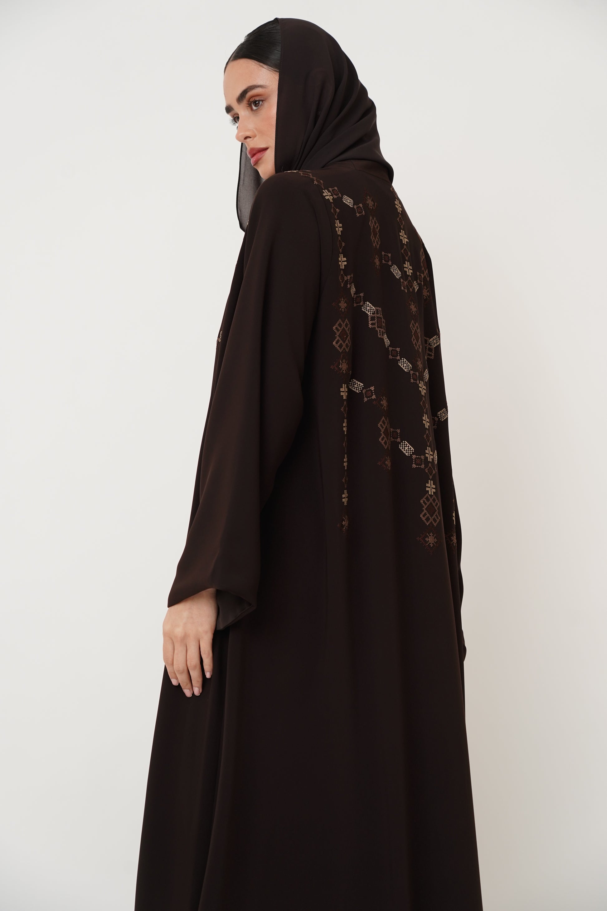 Abaya embroidered with geometric patterns on the front and back, offering you complete luxury.