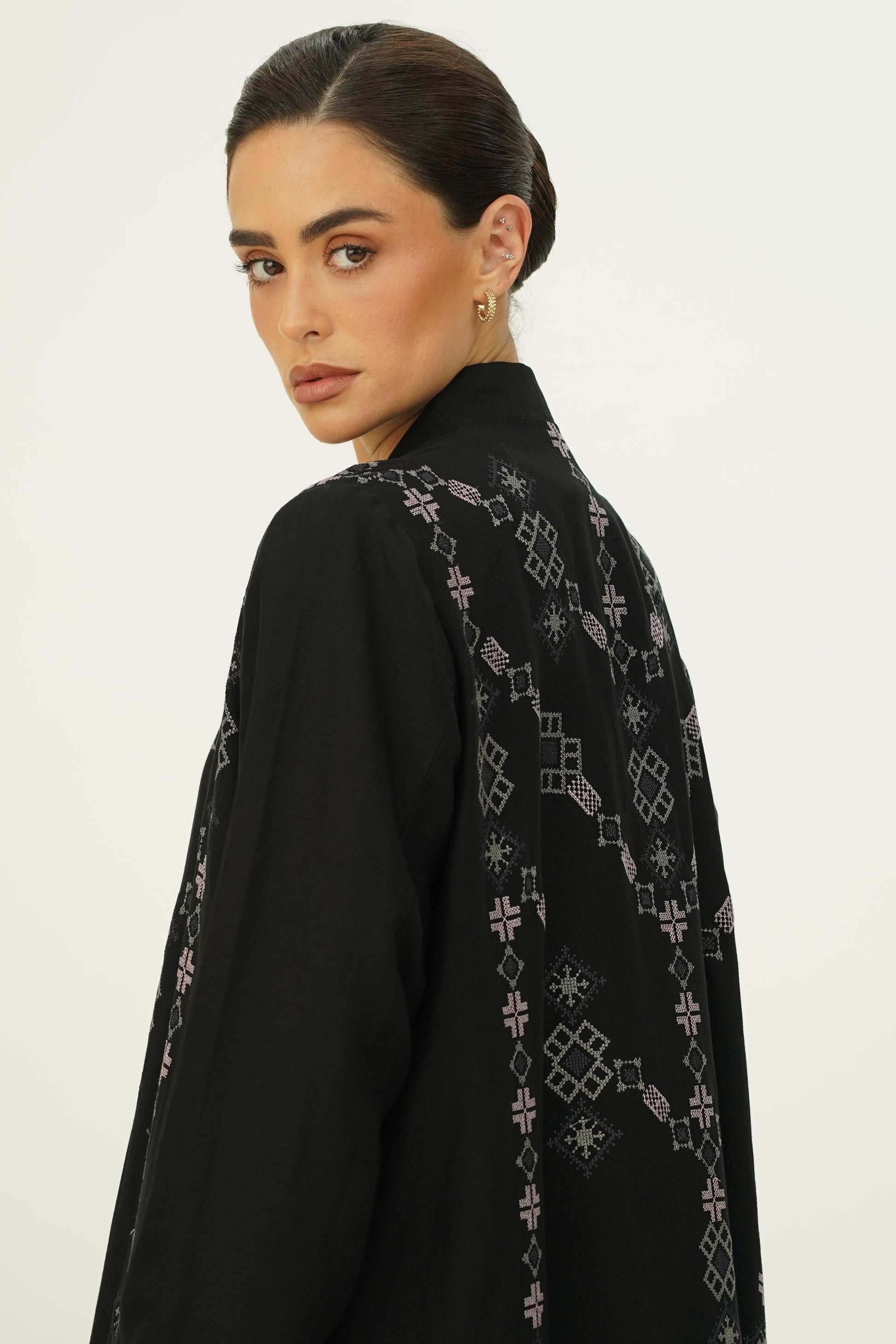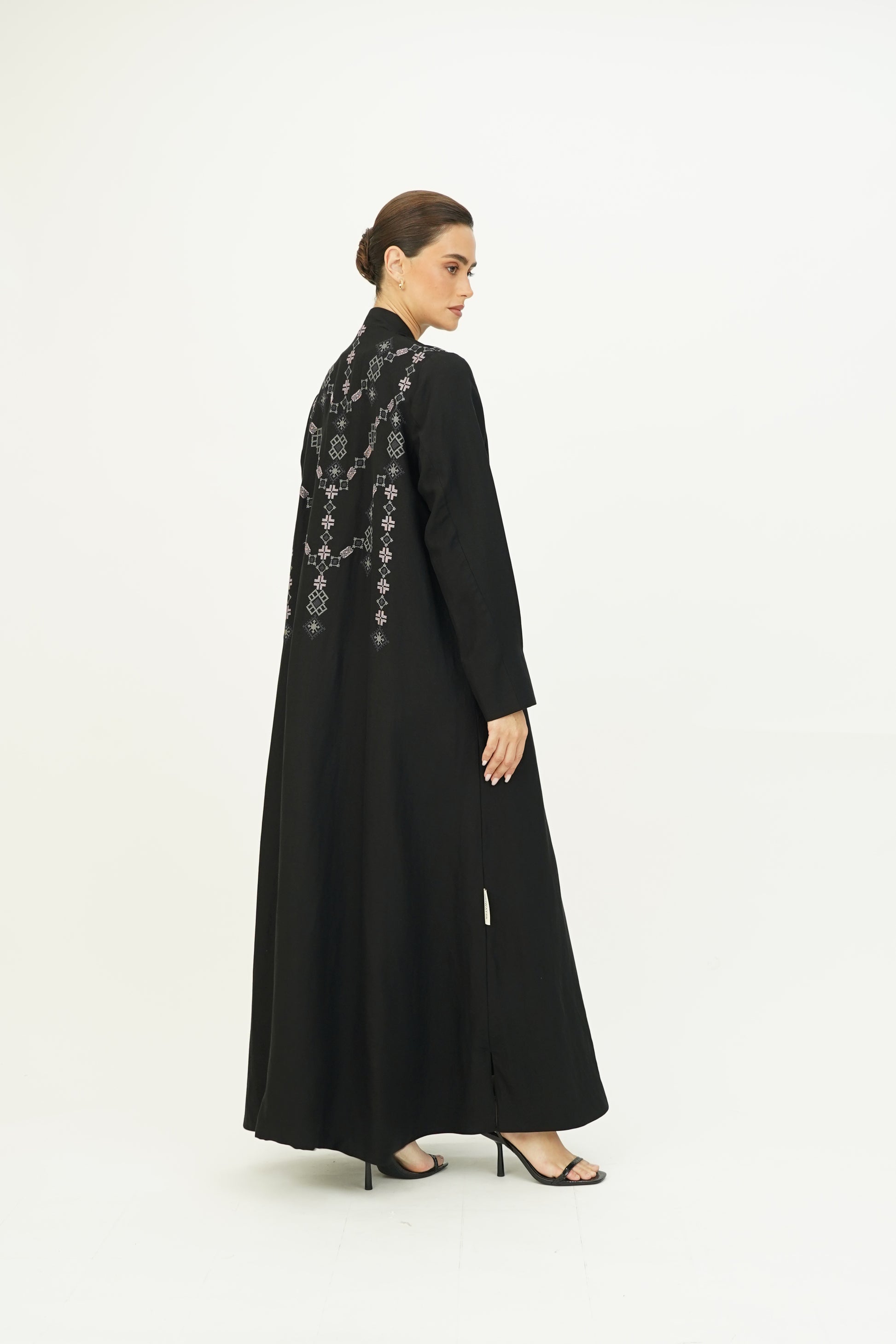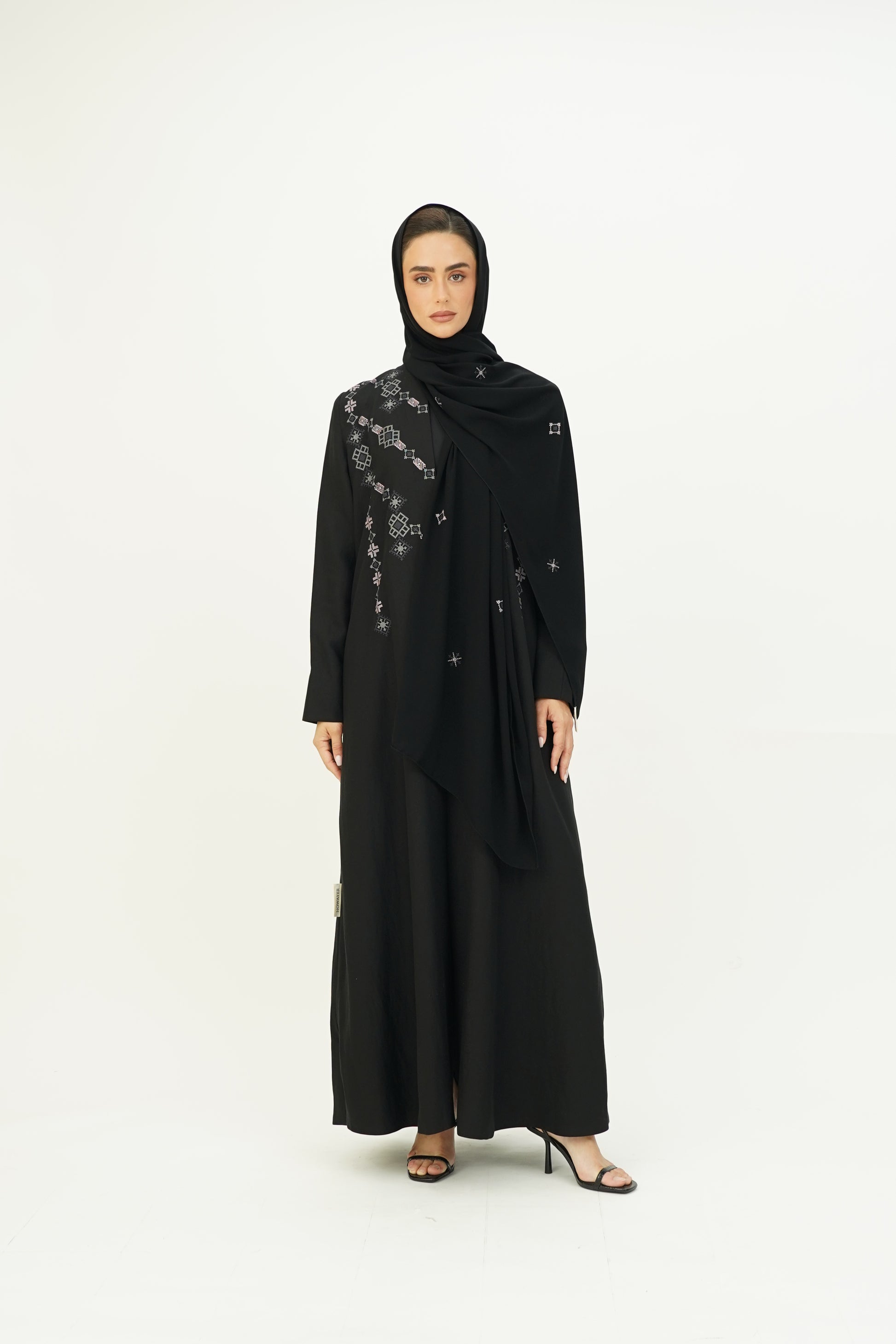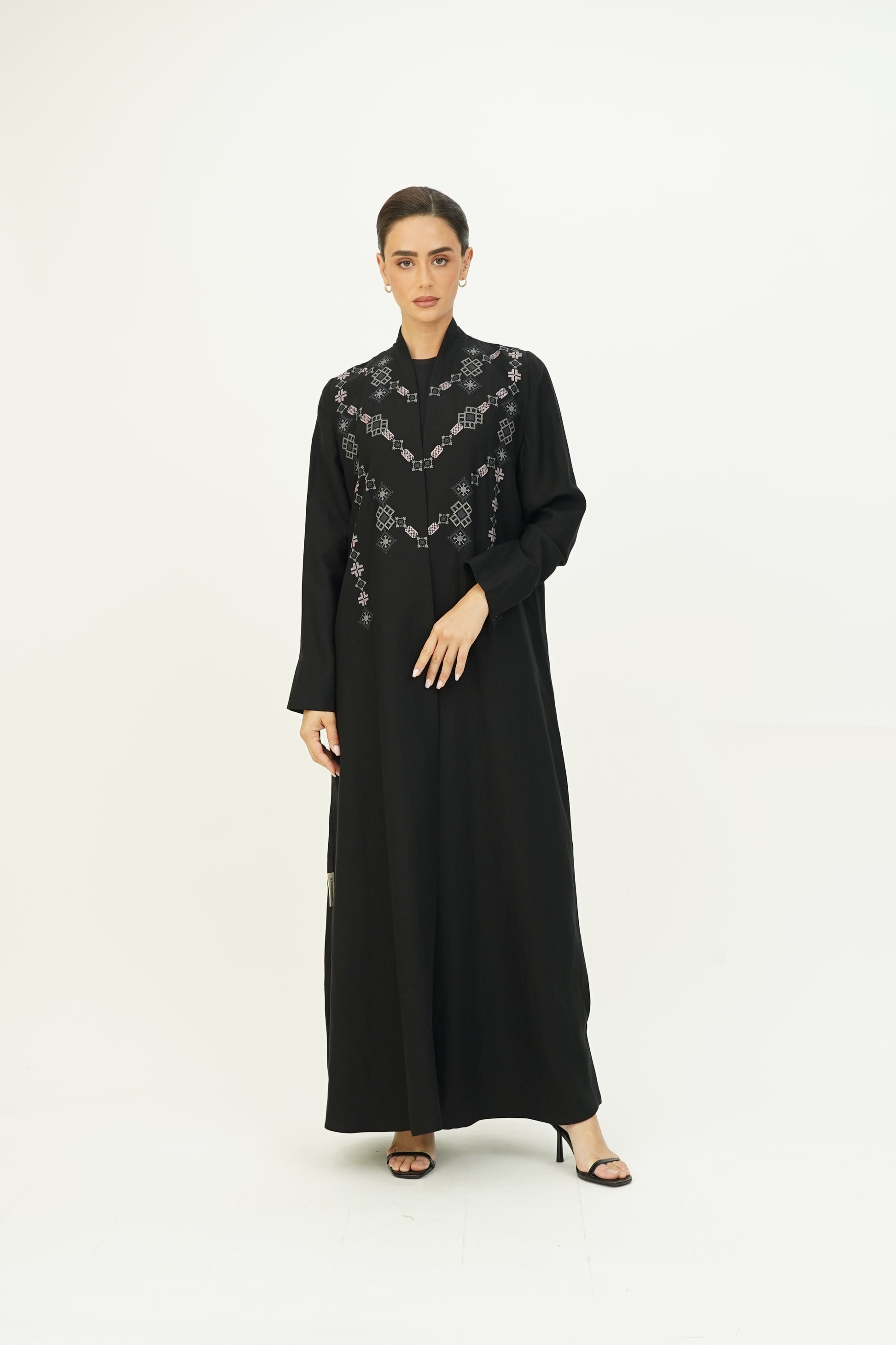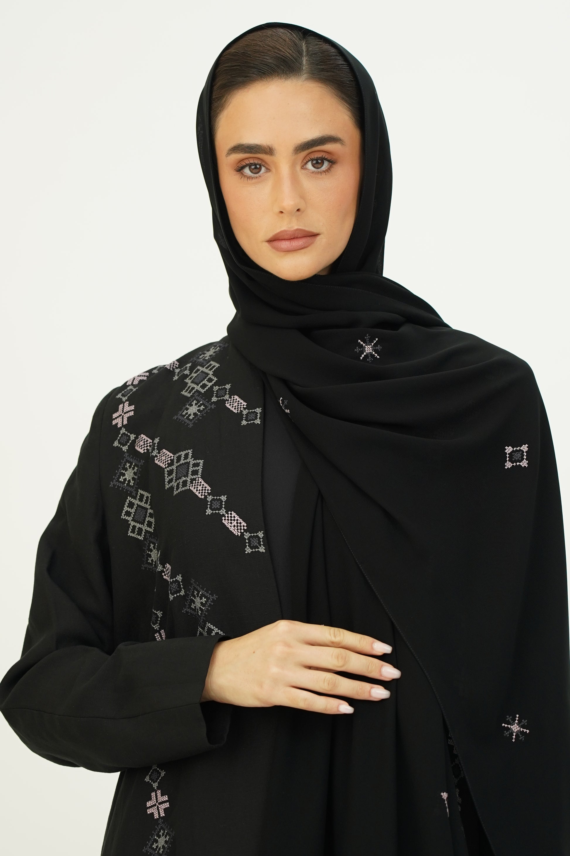 Abaya embroidered with geometric patterns on the front and back, paired with a fully embroidered sheila in matching designs, offering you complete luxury.