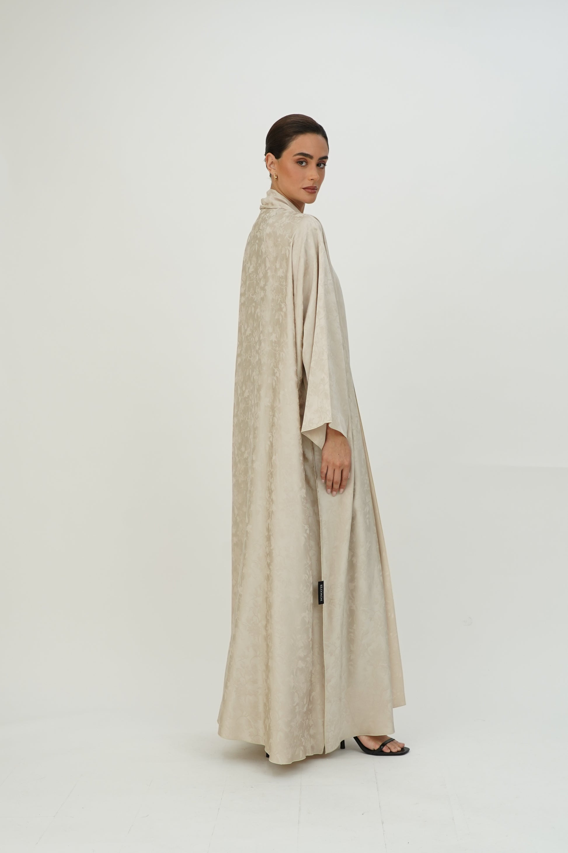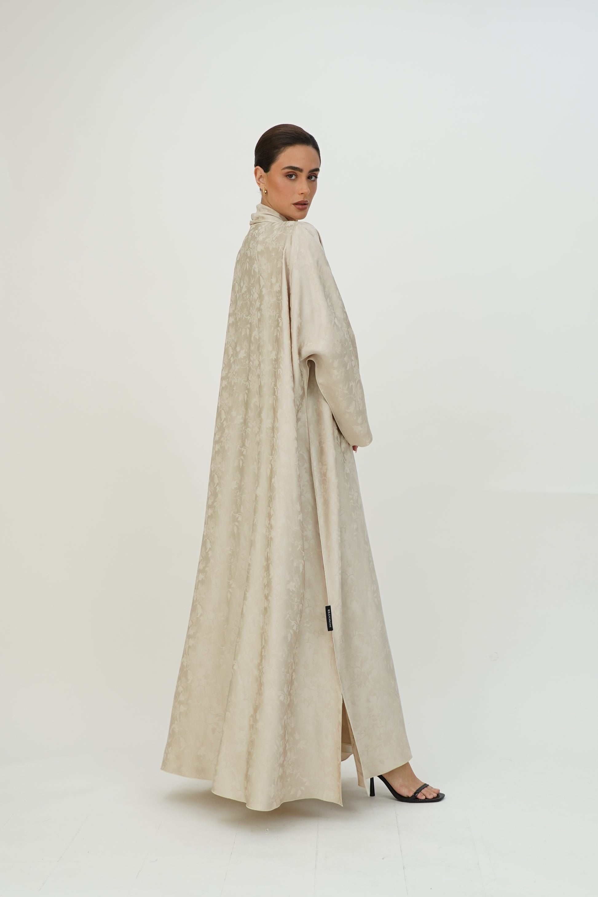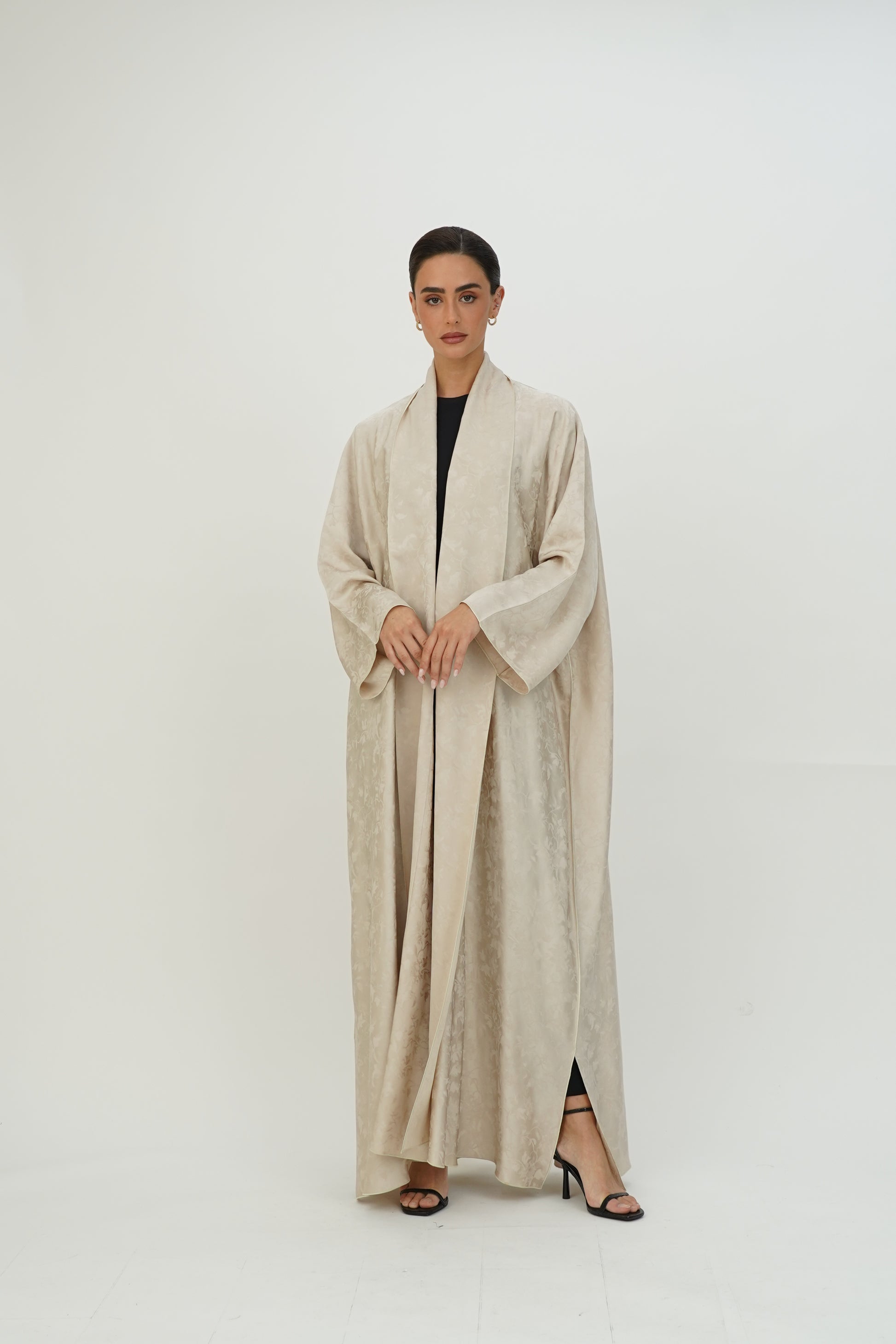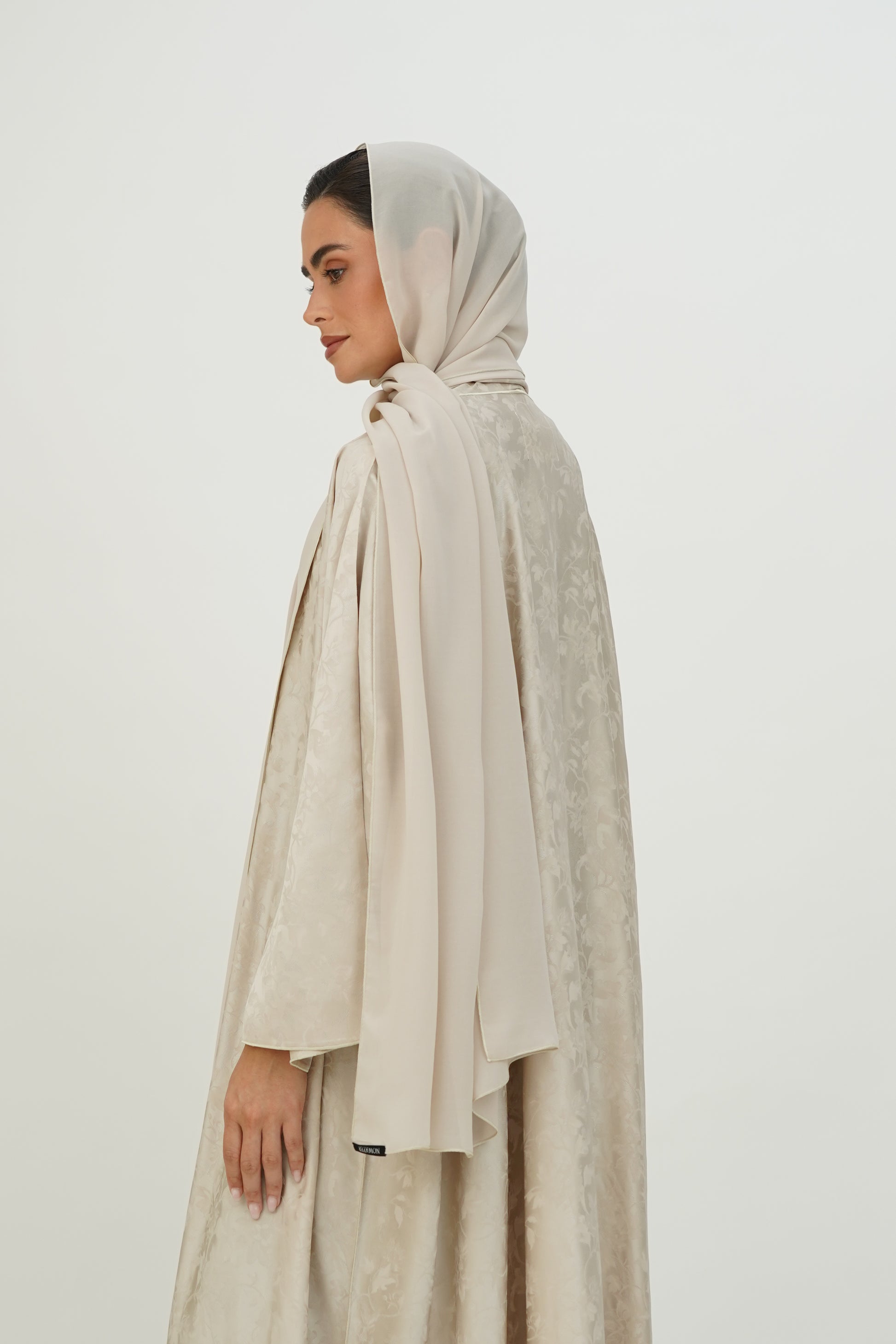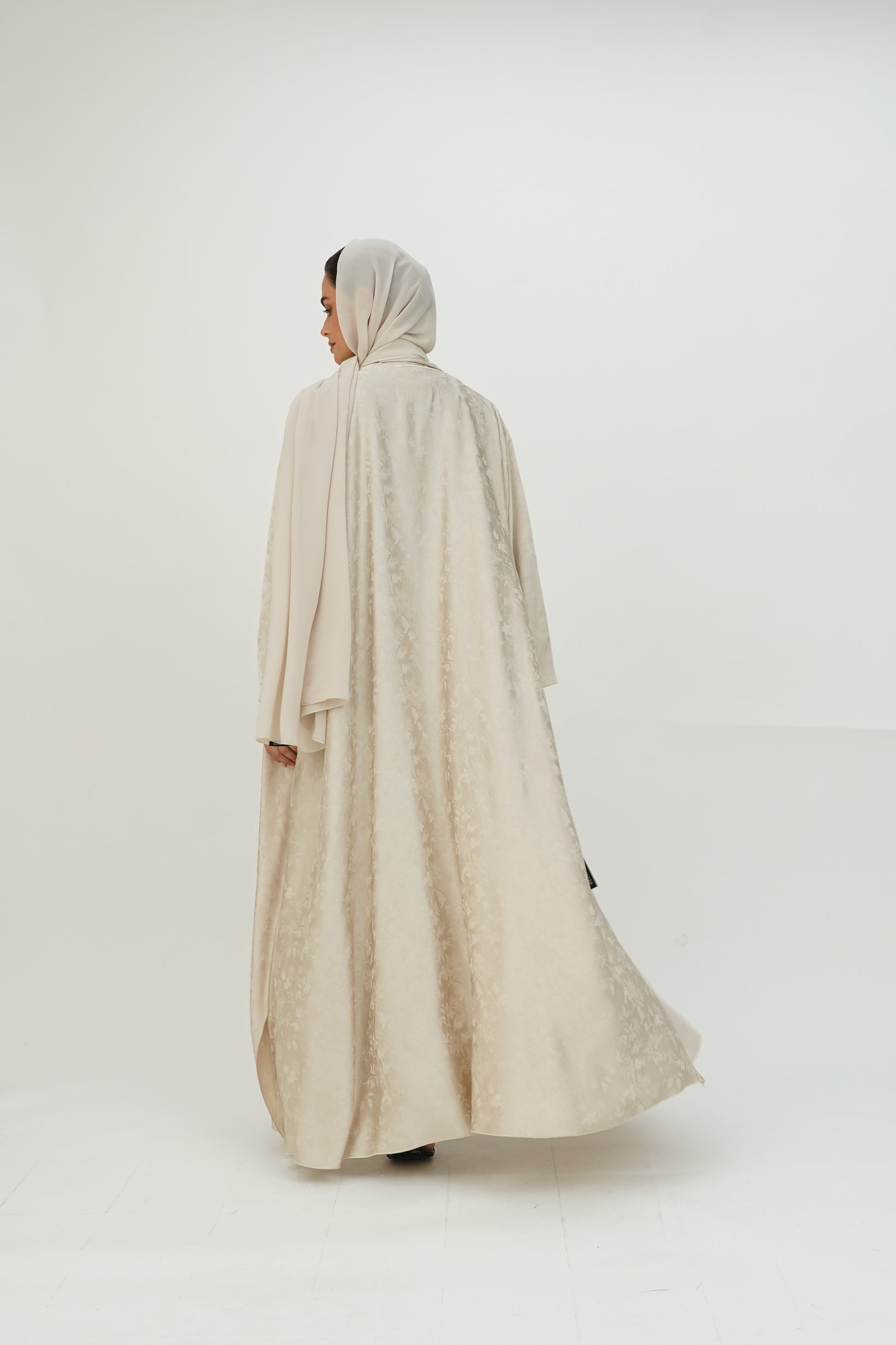 Wide abaya with delicate floral patterns, fine silk embroidery on the edges, and side slits, paired with a sheila adorned with thin embroidery along the borders.