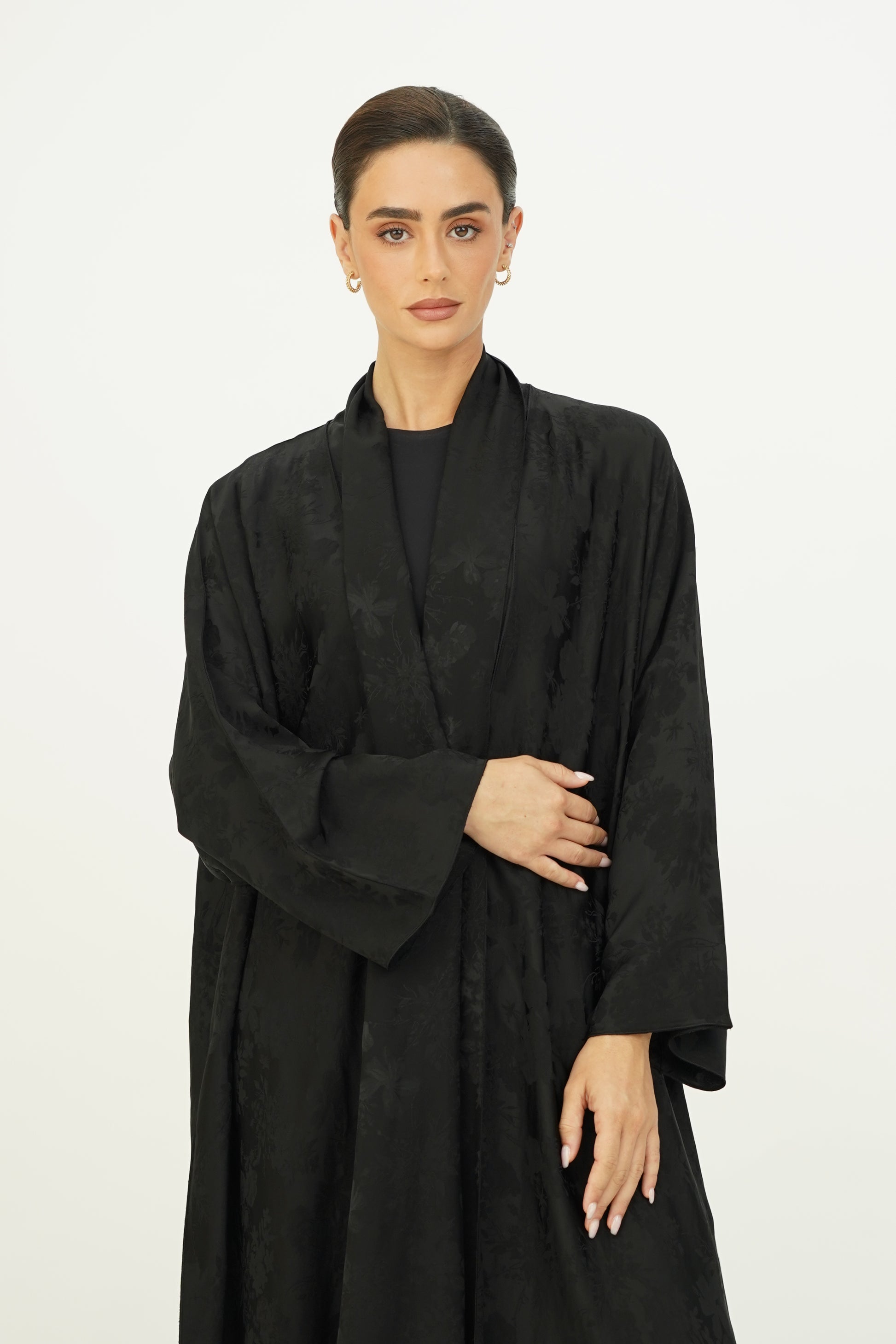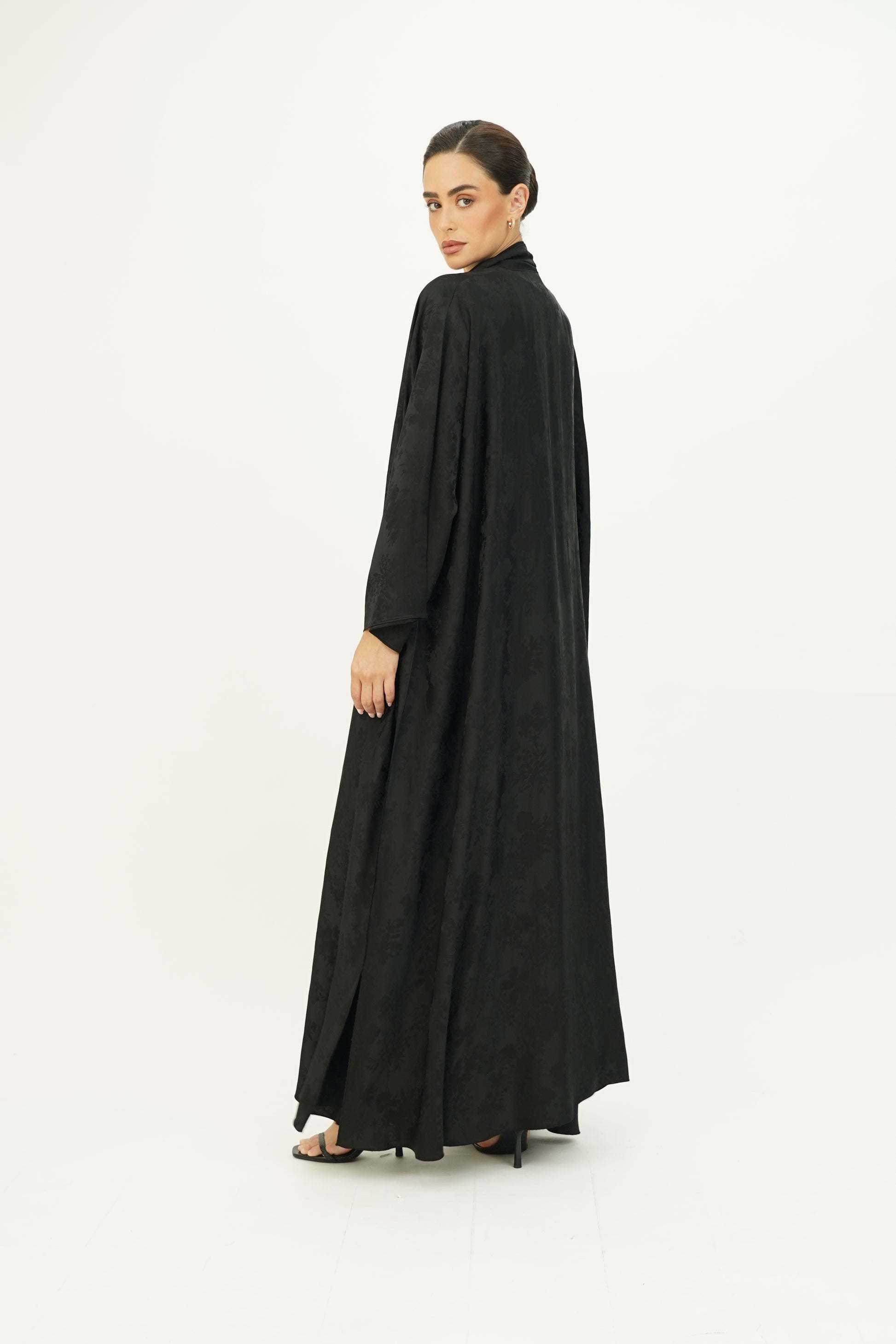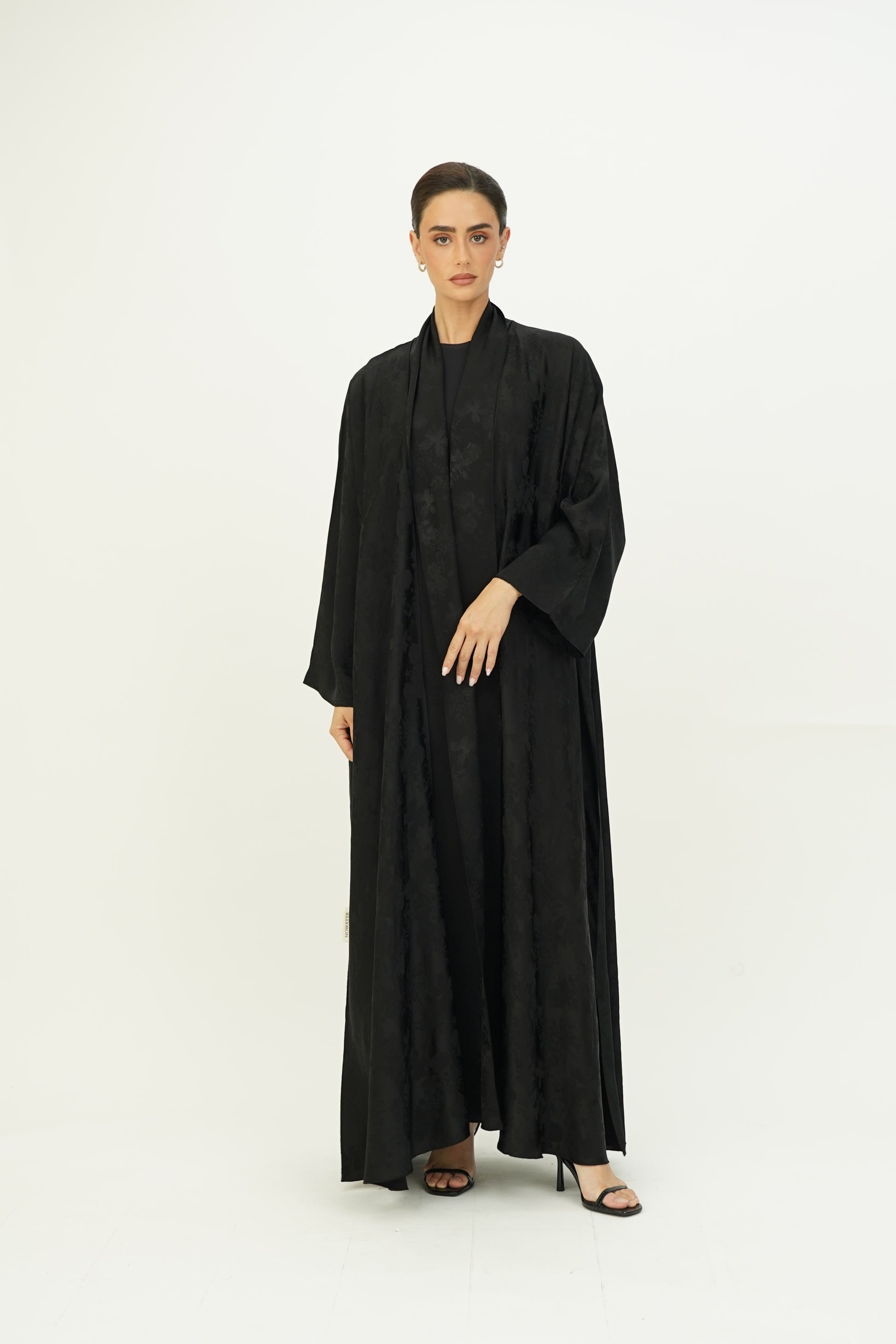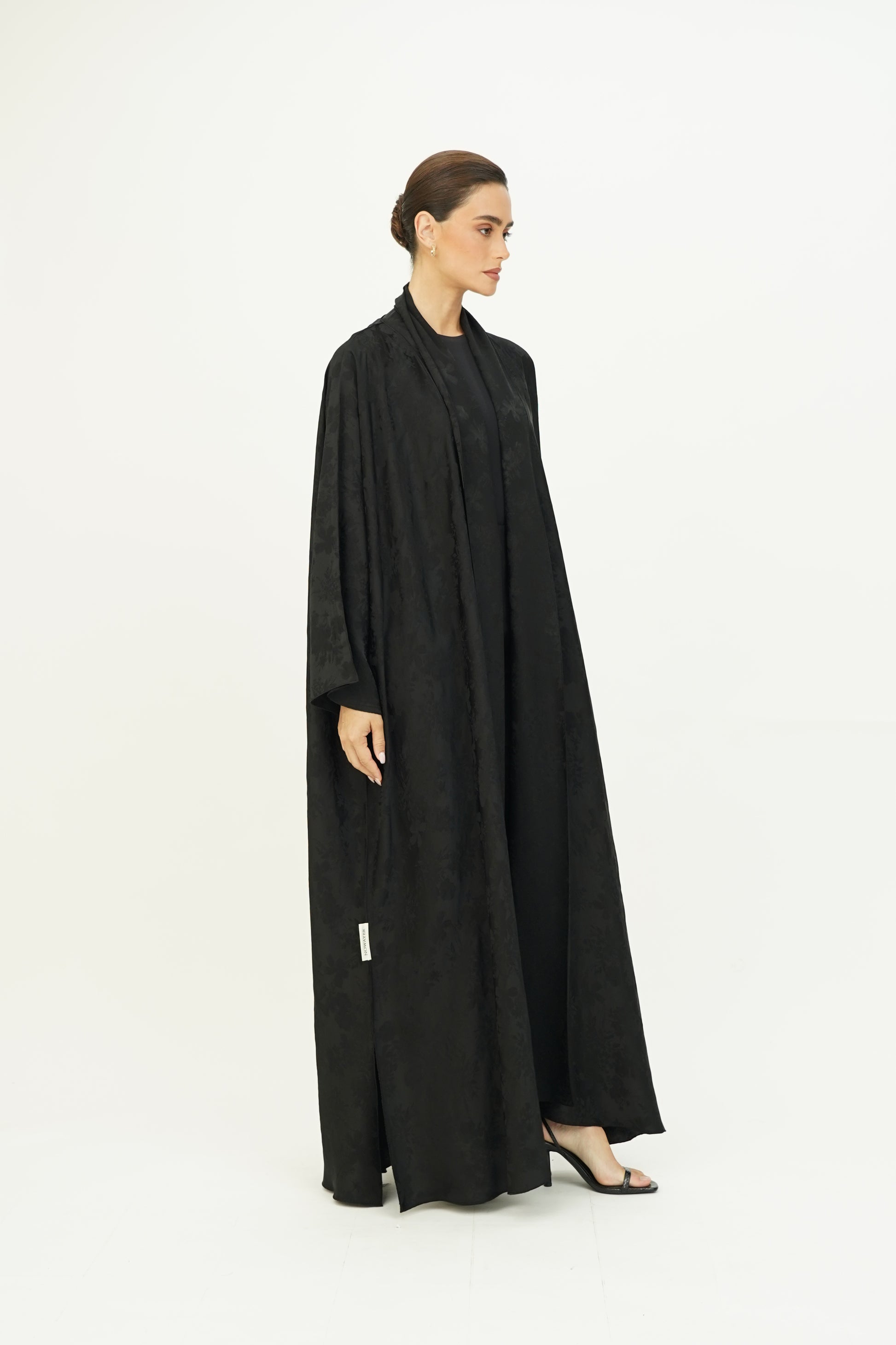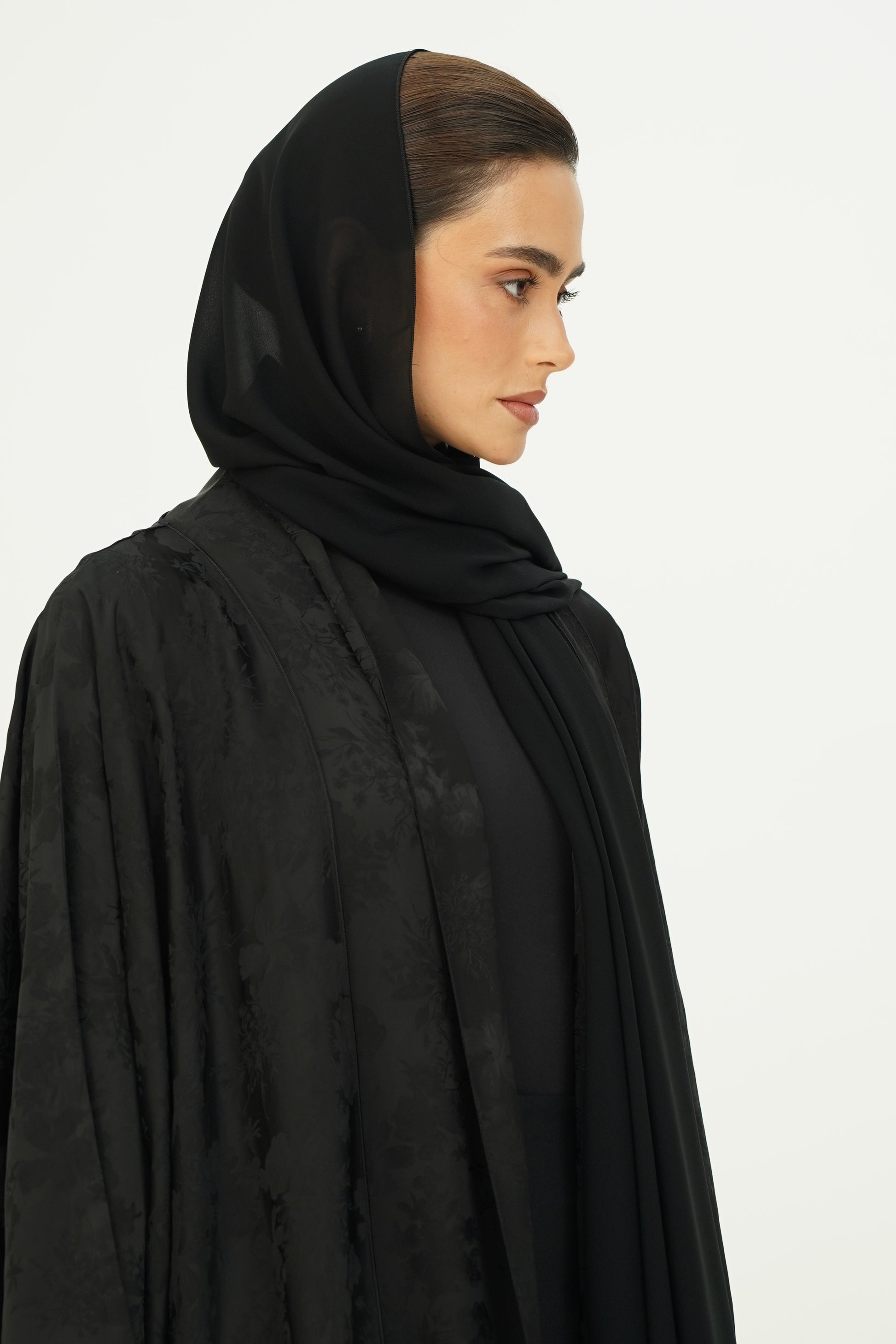 Wide abaya with delicate floral patterns, fine silk embroidery on the edges, and side slits, paired with a sheila adorned with thin embroidery along the borders.