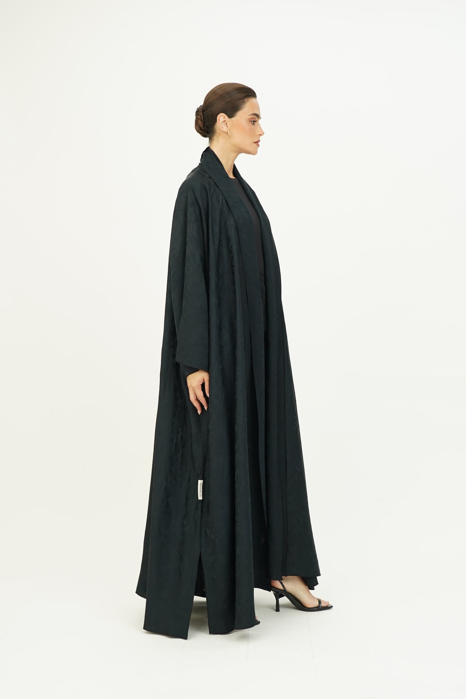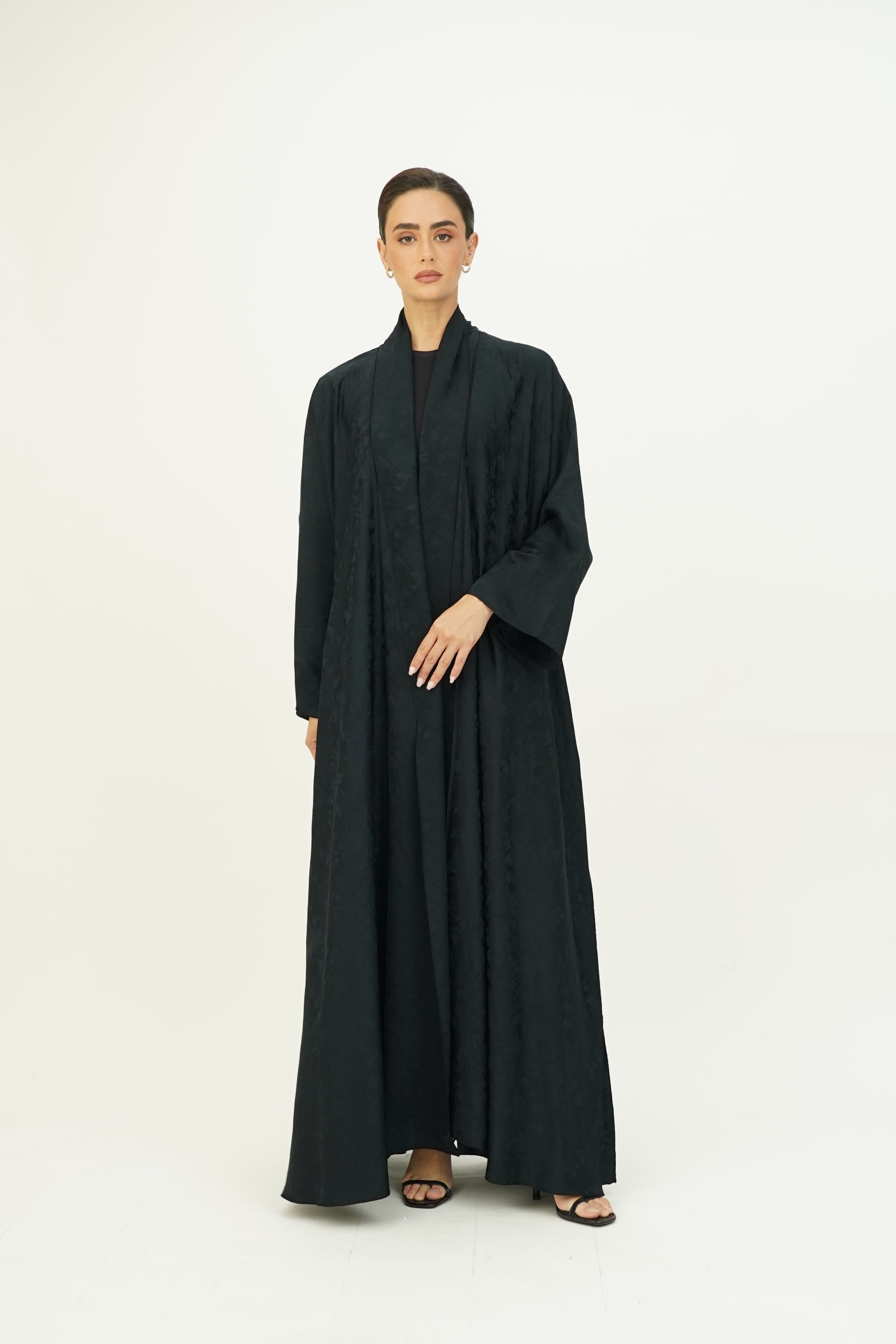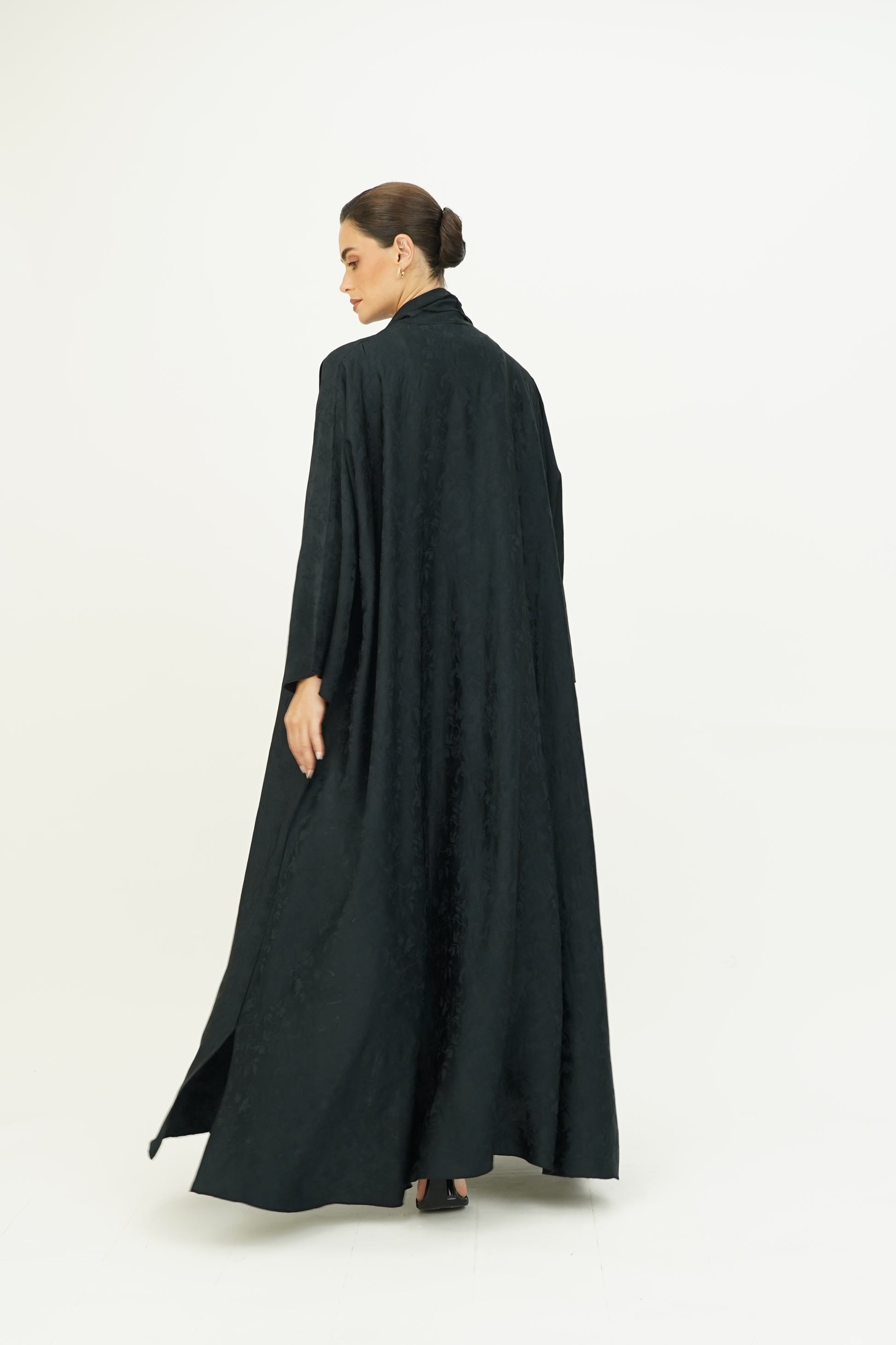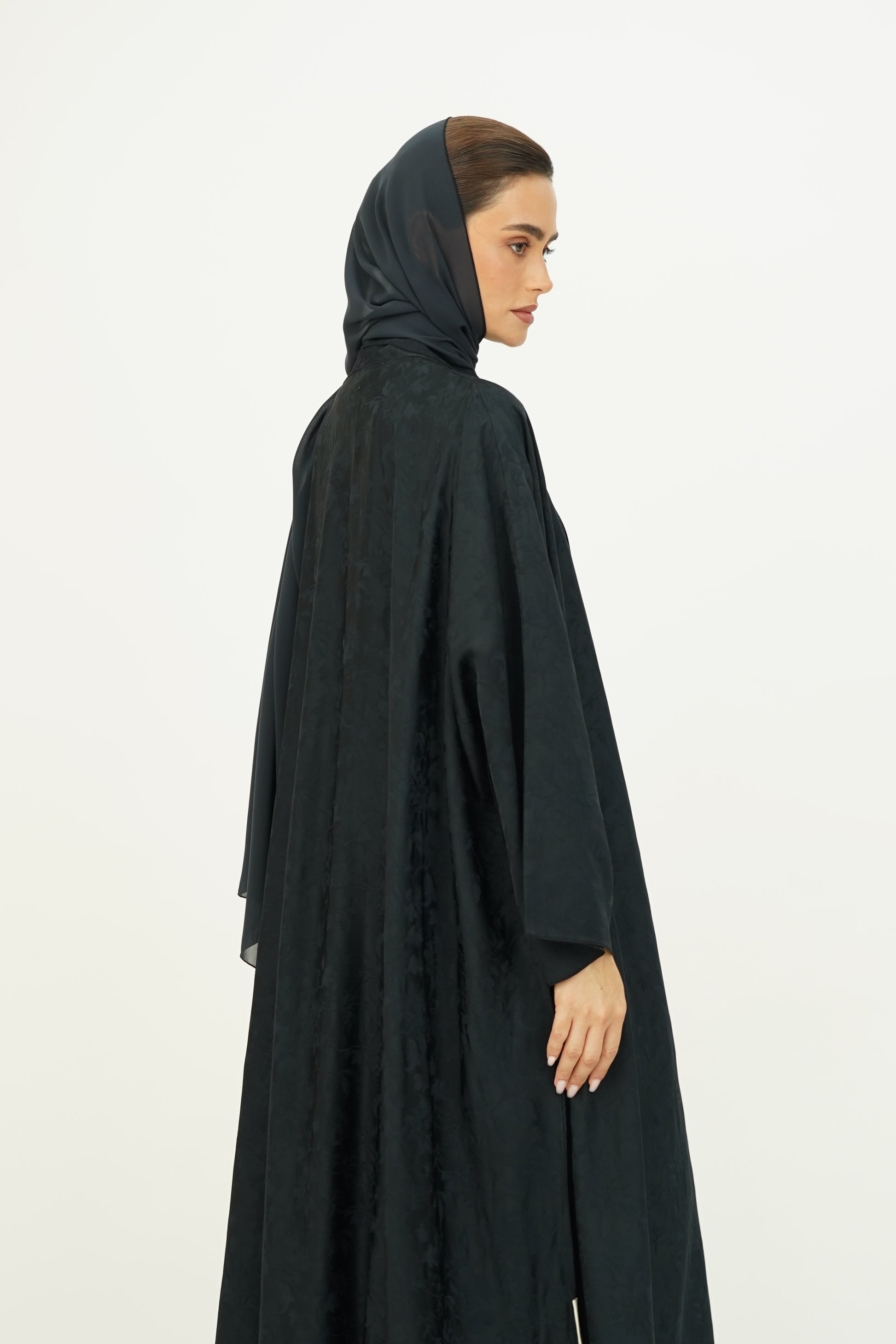 Wide abaya with delicate floral patterns, fine silk embroidery on the edges, and side slits, paired with a sheila adorned with thin embroidery along the borders.