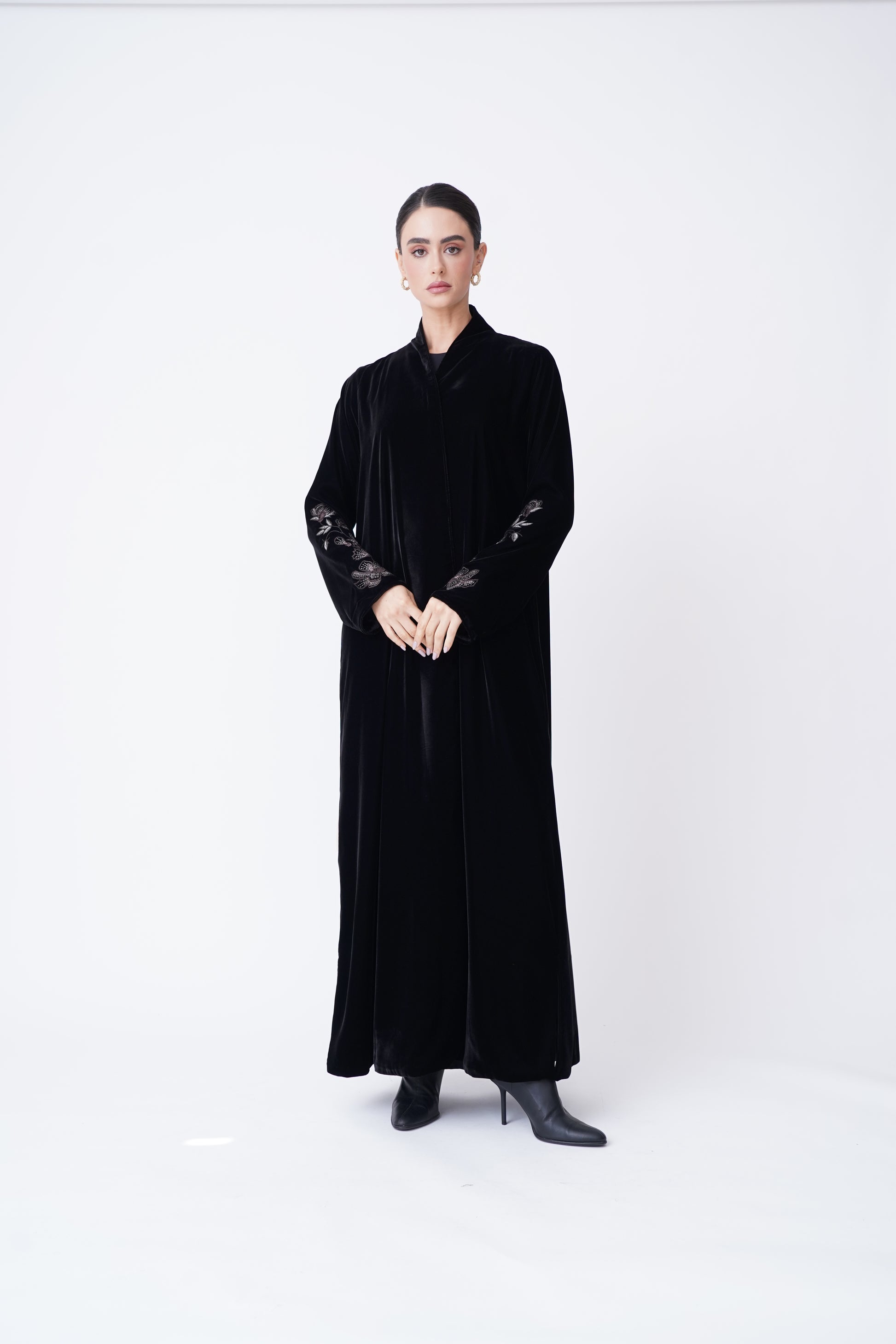 An abaya crafted from black velvet, adorned with delicate handmade floral embroidery on the back and sleeves, expressing luxury in a timeless and elegant style.